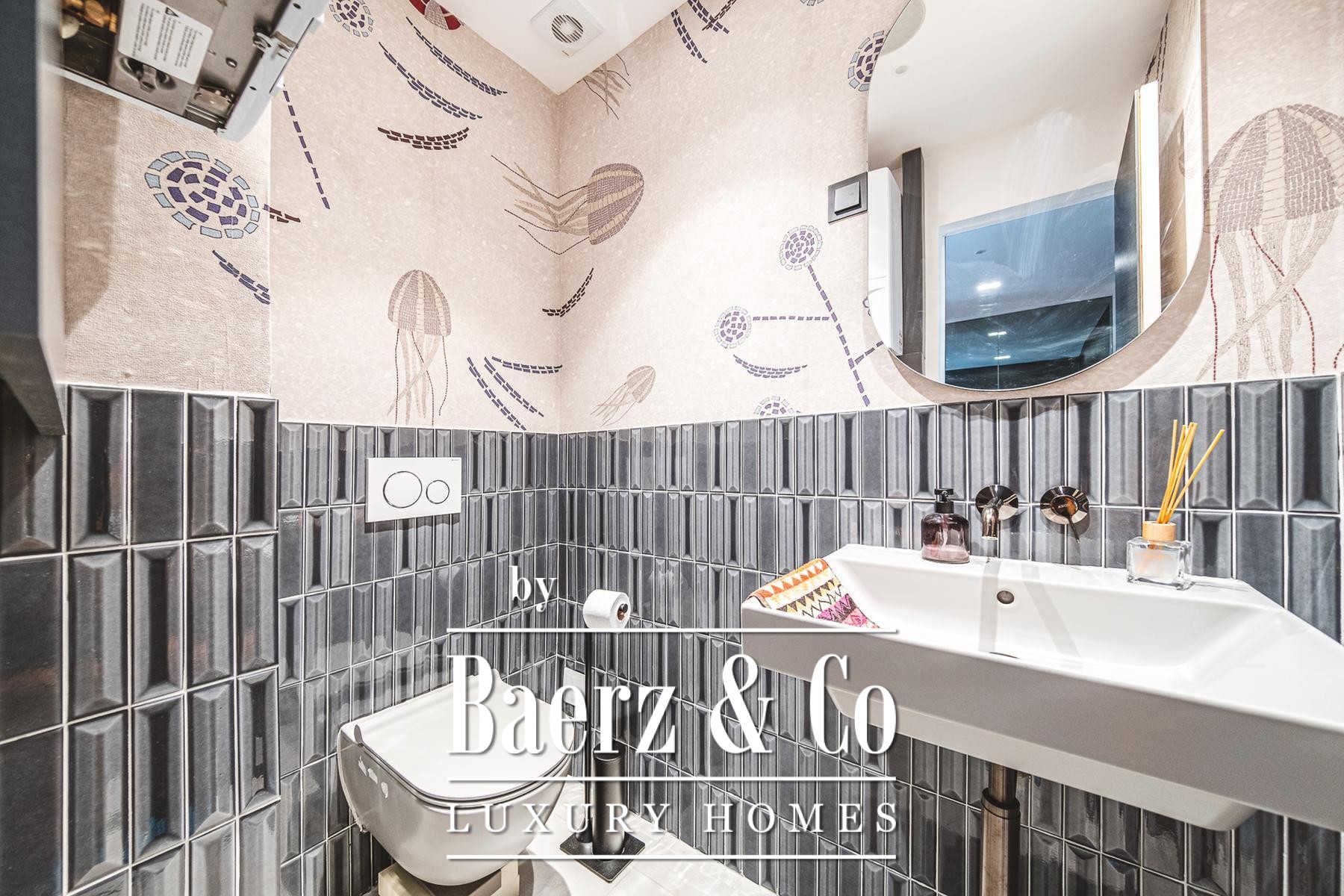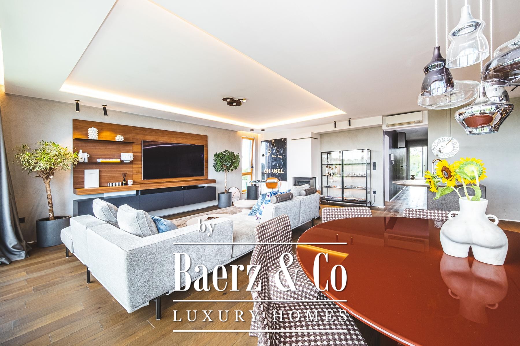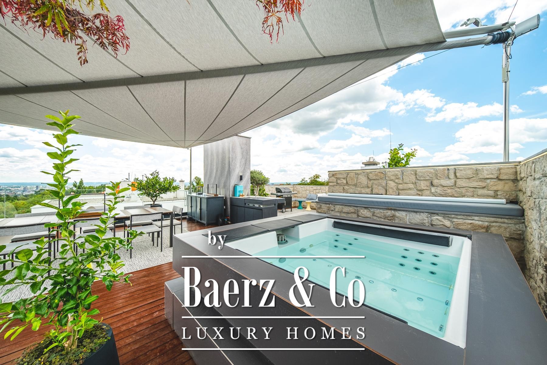 master bathroom, Molteni living room furniture, The Cut kitchen (Italy) with Miele appliances and a Liebherr wine refrigerator, designer chandeliers and a walk-in closet of Italian design, parquet and first-class ceramics from Italy.The special feature of the apartment is a luxurious terrace of 70 m2 equipped with top-quality Talenti garden furniture, a large dining table for 12 people, an outdoor kitchen, an electrically adjustable sail-shaped awning that covers the entire area, a jacuzzi for four people and a spectacular view that provides a complete atmosphere of privacy and enjoyment.Location: