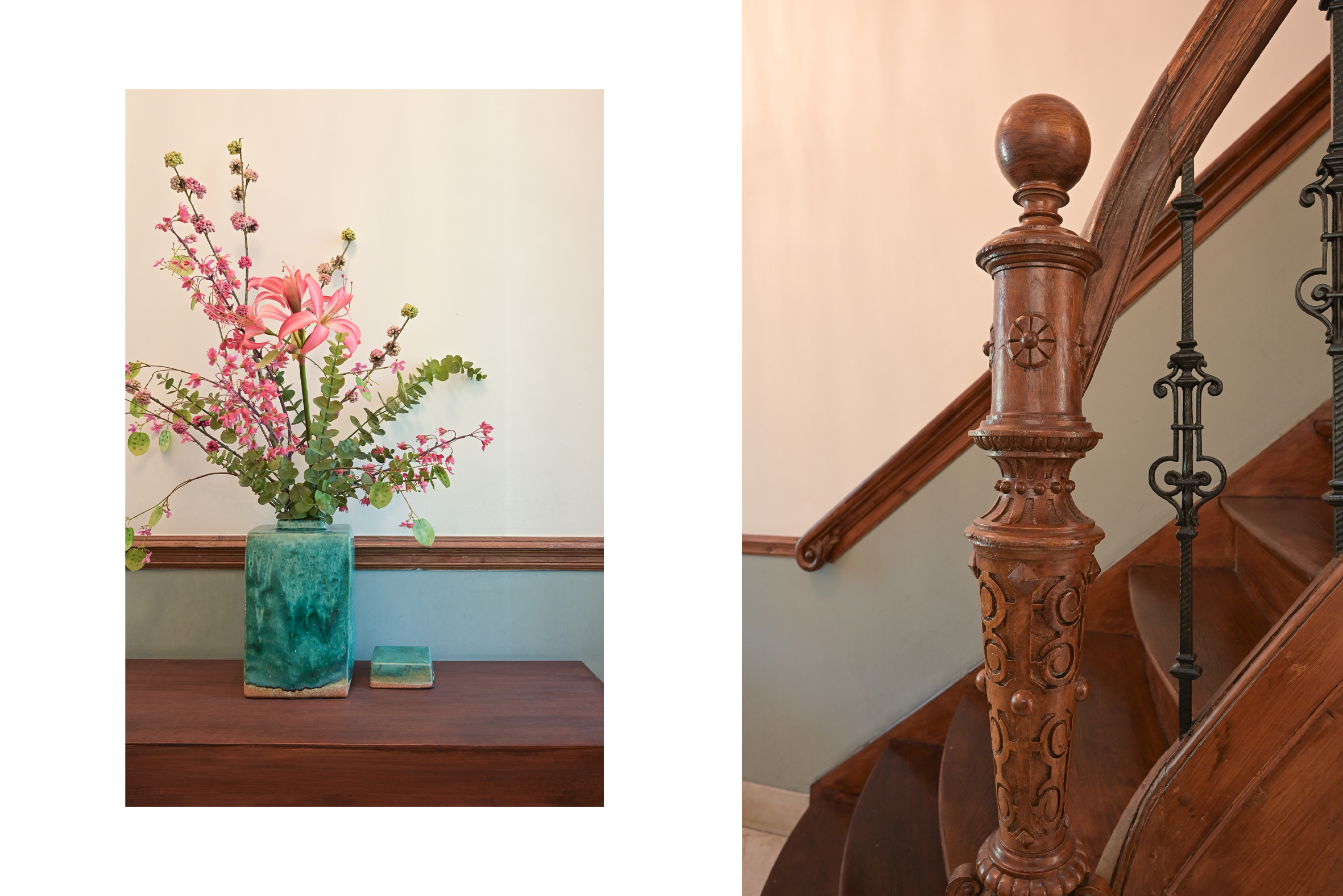 At the top of the stairs is a landing with a separate modern wc. There is a large front room with an unimpeded view and a back room with access to a balcony, both with high moulded ceilings, marble mantels, and fitted wardrobes. A third room, currently in use as a walk-in closet, could function as a study or extra bedroom. The complete modern bathroom, with bath, walk-in shower, double vanity, and heated floors is accessible from both the landing and the back bedroom.