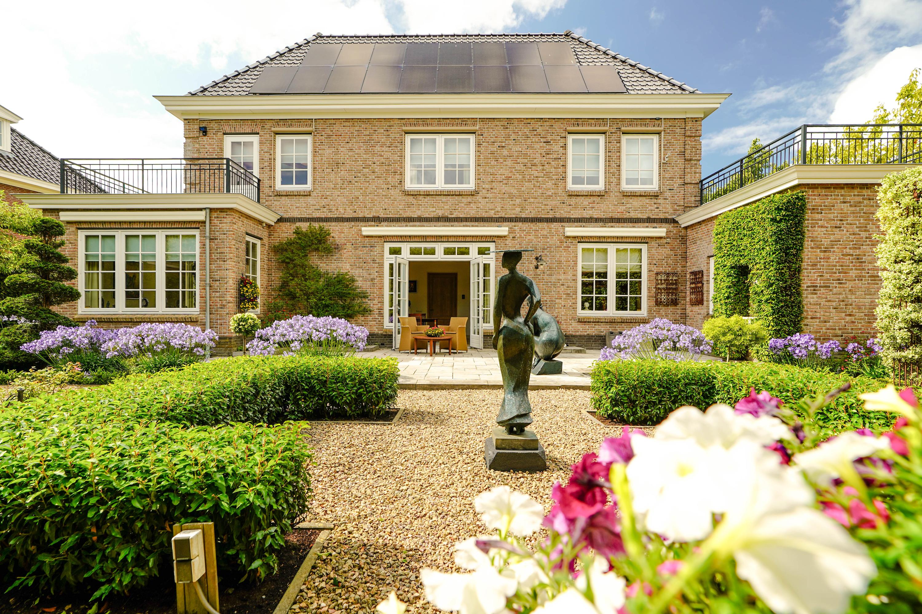 De zeer waardevolle siertuin voegt een bijzondere beleving toe aan het wonen in deze villa. De voortuin, geometrisch aangelegd in klassieke stijl, is een representatieve binnenkomer. De brede zijtuinen langs het huis zijn royaal beplant, met hagen, struiken en bomen. In de achtertuin zorgt een 3,5 meter hoge kraag van 24 wintergroene steeneiken langs de erfafscheiding het hele jaar door voor maximale privacy. Op het terras van 46 m2 is het heerlijk zonnen én feesten. Als het ijzeren prieel 's zomers versierd is met bloemborders, klimrozen en hanging baskets, is het er aangenaam toeven aan de buitentafel. De Franse fontein aan de rechterzijde en het Italiaanse fonteintje aan het terras zijn verfrissende elementen in de zomerse tuin. De bronzen sculpturen zijn apart te koop.