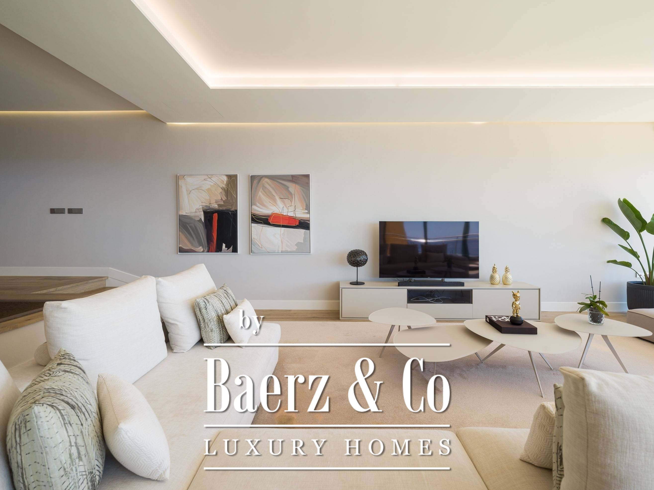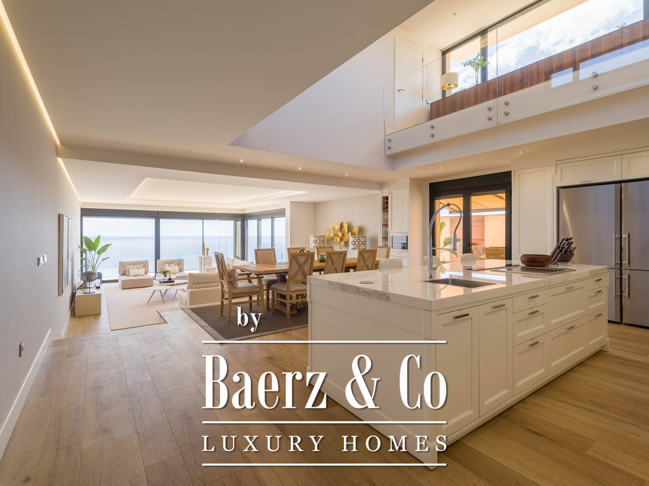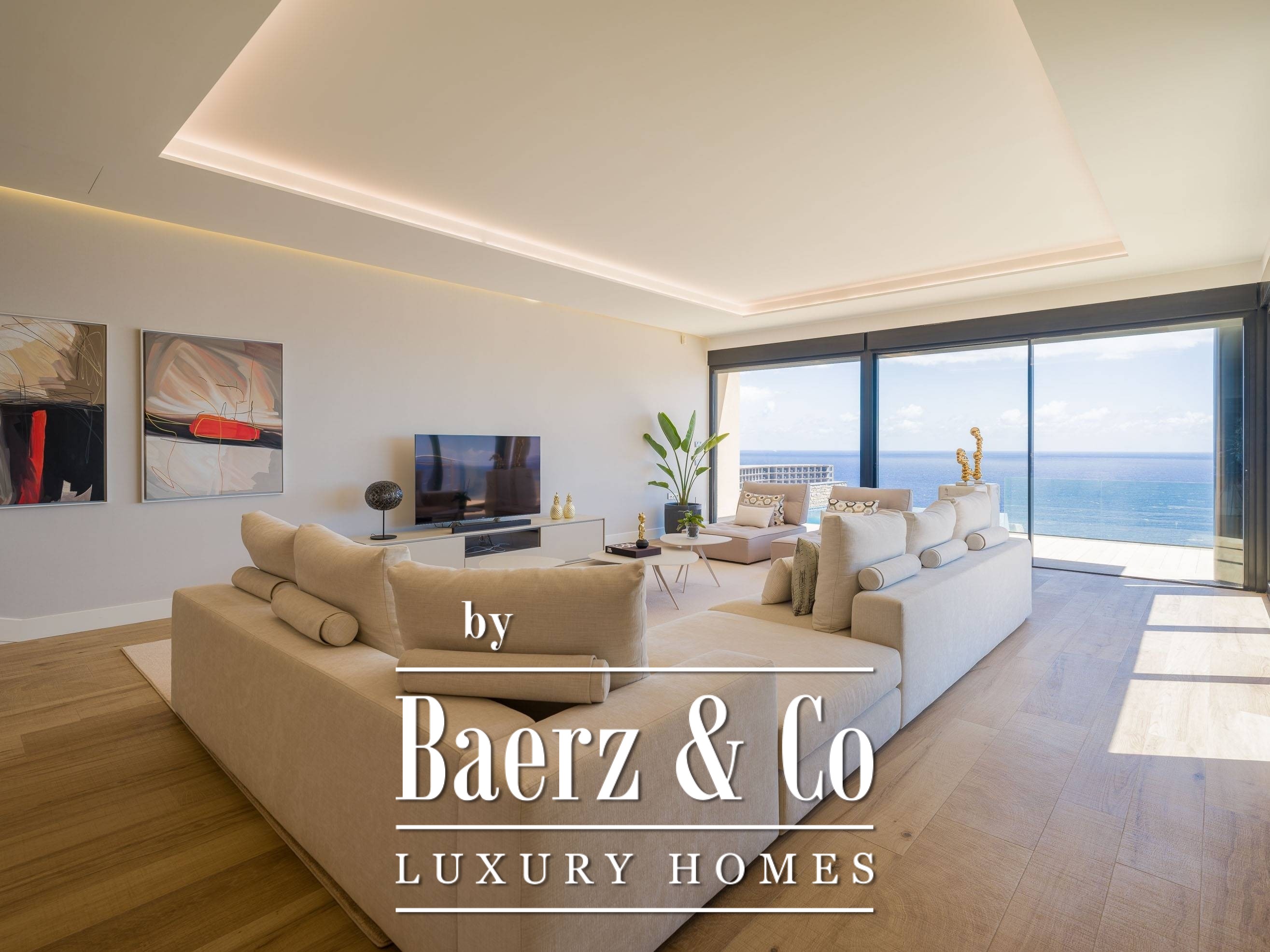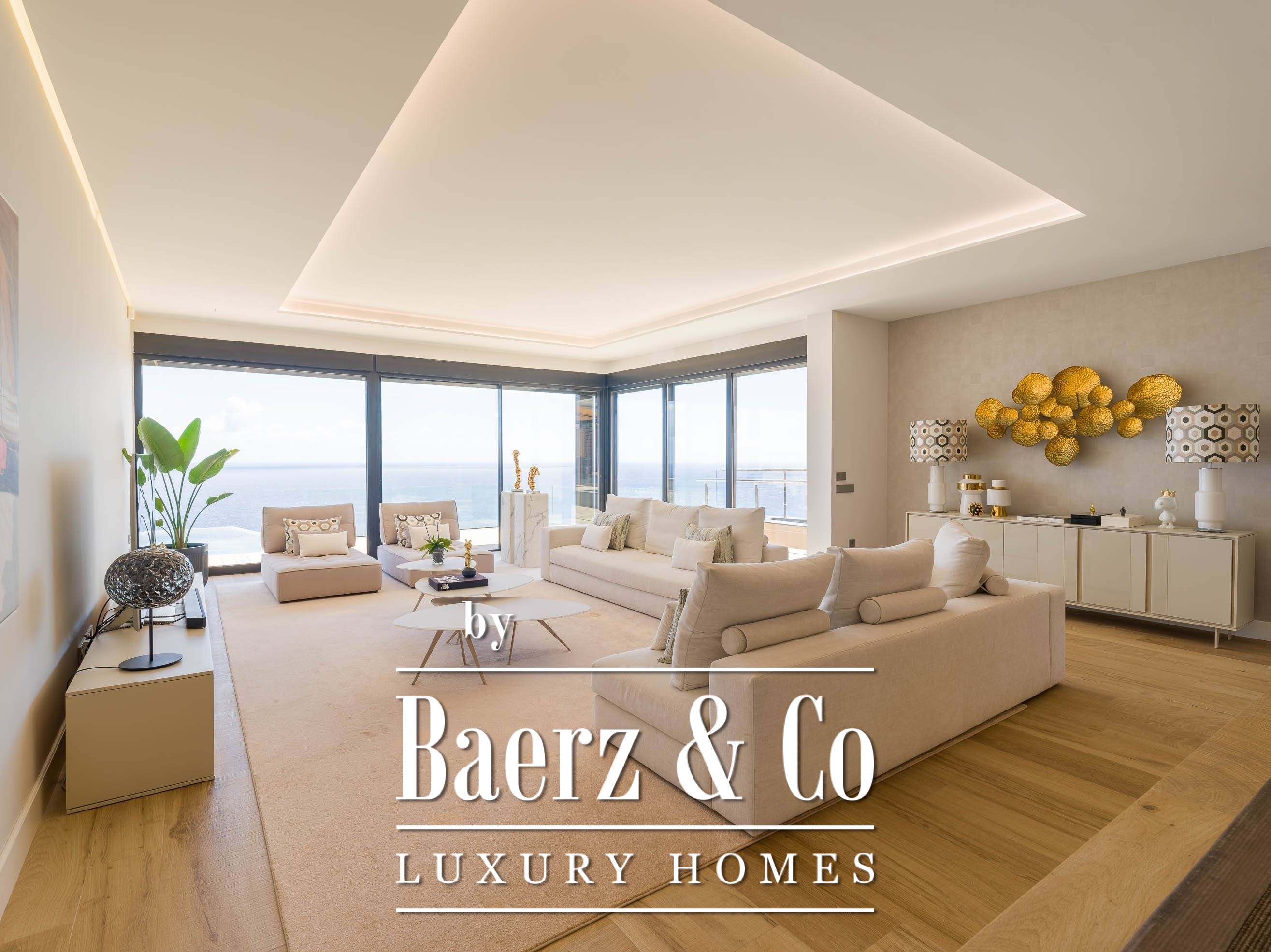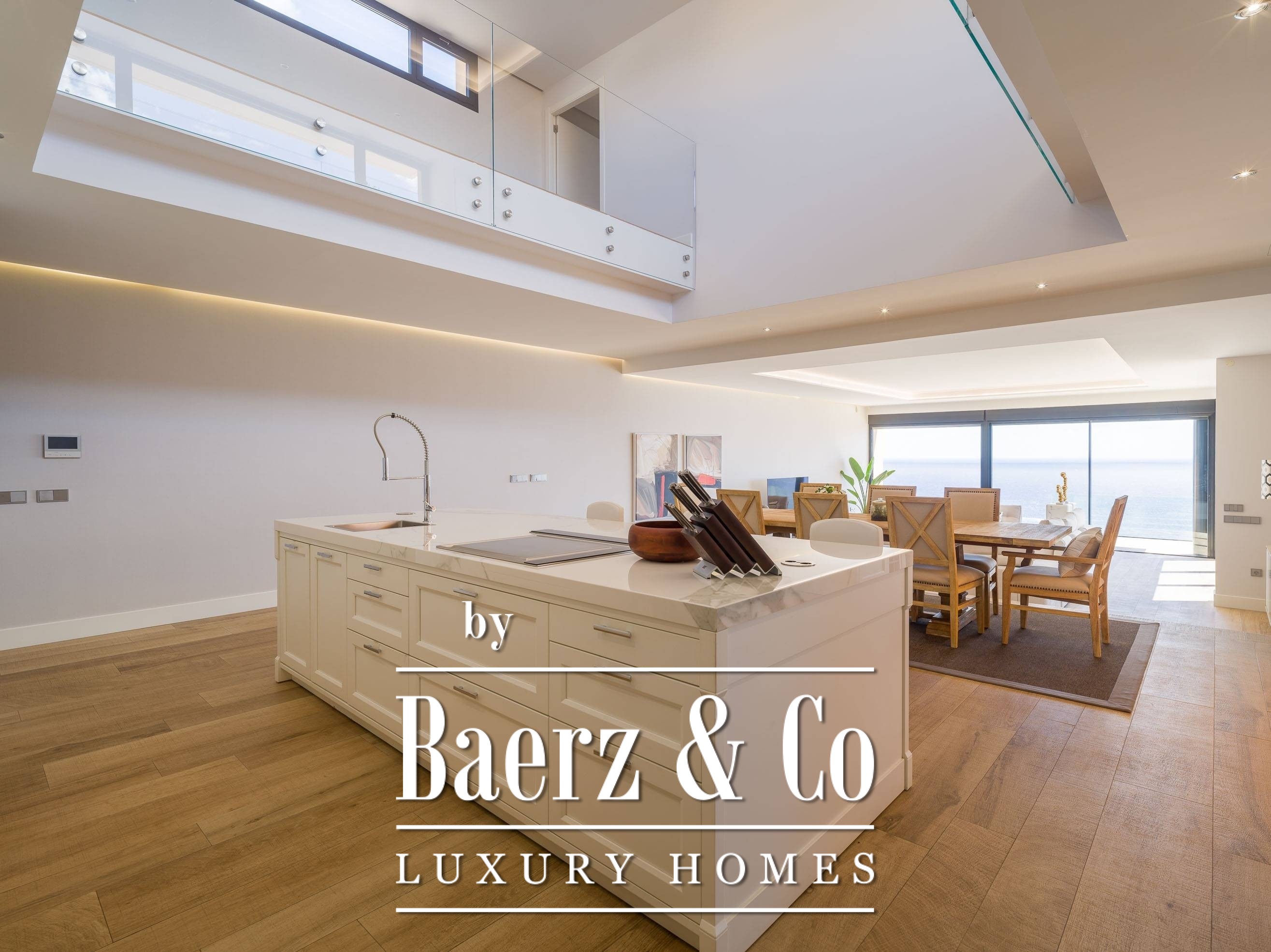 Moving to the ground floor, a wide open-plan living space draws one toward the panorama. Glass walls frame the ocean, while the living and dining areas flow into a modern kitchen centered by a substantial island. An elegant office, a double bedroom, contemporary bathroom, laundry, and utility rooms complete this floor, spanning 228 m².