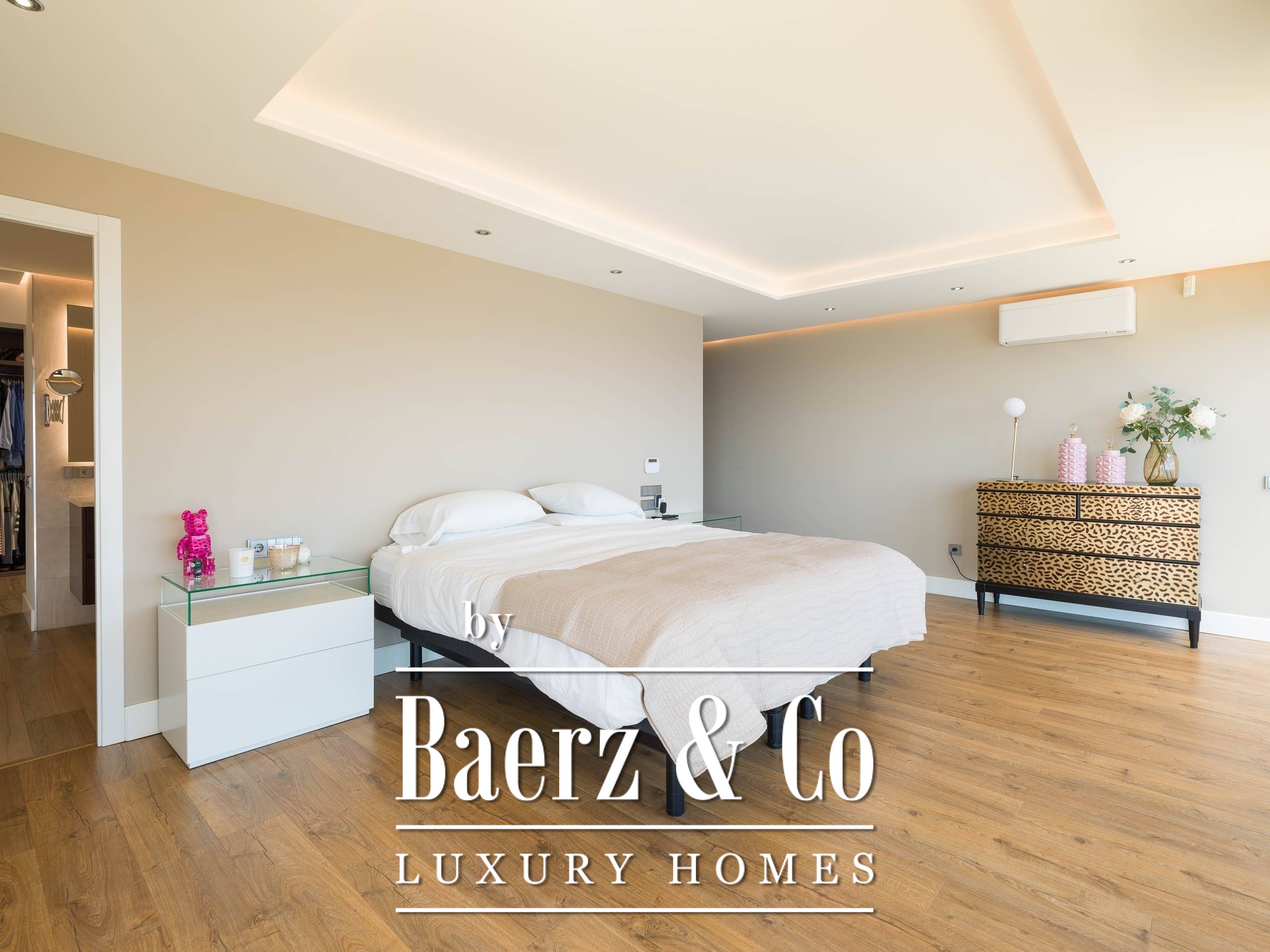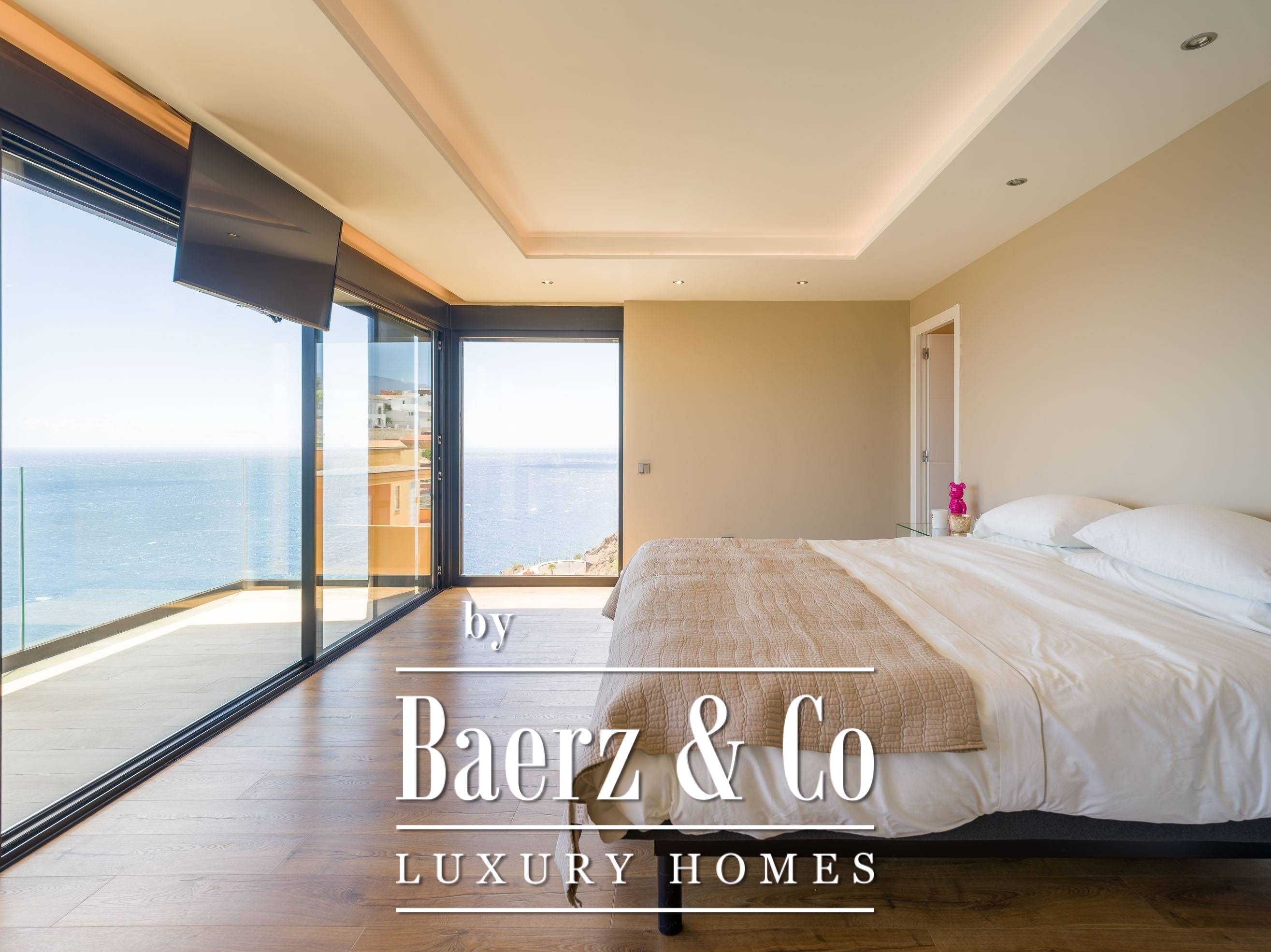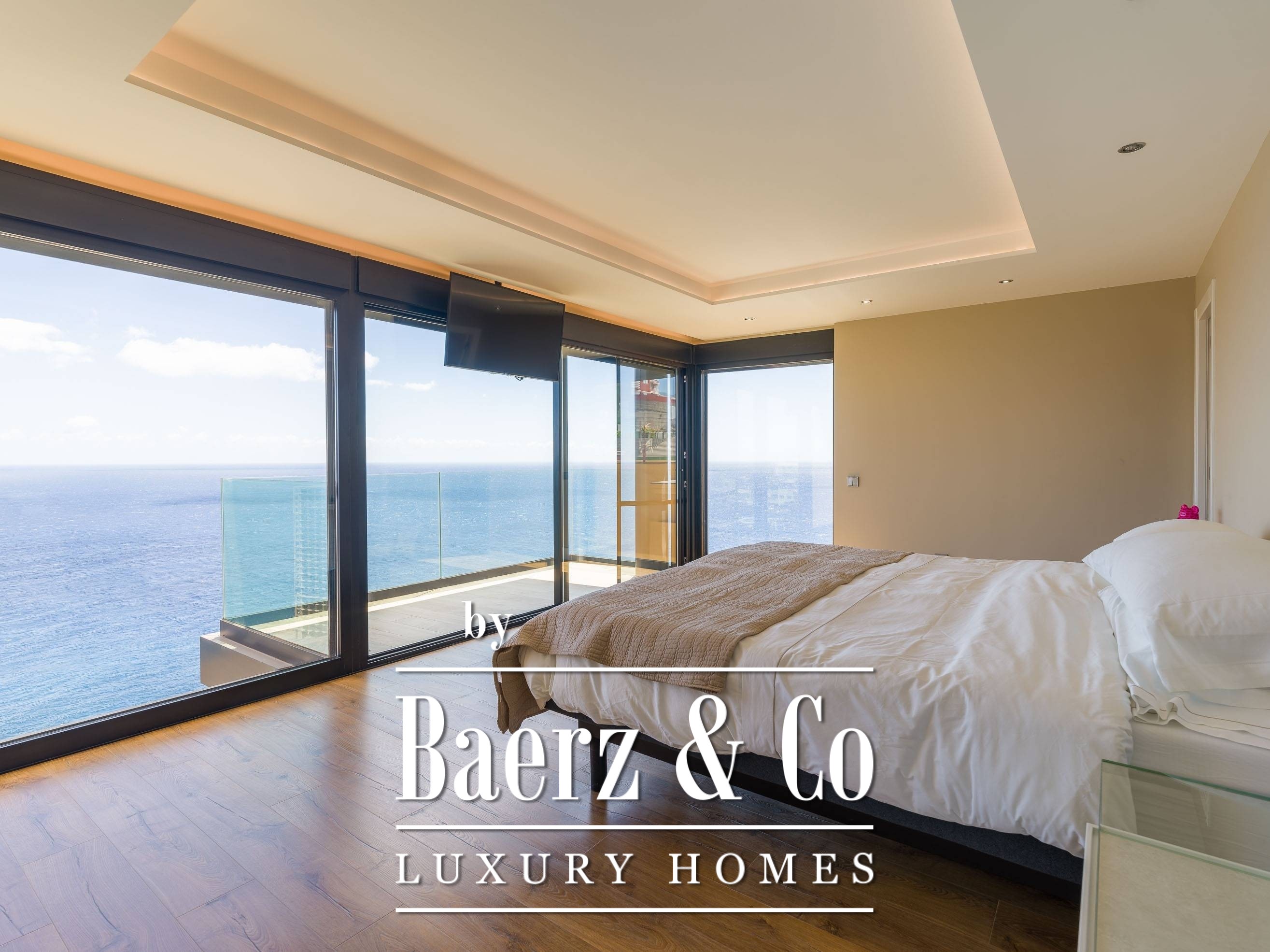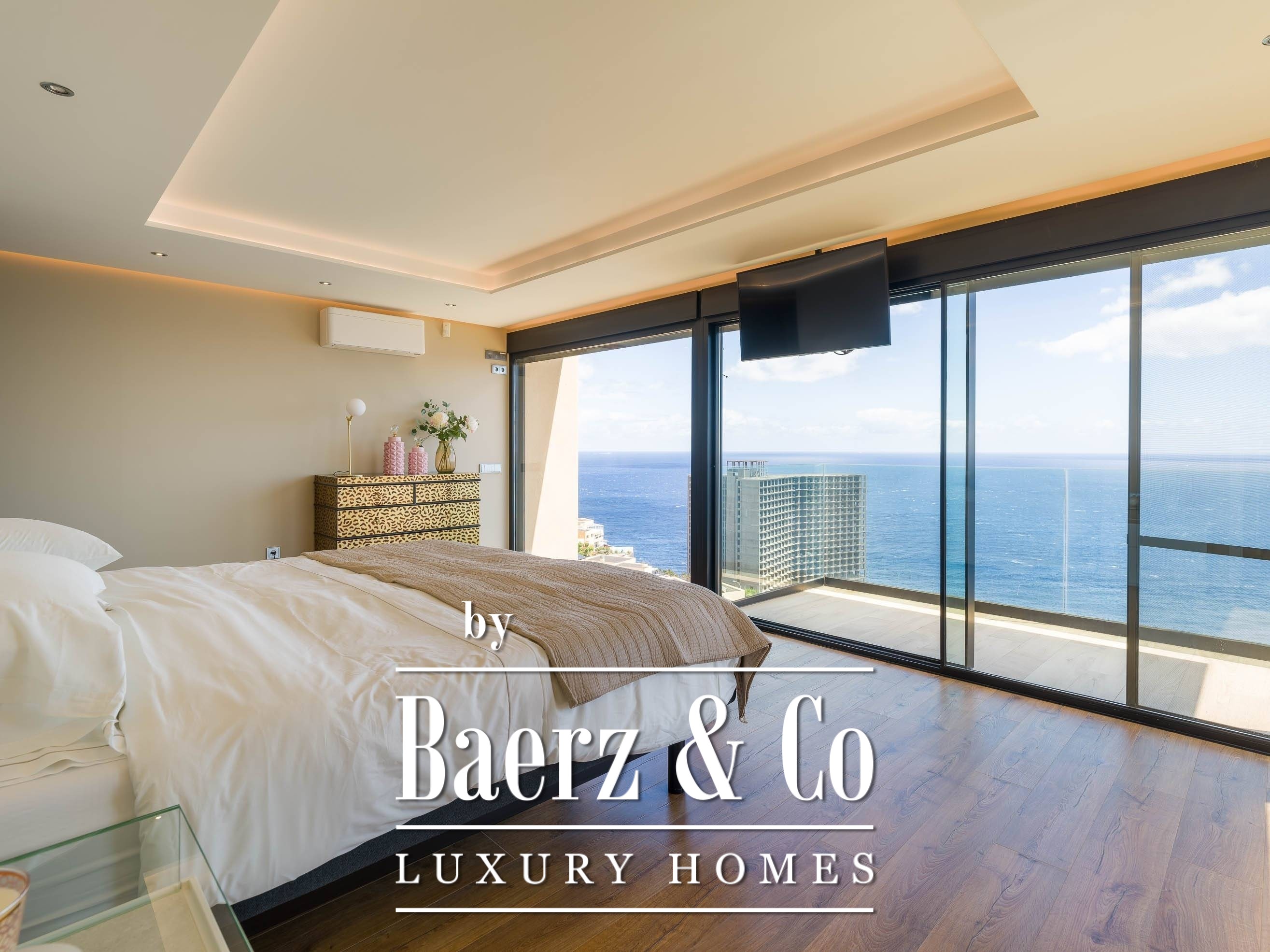 Above, four en-suite bedrooms—each with fitted wardrobes and air conditioning—promise restorative privacy. The master suite offers a dressing room and private bathroom set against a backdrop of sea and sky. Terraces and manicured gardens surround the home, anchored by an infinity swimming pool where horizon and water merge.