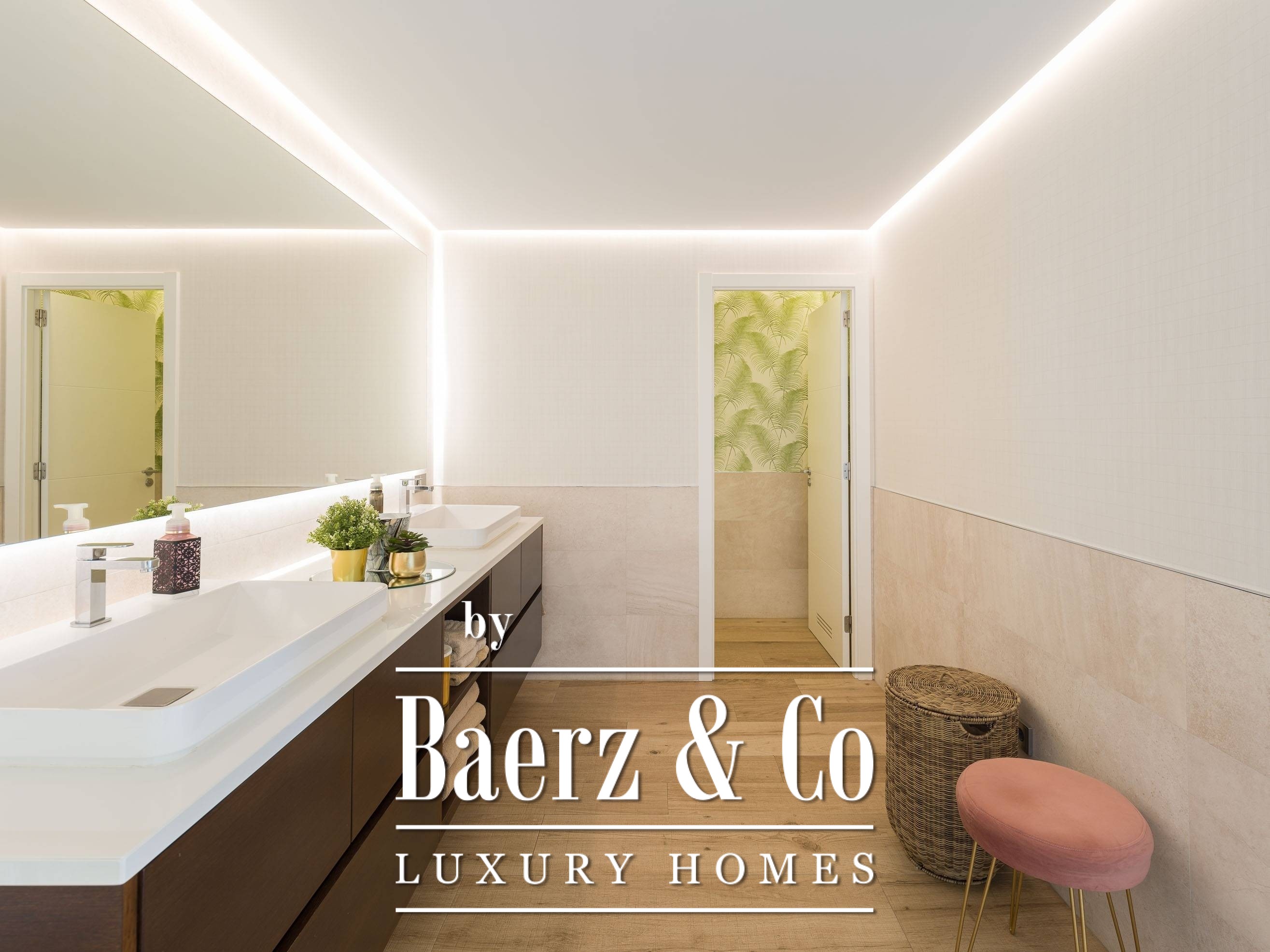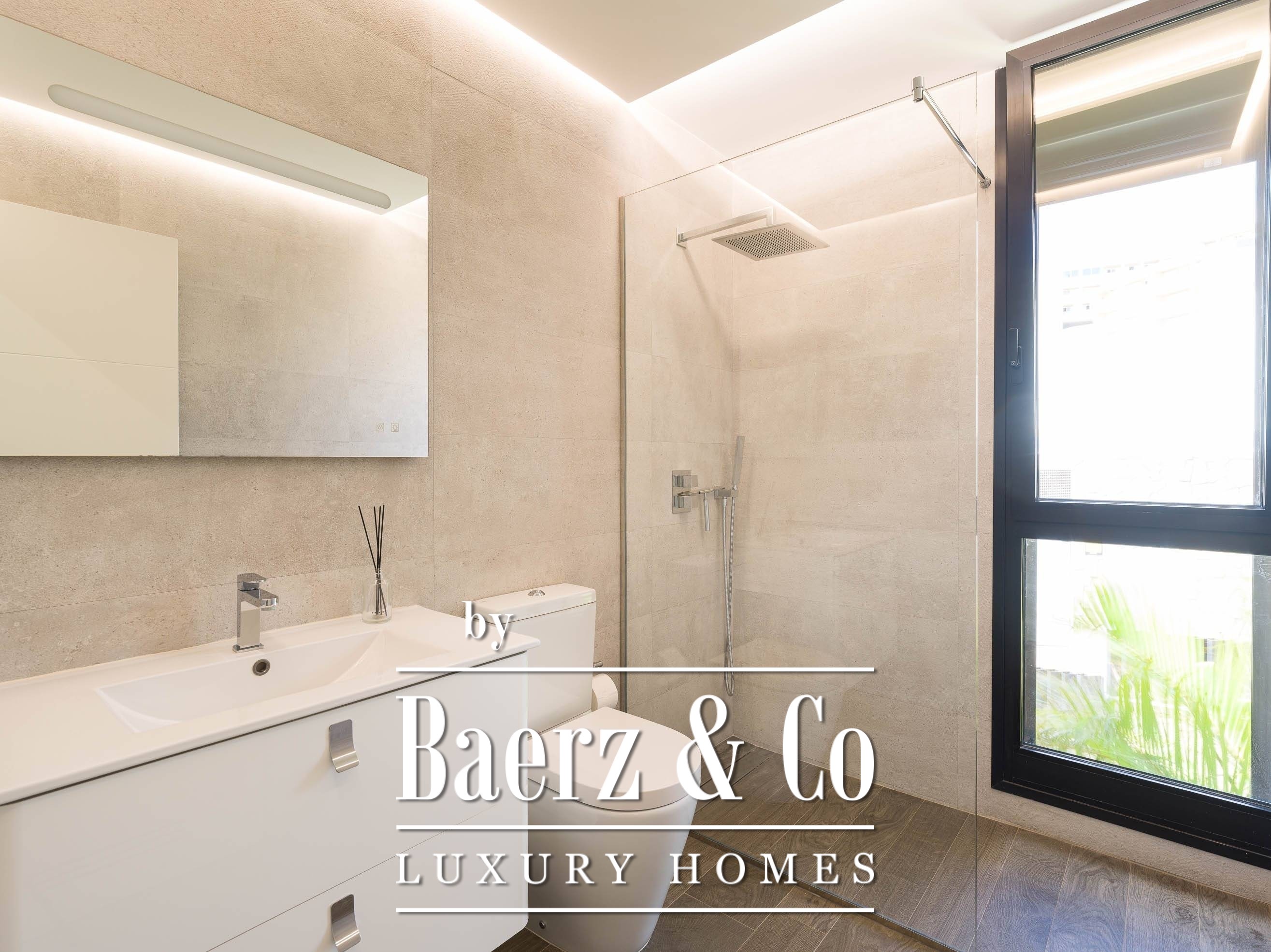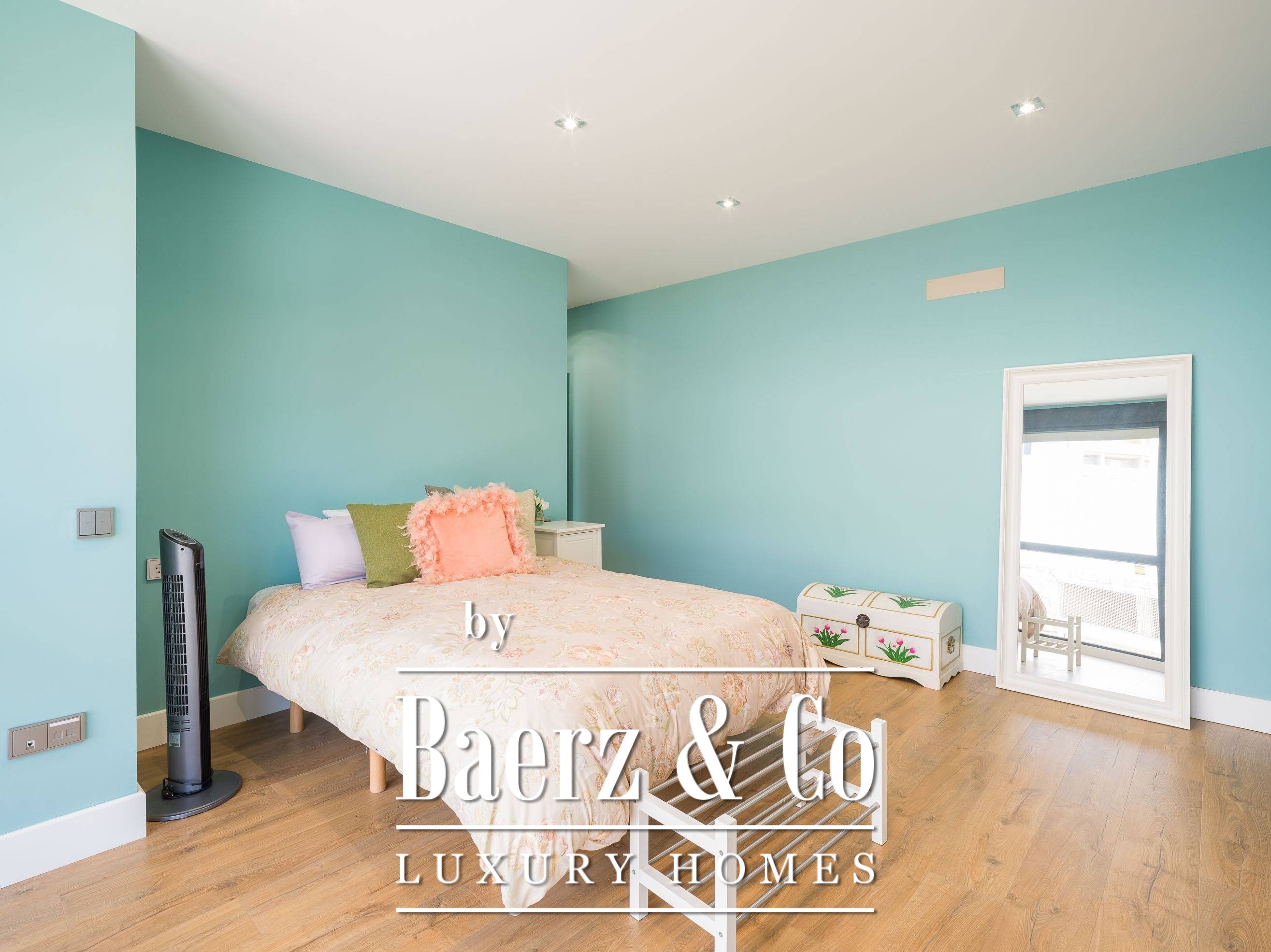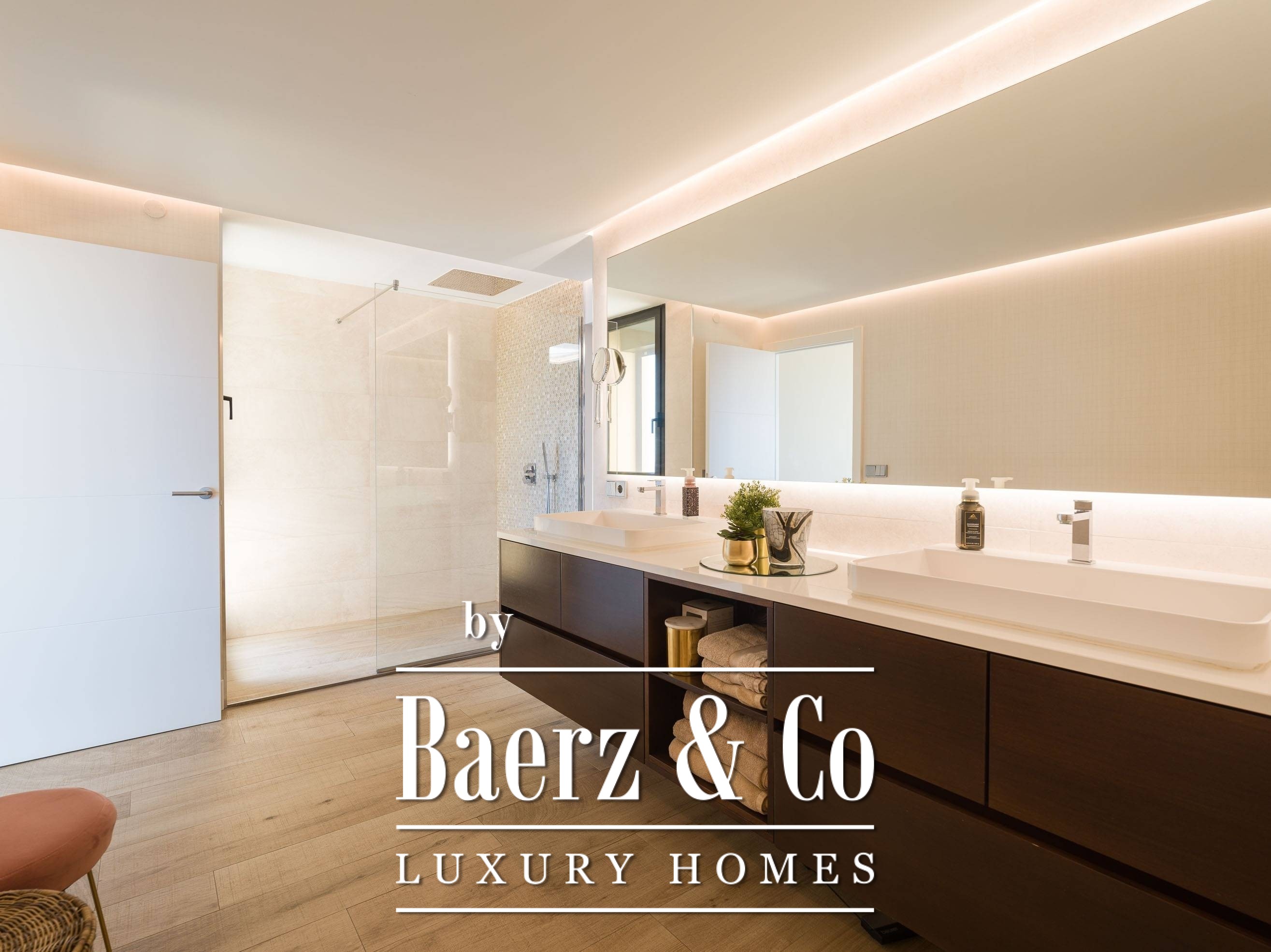 Above, four en-suite bedrooms—each with fitted wardrobes and air conditioning—promise restorative privacy. The master suite offers a dressing room and private bathroom set against a backdrop of sea and sky. Terraces and manicured gardens surround the home, anchored by an infinity swimming pool where horizon and water merge.