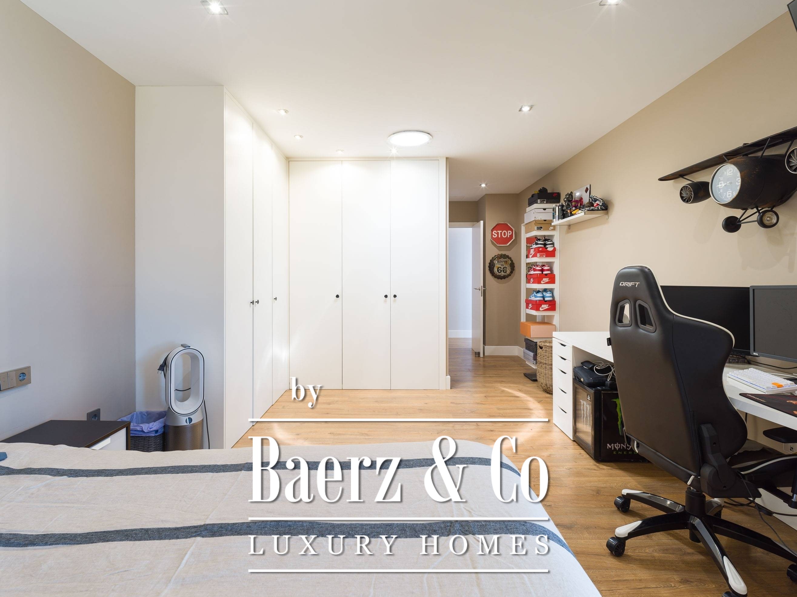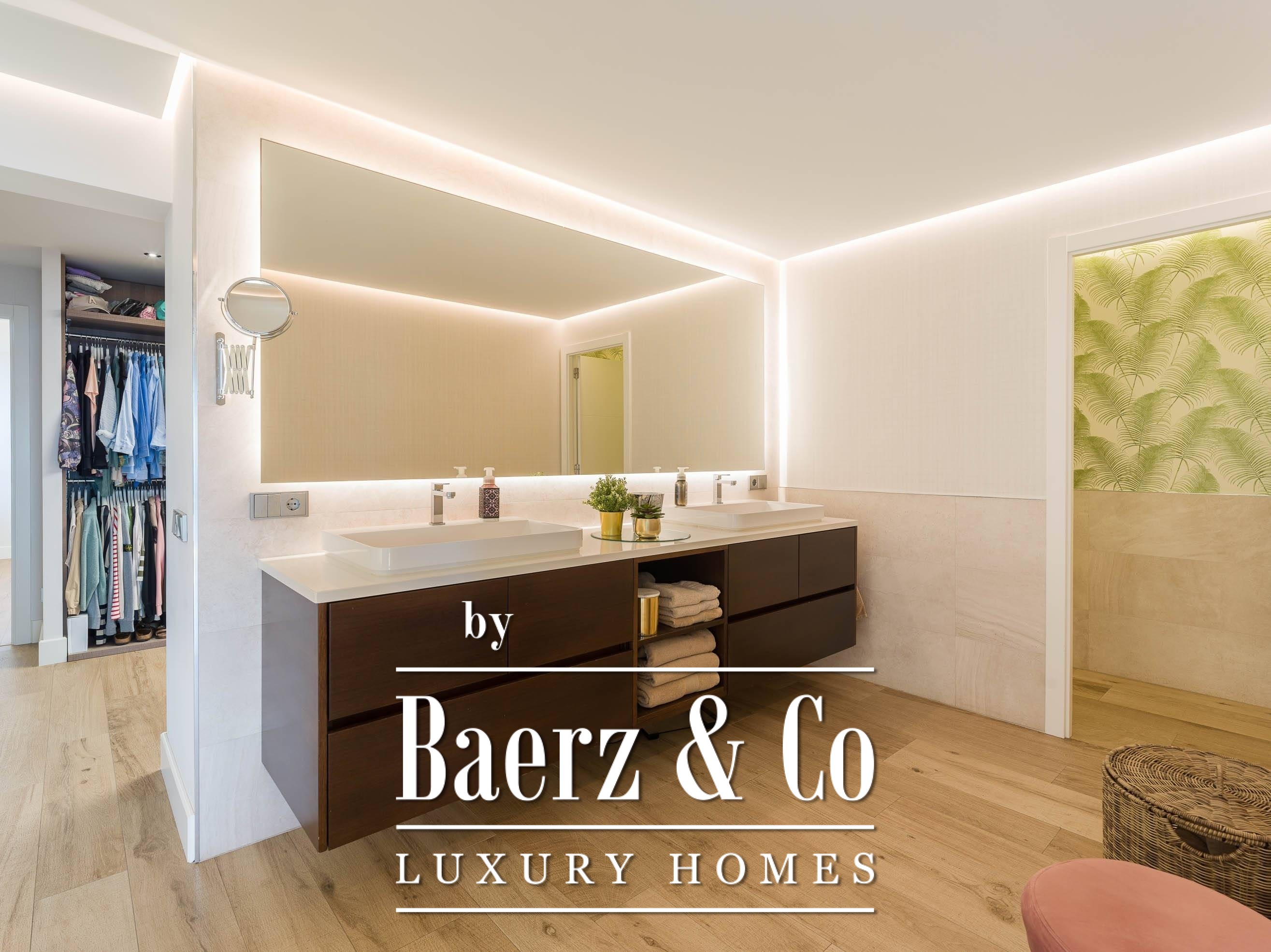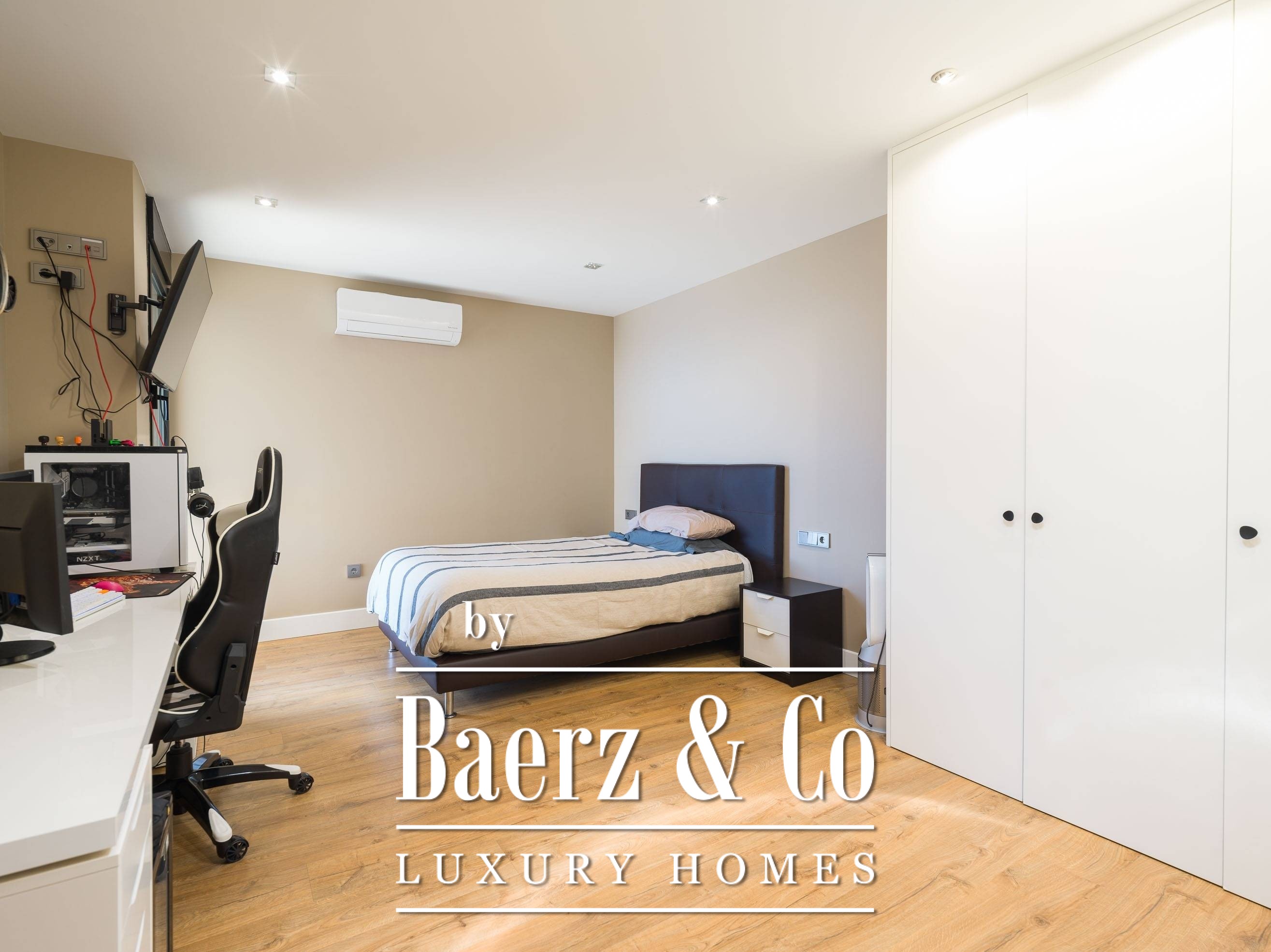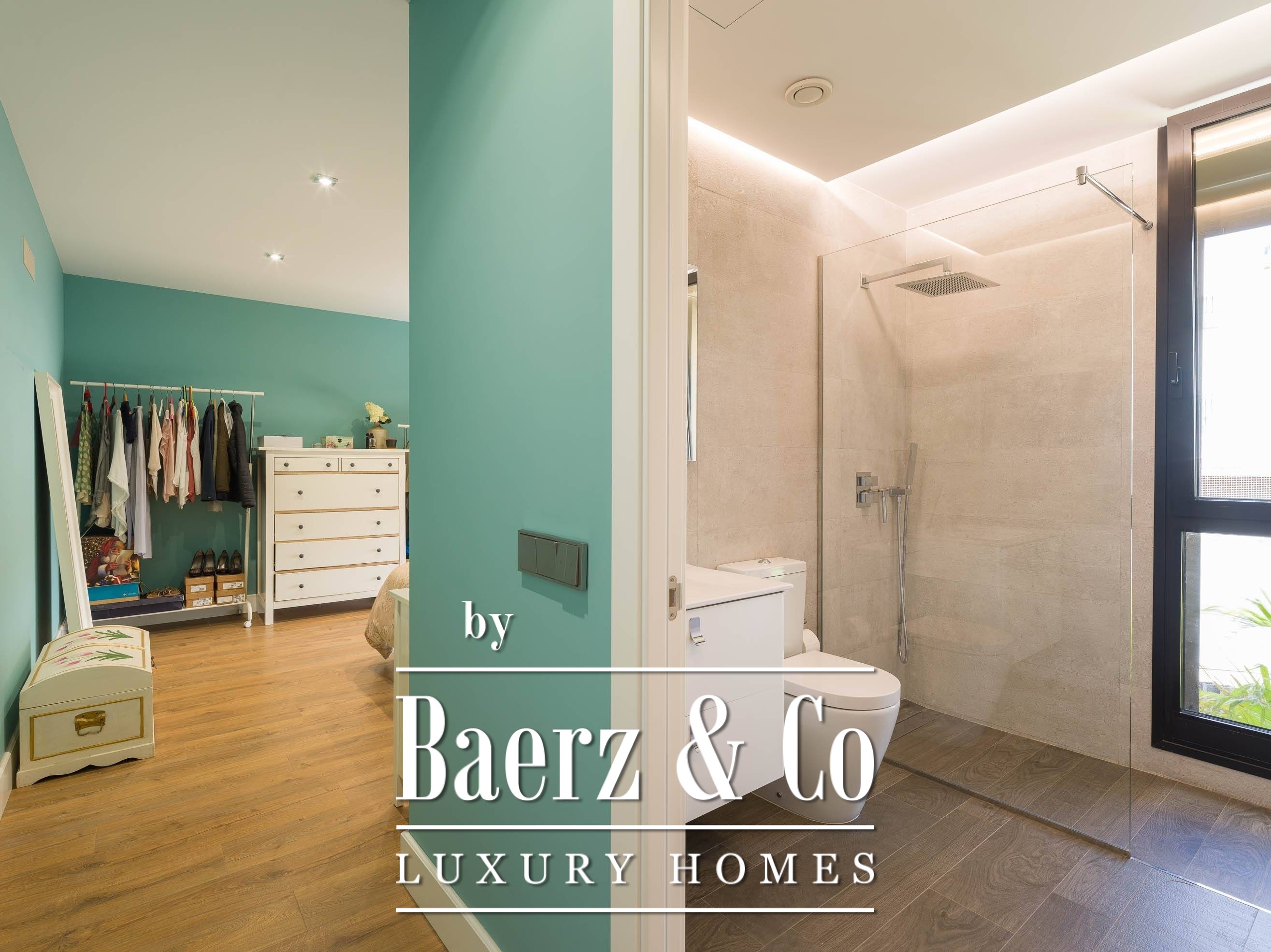 Above, four en-suite bedrooms—each with fitted wardrobes and air conditioning—promise restorative privacy. The master suite offers a dressing room and private bathroom set against a backdrop of sea and sky. Terraces and manicured gardens surround the home, anchored by an infinity swimming pool where horizon and water merge.