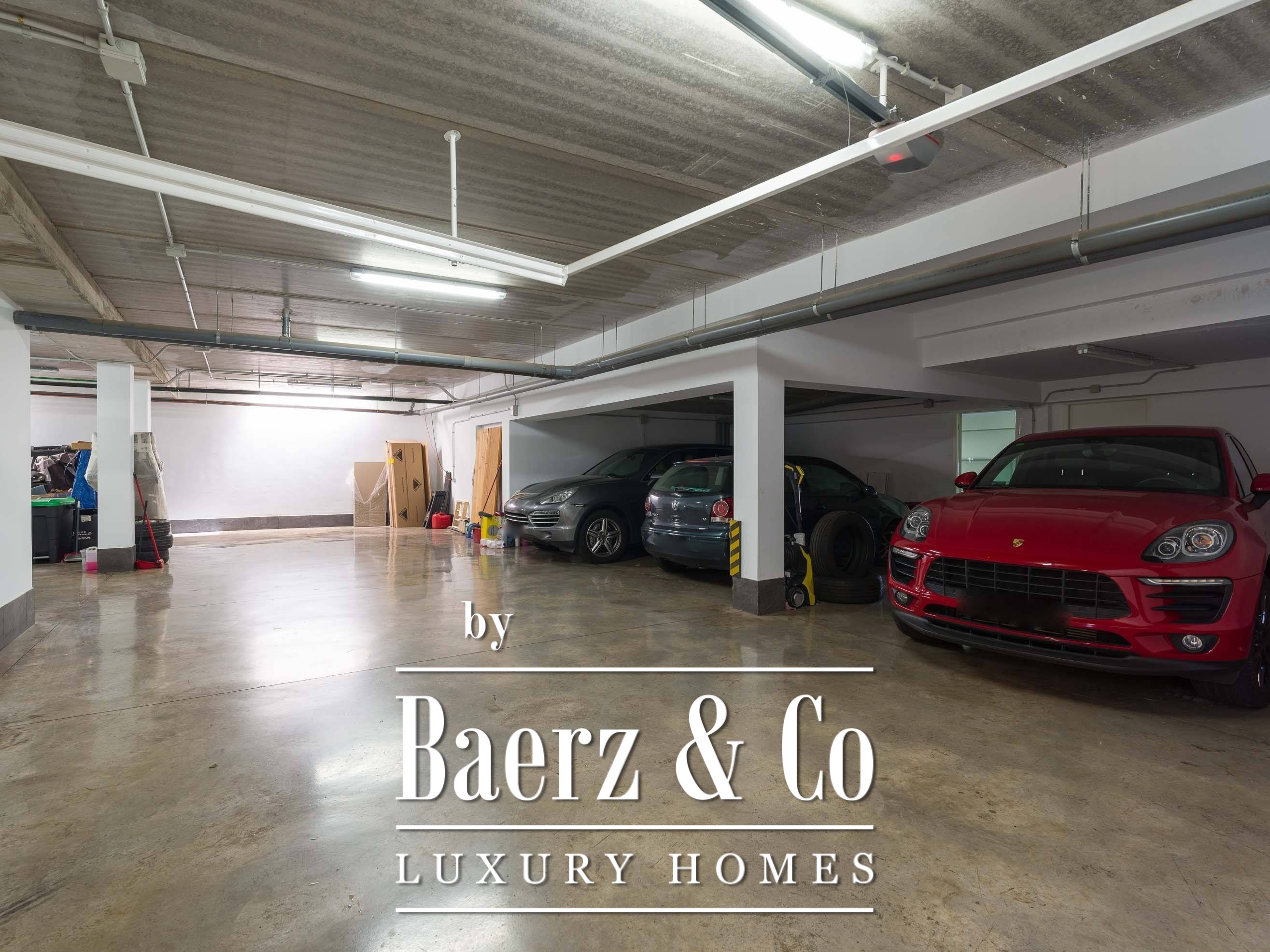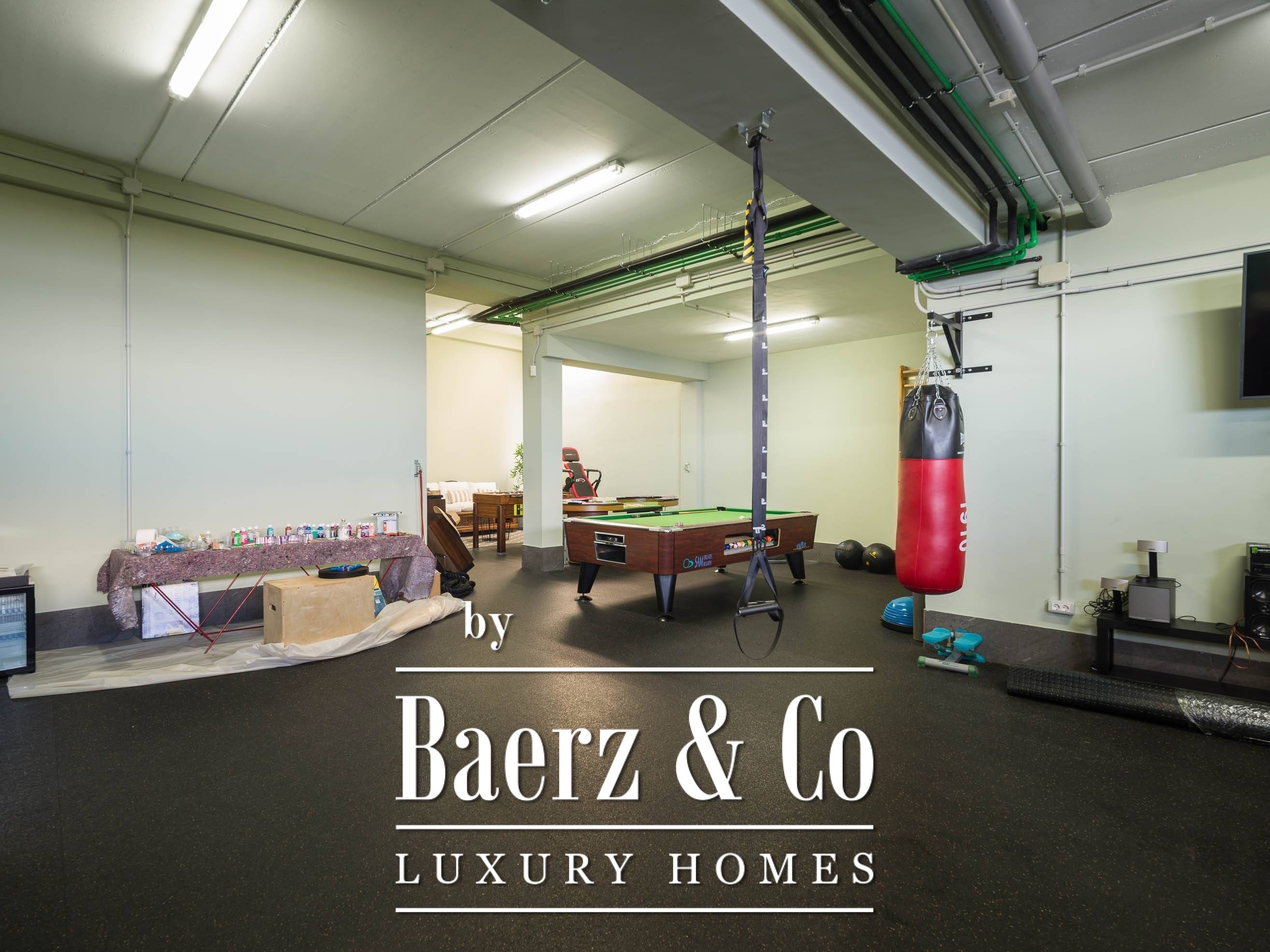 The 590 m² interior unfolds across three distinct levels. The basement level spans 365 m², accommodating a garage for five cars, a full gym, playroom, sleeping area, and a bathroom. Generous skylights and windows usher natural daylight into every room, softly illuminating quiet corners designed for pause and renewal.