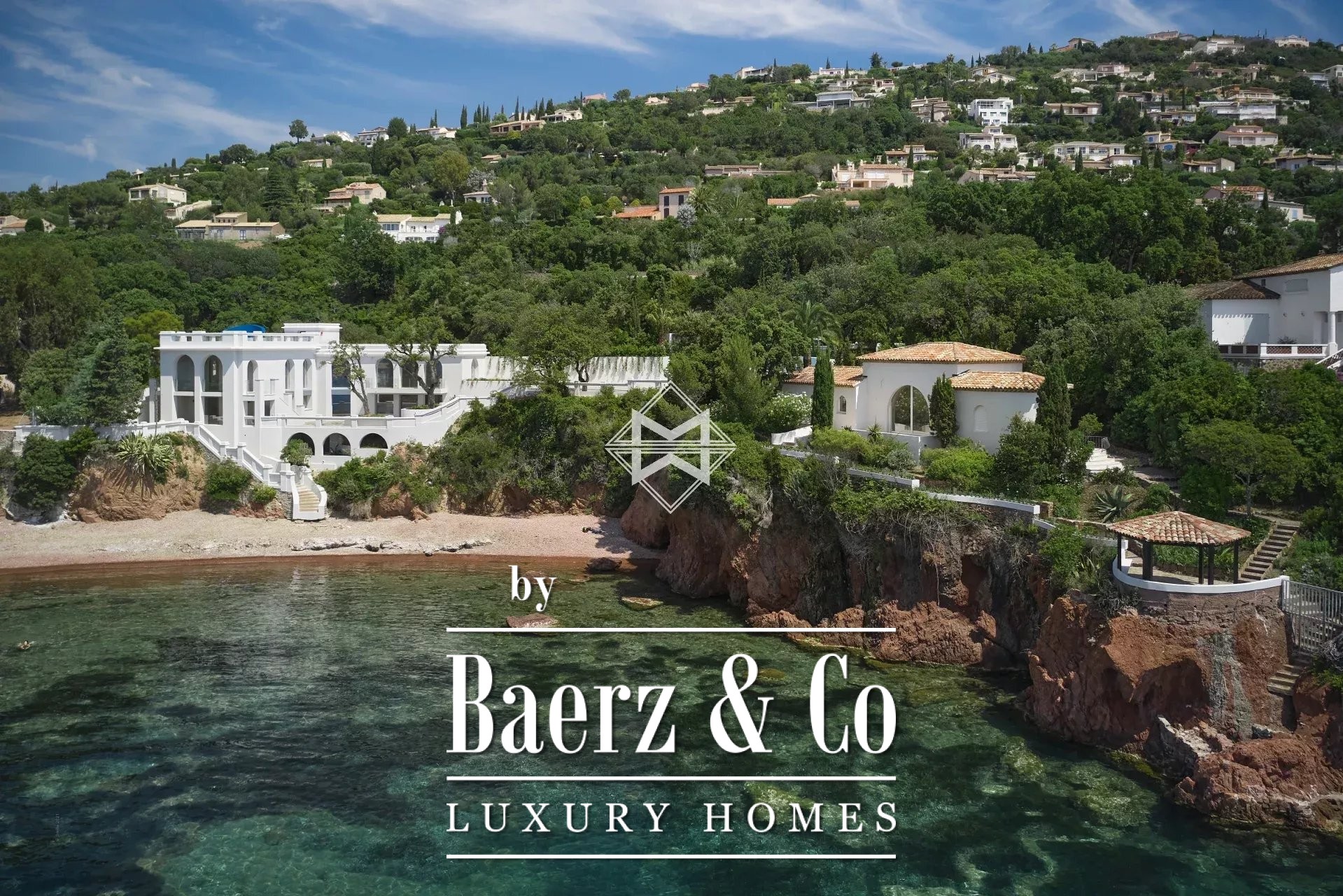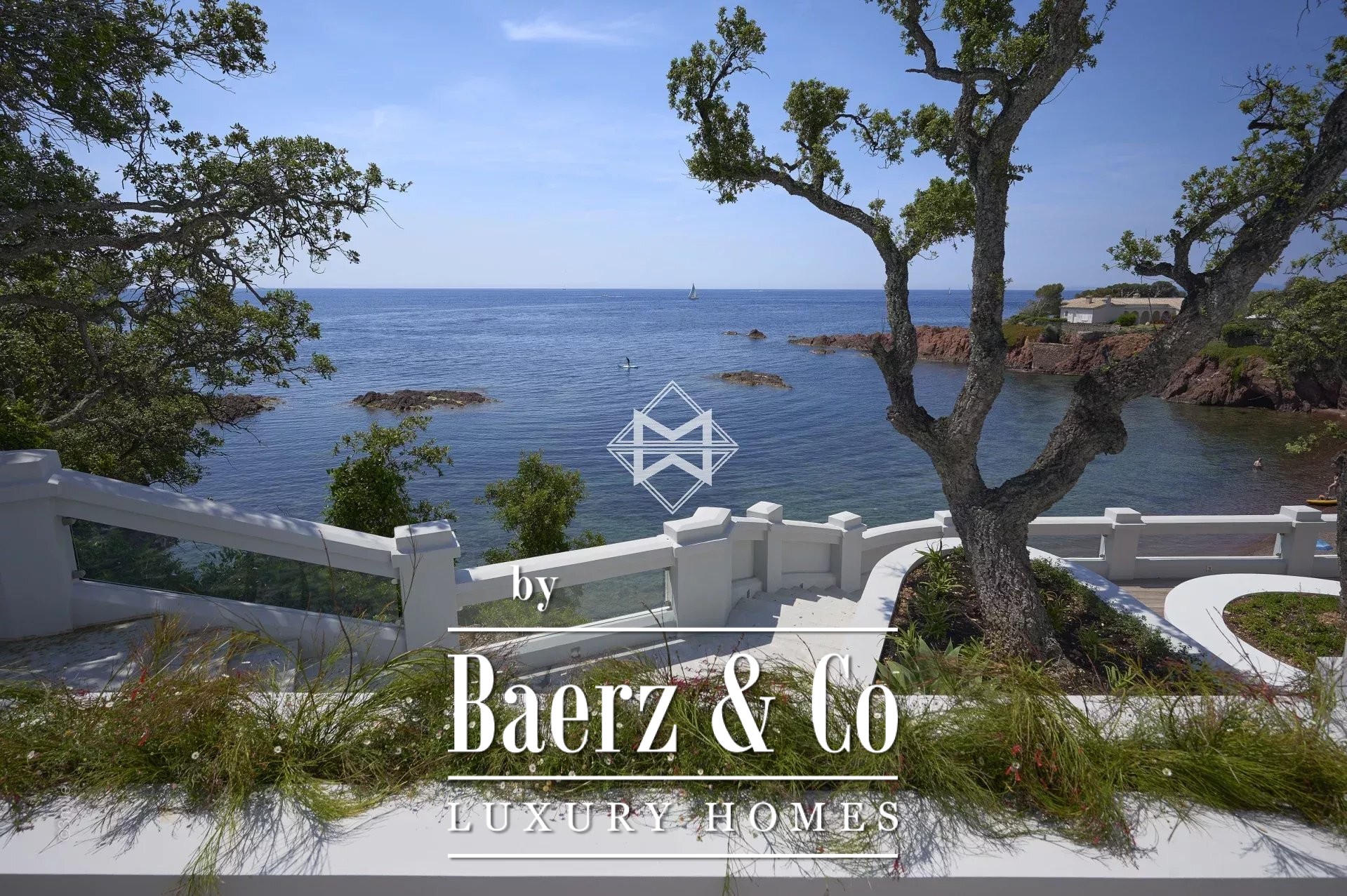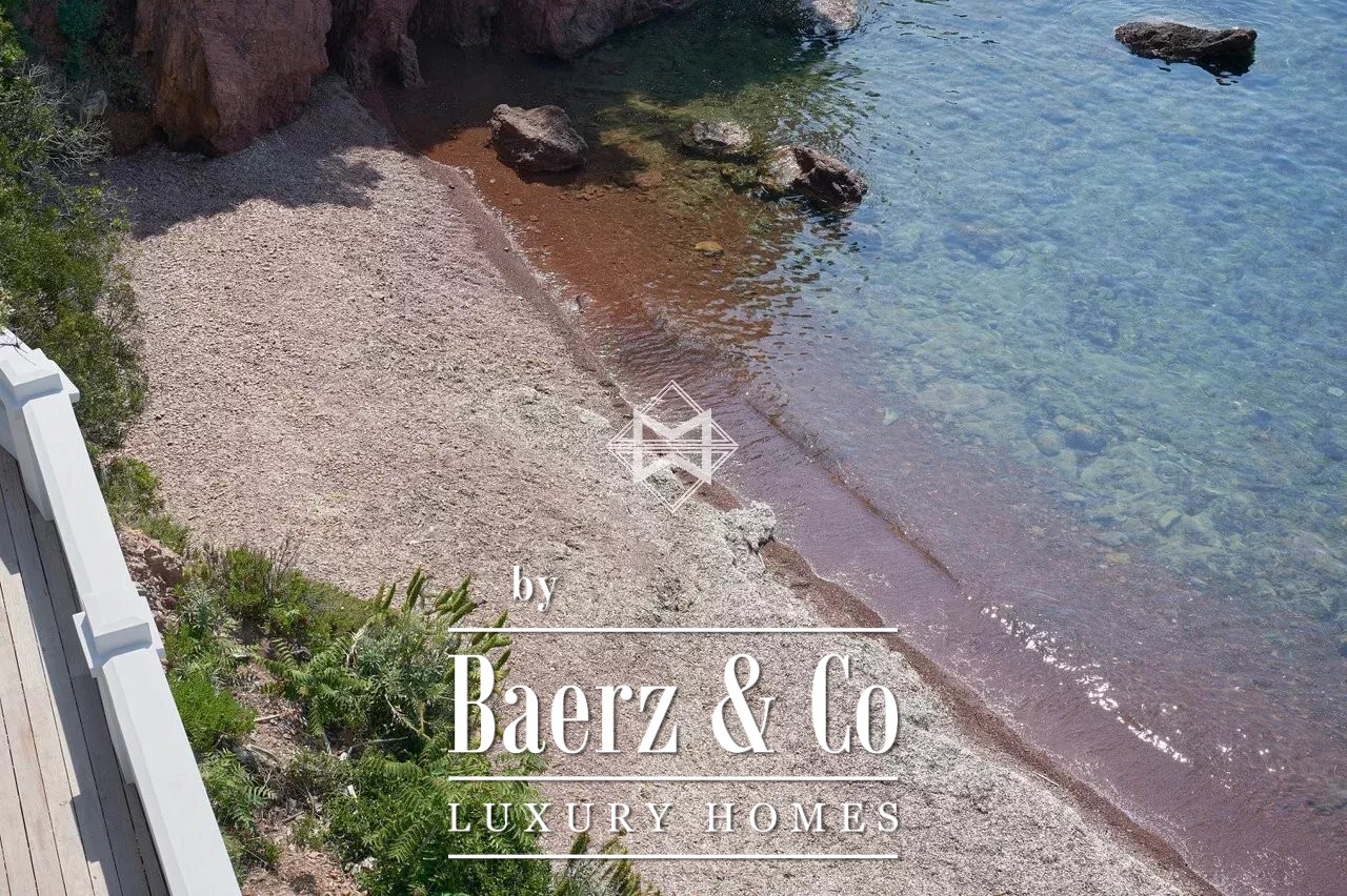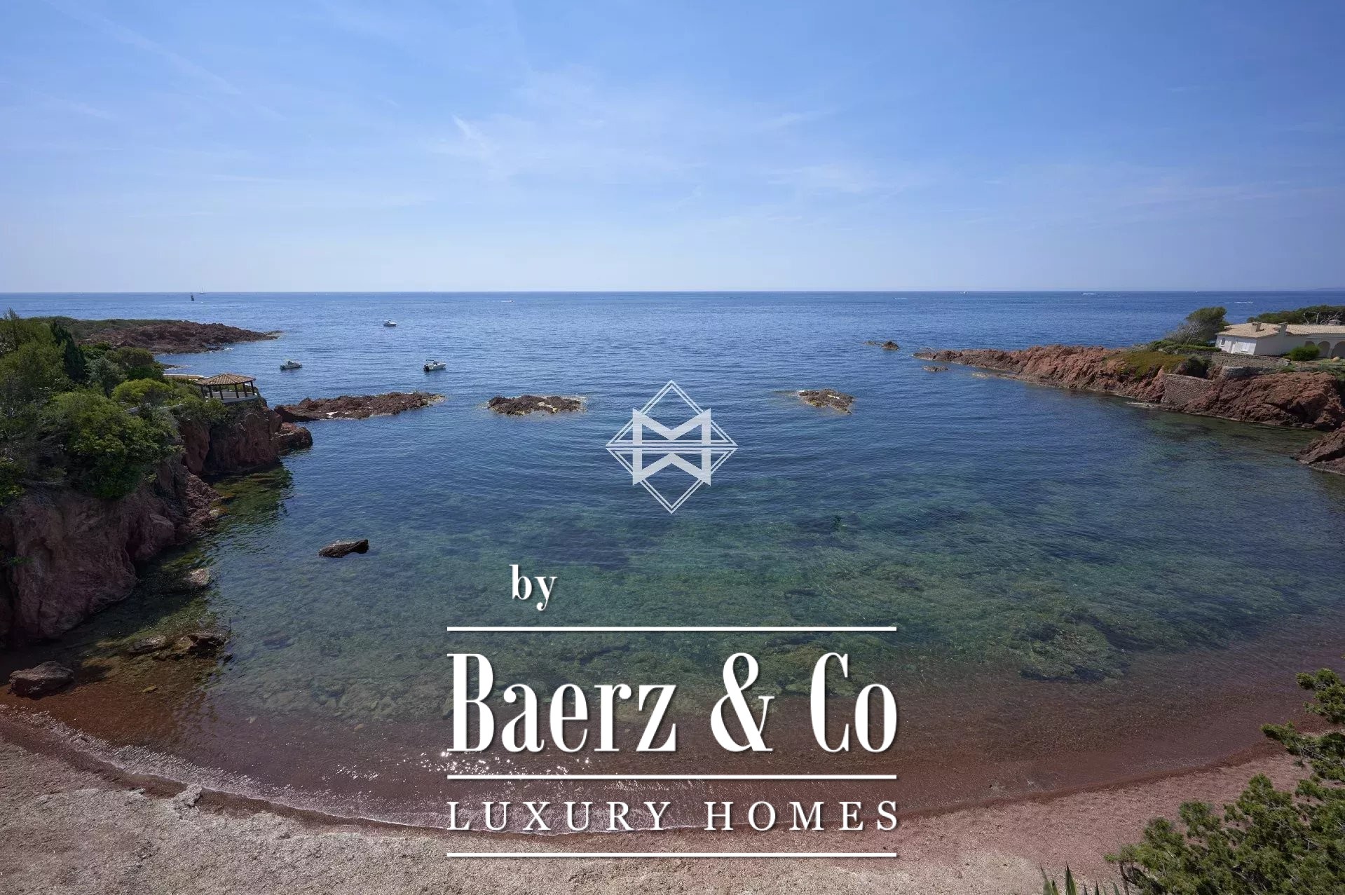 Property Agay presents an exceptional waterfront setting where the Mediterranean unfolds in uninterrupted perspective, the red rock cliffs of the Esterel frame every view, and private direct access places the beach at your feet. This estate, fully restored with deliberate respect for its provenance, encompasses a main villa of approximately 300 m², offering three suites, complemented by a separate 100 m² guest house with two additional bedrooms. A caretaker’s house remains to be tailored to your needs.
