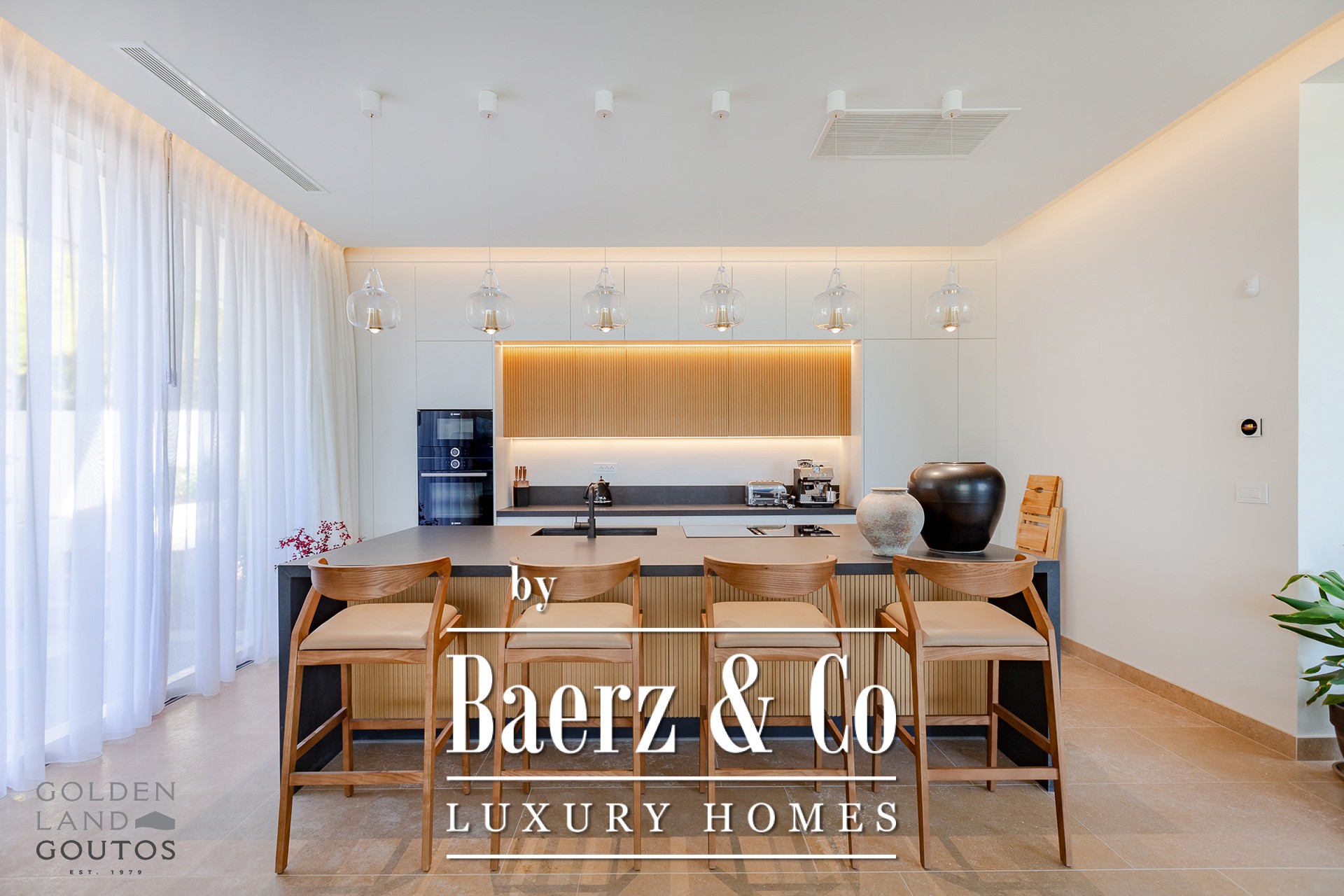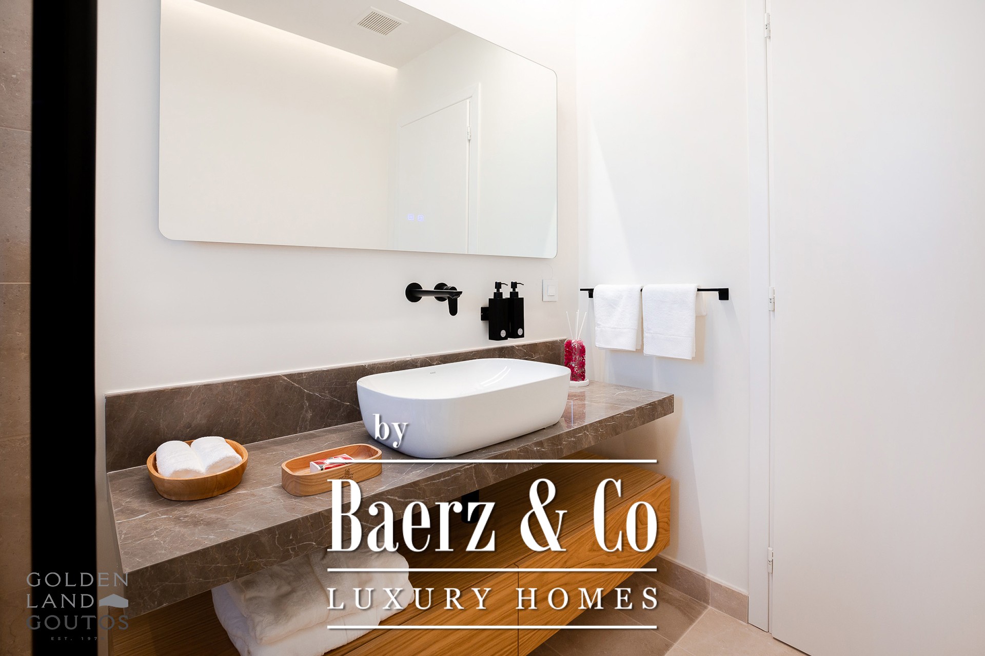 The villa features five luxurious bedrooms, each with its own en-suite bathroom, along with a sauna, a wellness area, an infinity pool, a heated Jacuzzi, and private parking. On entrance, you are welcomed by a stunning open patio that leads to a spacious, open-plan living area, combining the living room, dining room, and kitchen. Expansive windows seamlessly connect the interior to the outdoor spaces, where the infinity pool and entertainment area create the perfect ambiance for relaxation and social gatherings. This level also includes a spacious master bedroom with a private balcony and a guest bathroom.
