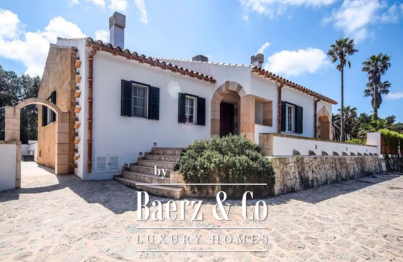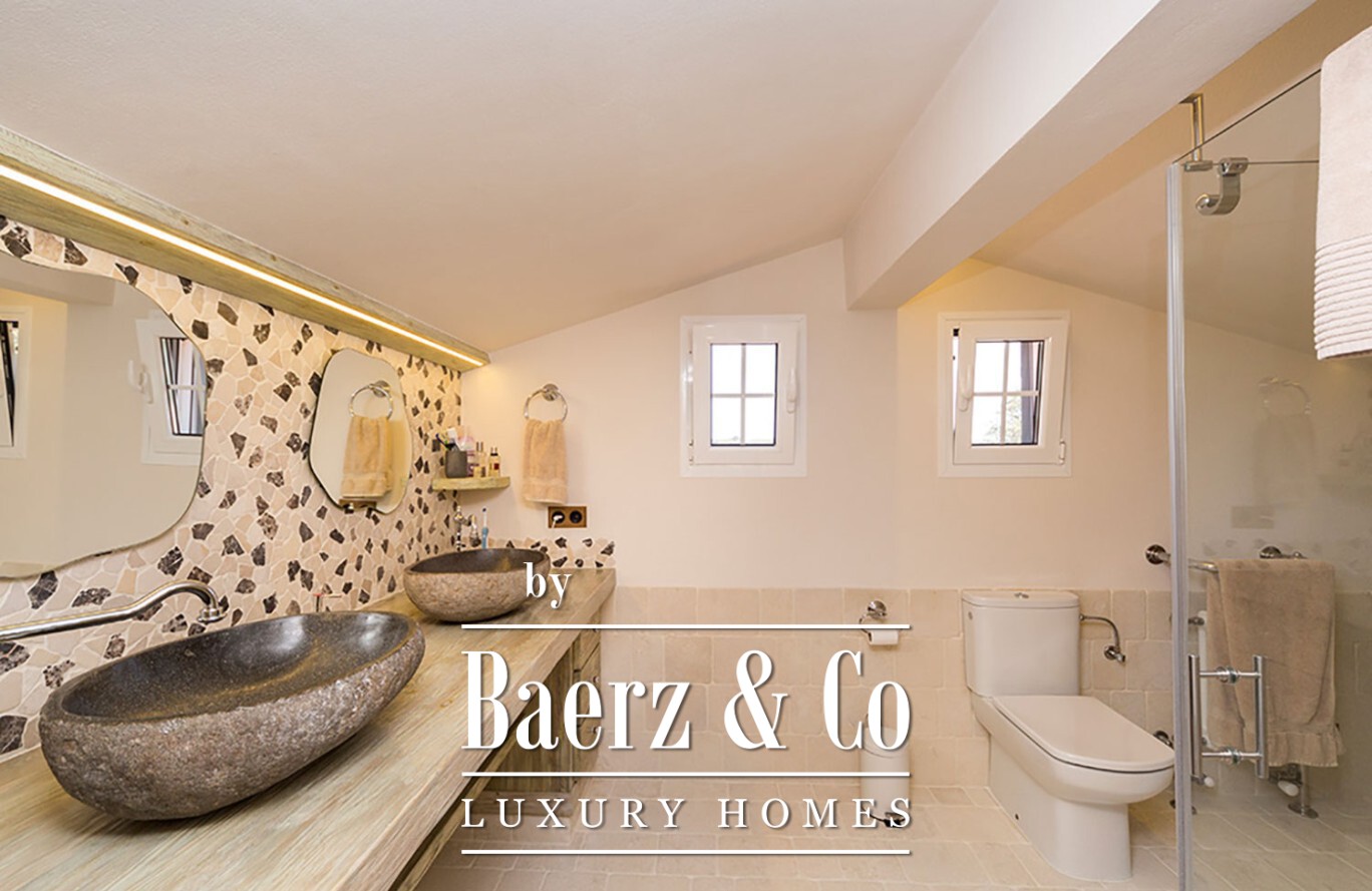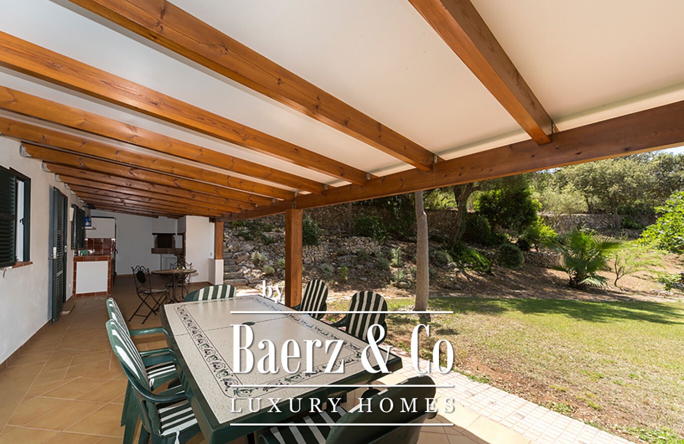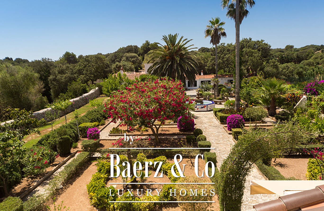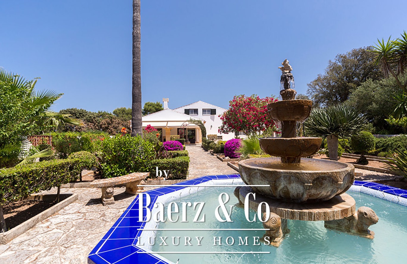 , built inspired by local architecture on a spacious plot of 26,000m2, with a privileged location. Despite being immersed in the native nature, it is less than 2km from Alayor and 4km from the magnificent Son Bou beach on the south coast of the island. The spacious farmhouse consists of the main house and two secondary ones (perfect for guests). The main house is distributed over two floors and a basement. In the basement, there is a cellar. On the ground floor, there are two double bedrooms with en-suite bathrooms, a large living-dining room with fireplace, a spacious kitchen, and laundry. On the upper floor, there is the master suite with a full bathroom. The house has underfloor