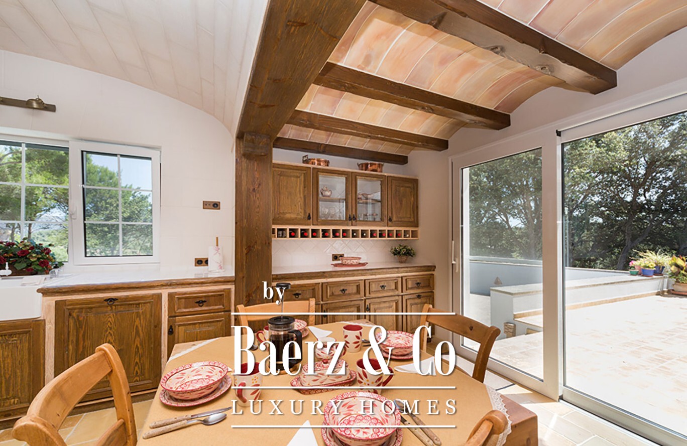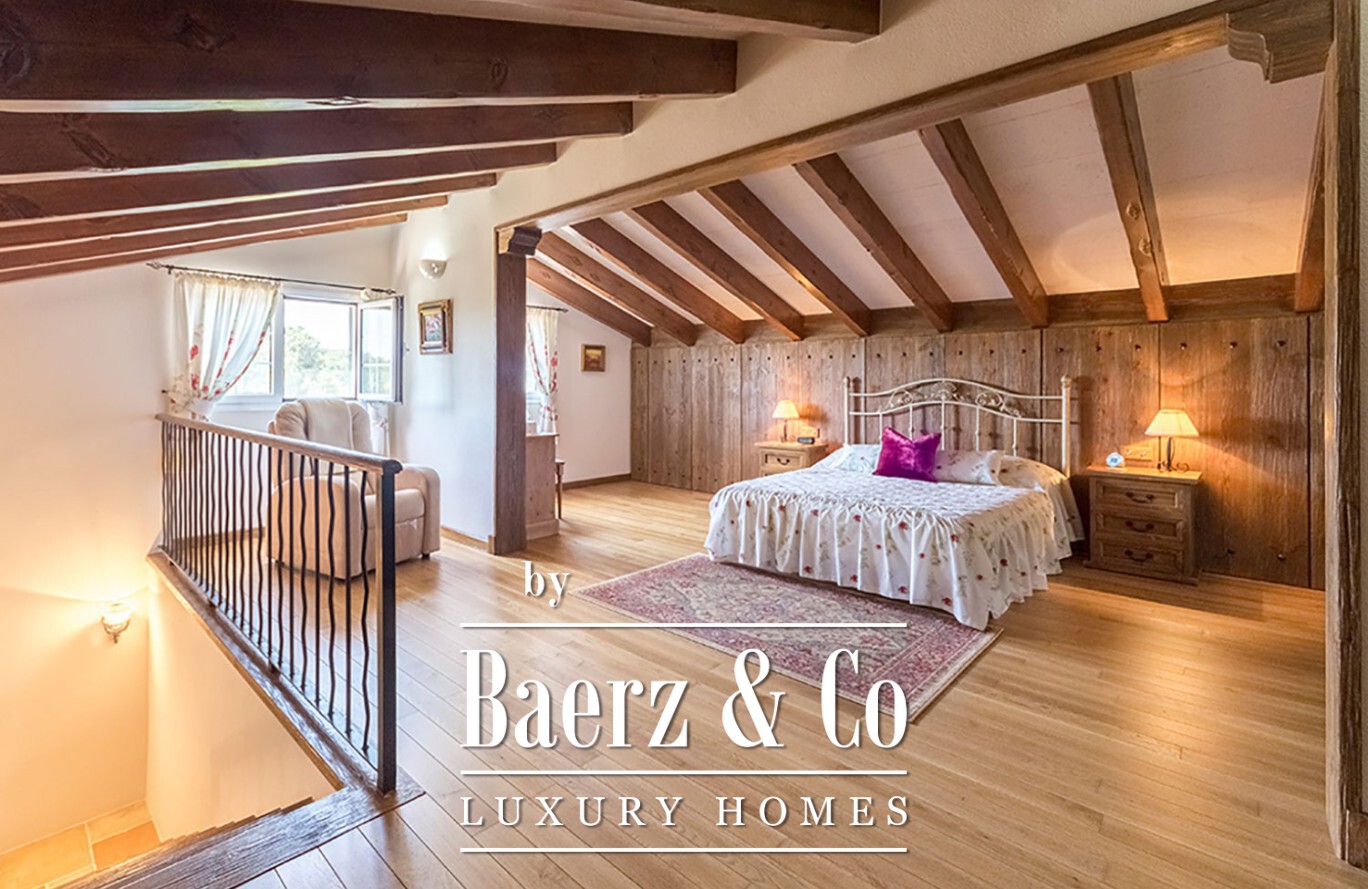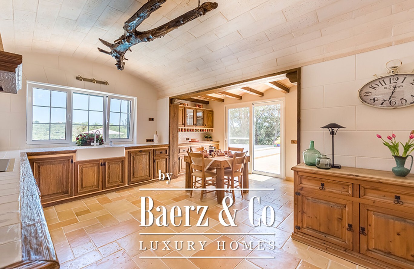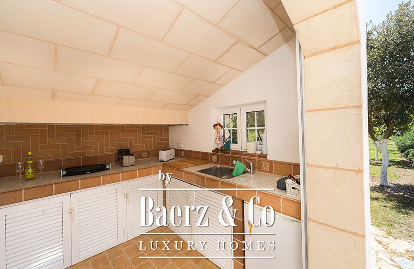 , built inspired by local architecture on a spacious plot of 26,000m2, with a privileged location. Despite being immersed in the native nature, it is less than 2km from Alayor and 4km from the magnificent Son Bou beach on the south coast of the island. The spacious farmhouse consists of the main house and two secondary ones (perfect for guests). The main house is distributed over two floors and a basement. In the basement, there is a cellar. On the ground floor, there are two double bedrooms with en-suite bathrooms, a large living-dining room with fireplace, a spacious kitchen, and laundry. On the upper floor, there is the master suite with a full bathroom. The house has underfloor