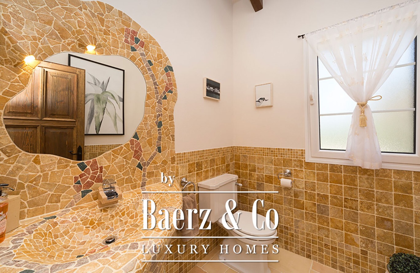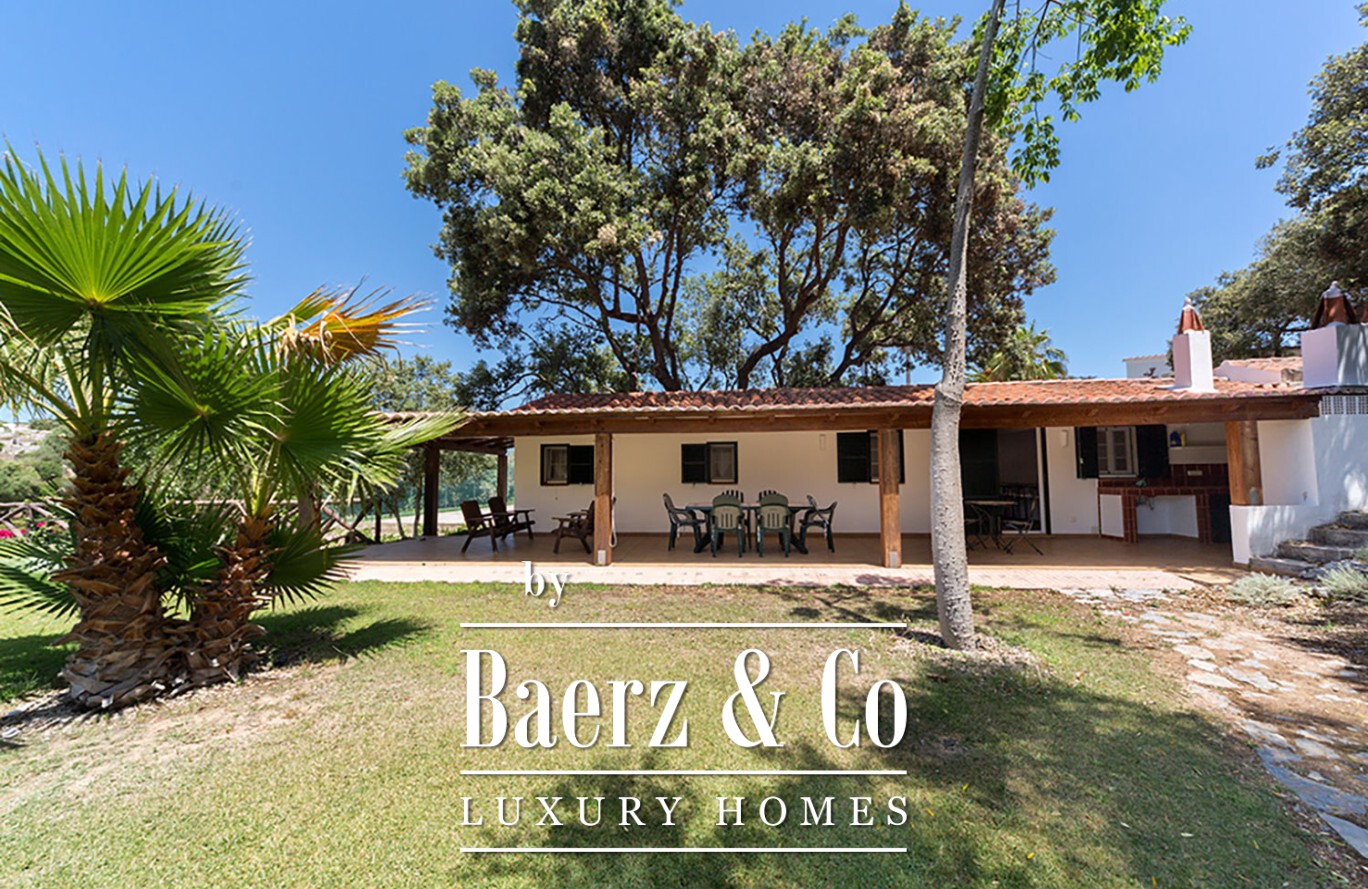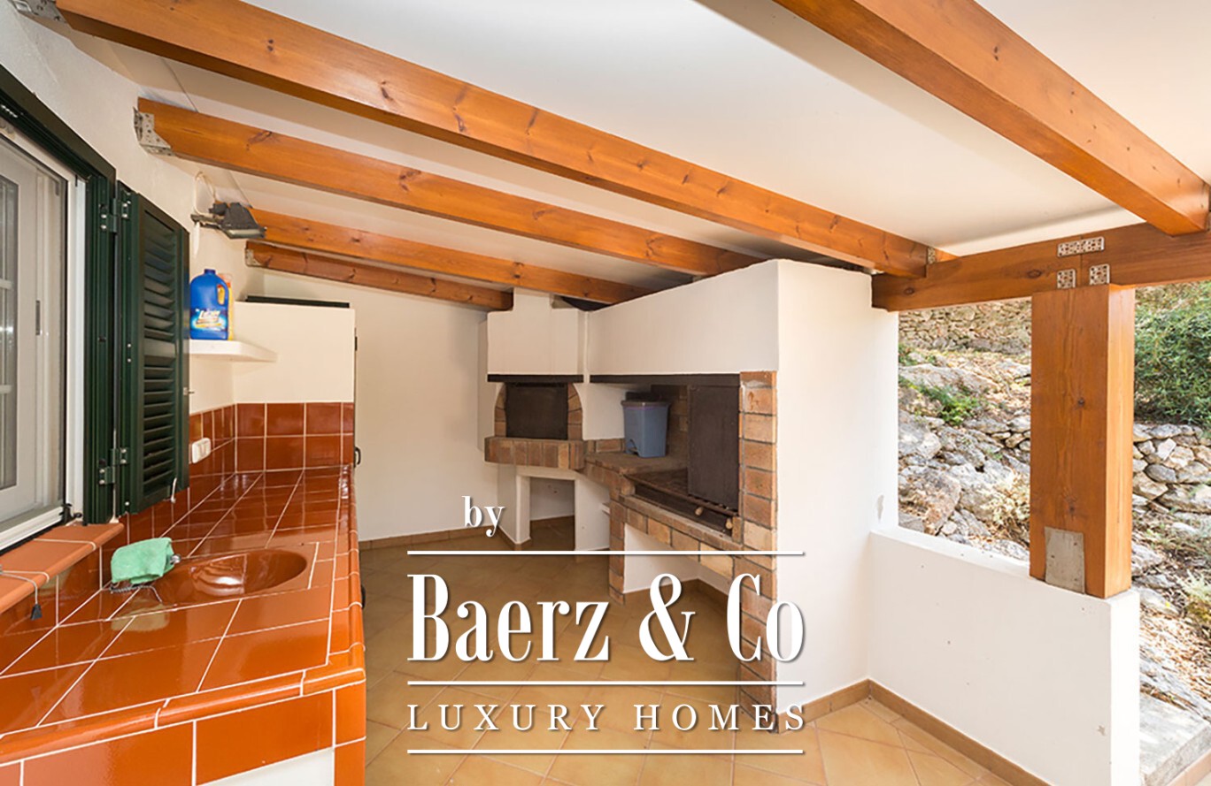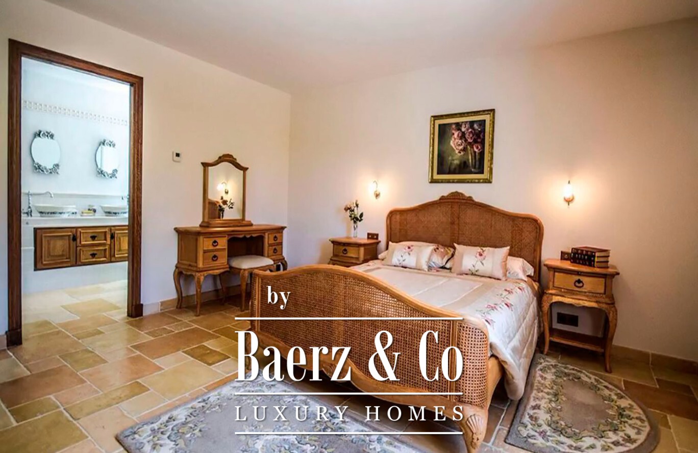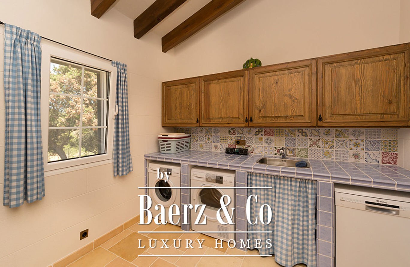 , built inspired by local architecture on a spacious plot of 26,000m2, with a privileged location. Despite being immersed in the native nature, it is less than 2km from Alayor and 4km from the magnificent Son Bou beach on the south coast of the island. The spacious farmhouse consists of the main house and two secondary ones (perfect for guests). The main house is distributed over two floors and a basement. In the basement, there is a cellar. On the ground floor, there are two double bedrooms with en-suite bathrooms, a large living-dining room with fireplace, a spacious kitchen, and laundry. On the upper floor, there is the master suite with a full bathroom. The house has underfloor