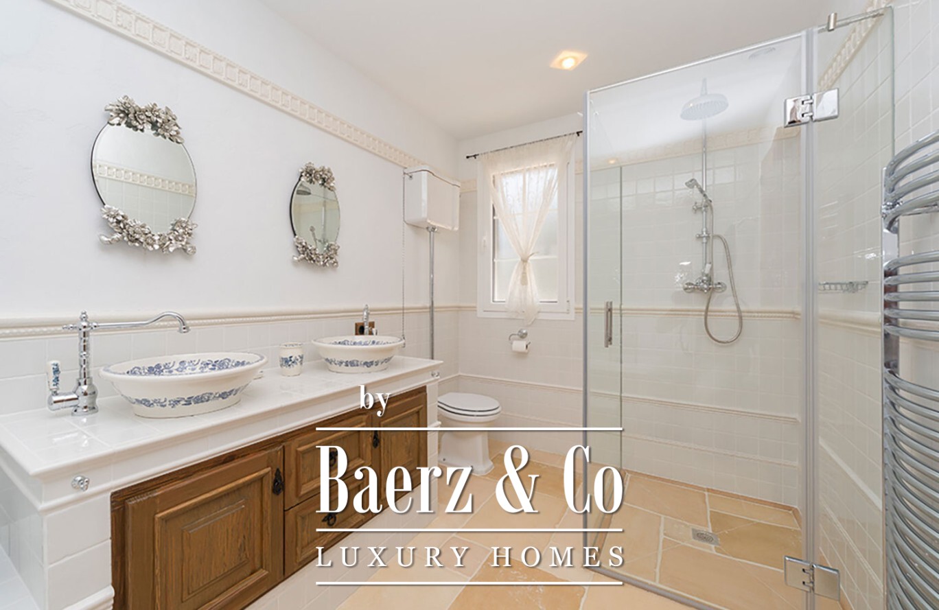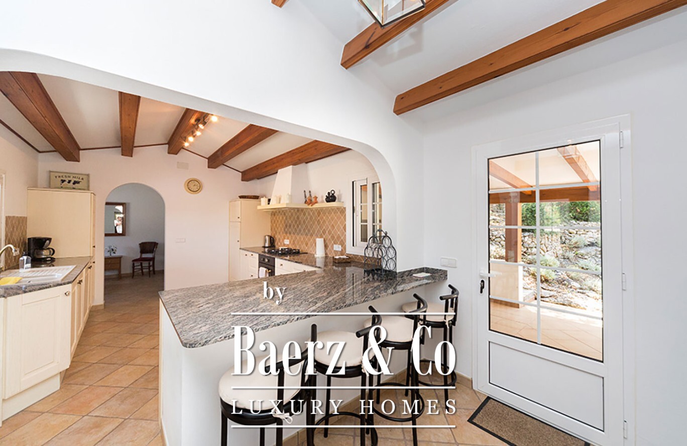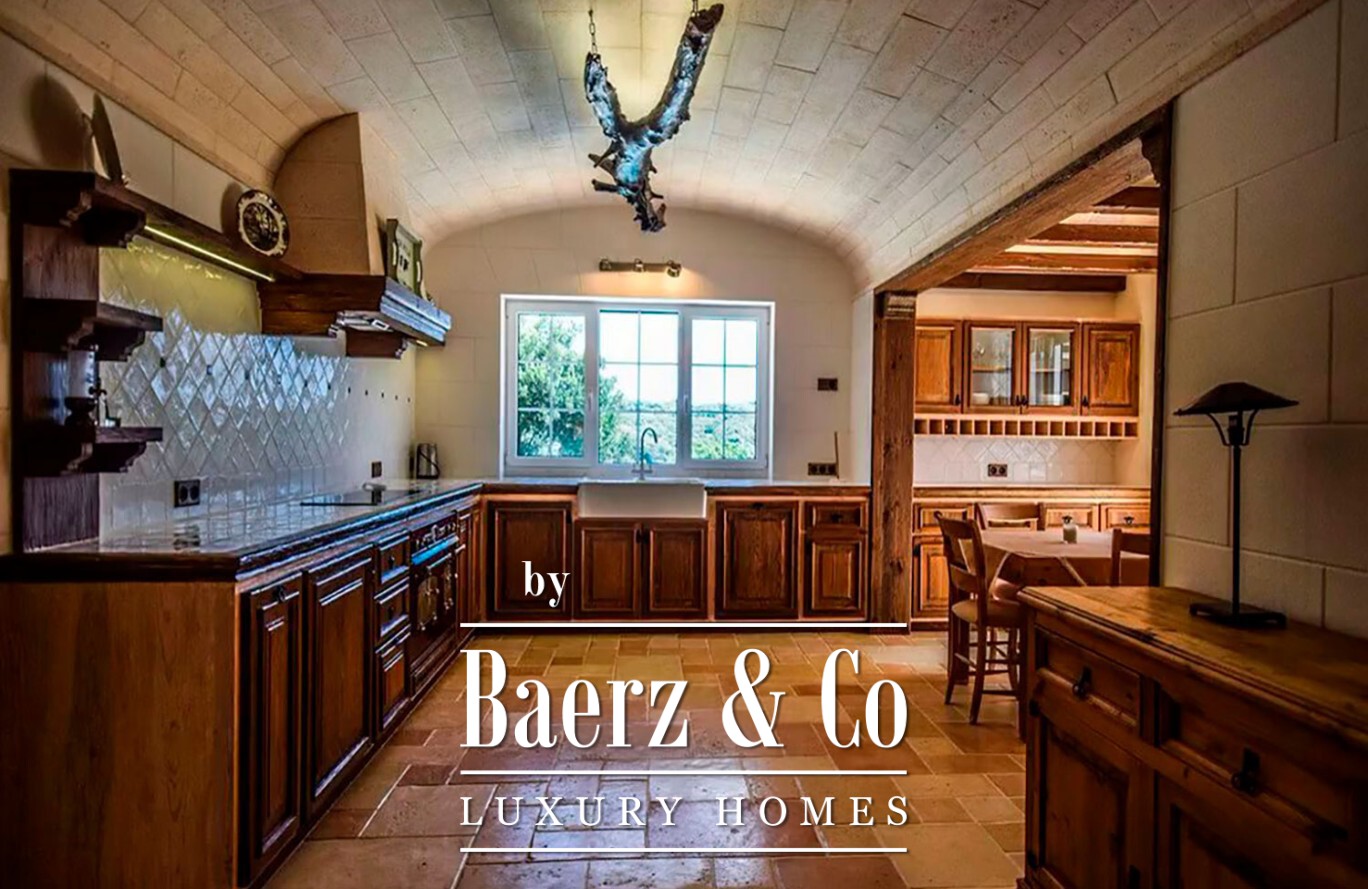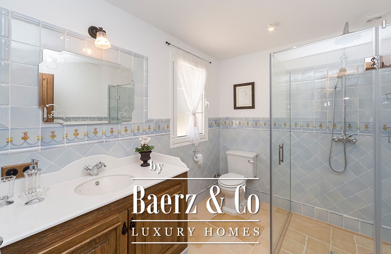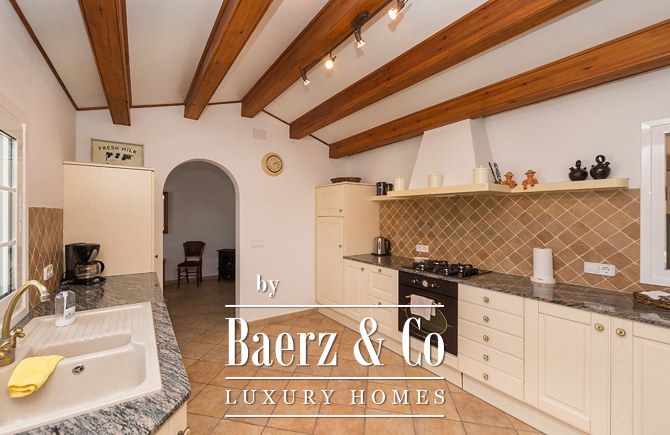 , built inspired by local architecture on a spacious plot of 26,000m2, with a privileged location. Despite being immersed in the native nature, it is less than 2km from Alayor and 4km from the magnificent Son Bou beach on the south coast of the island. The spacious farmhouse consists of the main house and two secondary ones (perfect for guests). The main house is distributed over two floors and a basement. In the basement, there is a cellar. On the ground floor, there are two double bedrooms with en-suite bathrooms, a large living-dining room with fireplace, a spacious kitchen, and laundry. On the upper floor, there is the master suite with a full bathroom. The house has underfloor