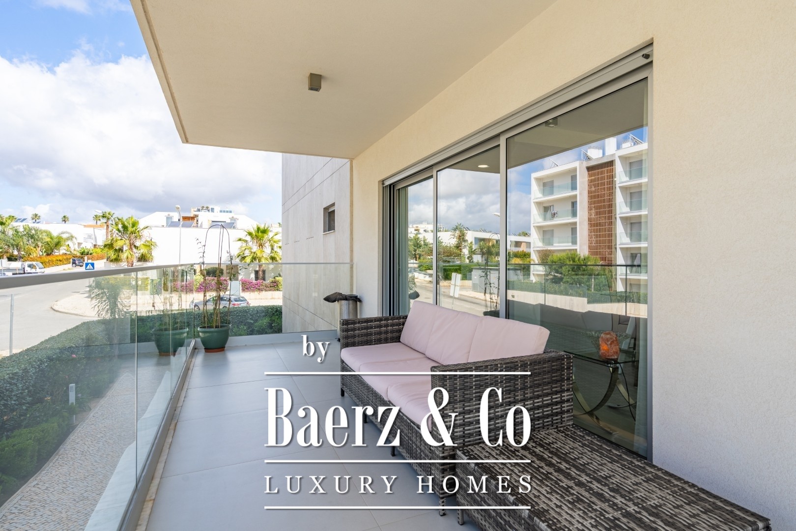 The apartment is bright and spacious, with a practical layout that connects the kitchen, living, and dining areas. Large sliding doors open onto a generous terrace, ideal for relaxed outdoor meals or simply enjoying the Algarve sun. The terrace also includes a built-in BBQ. Because this apartment is located on the corner and it has a terrace and a balcony on either side, it has the perfect sun exposure to ensure sun all day as well as always having a shaded outside area at any point of the day.