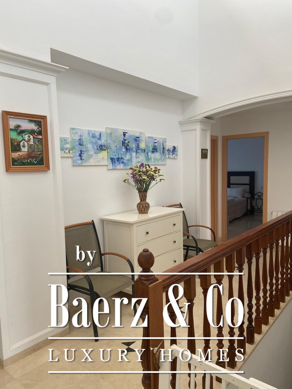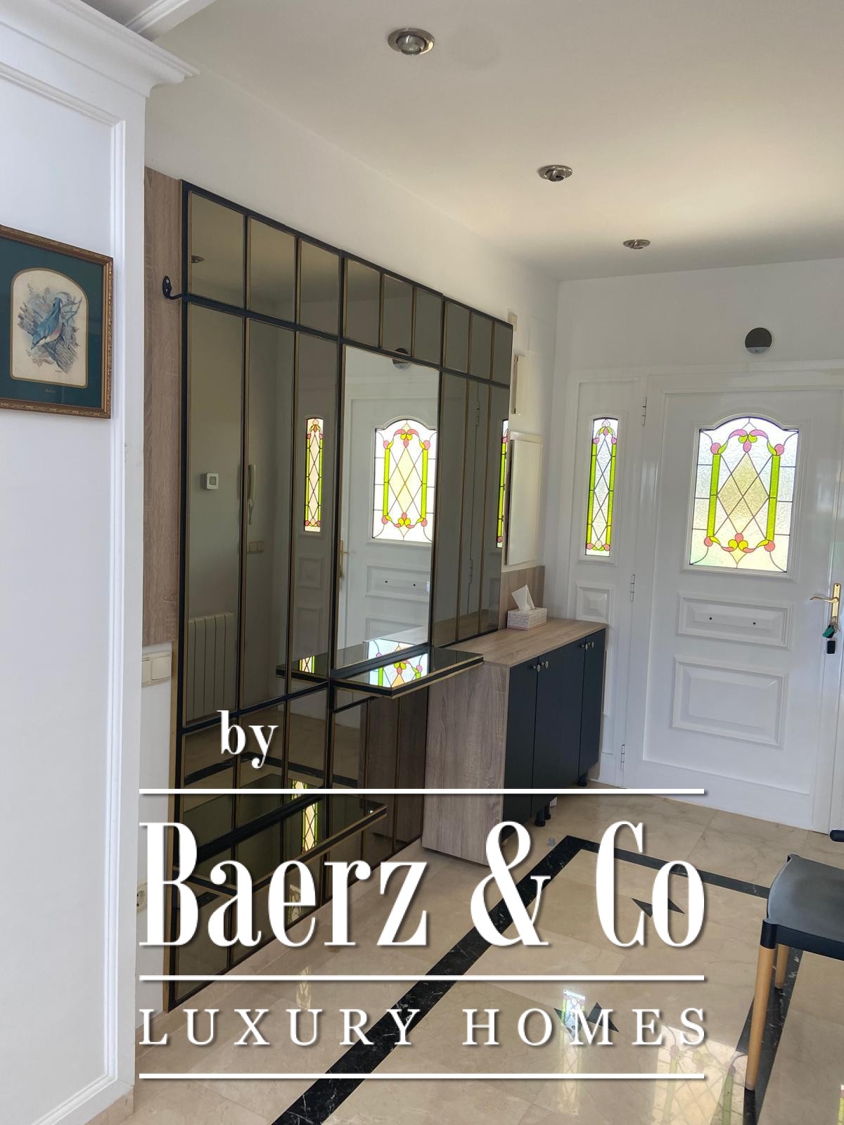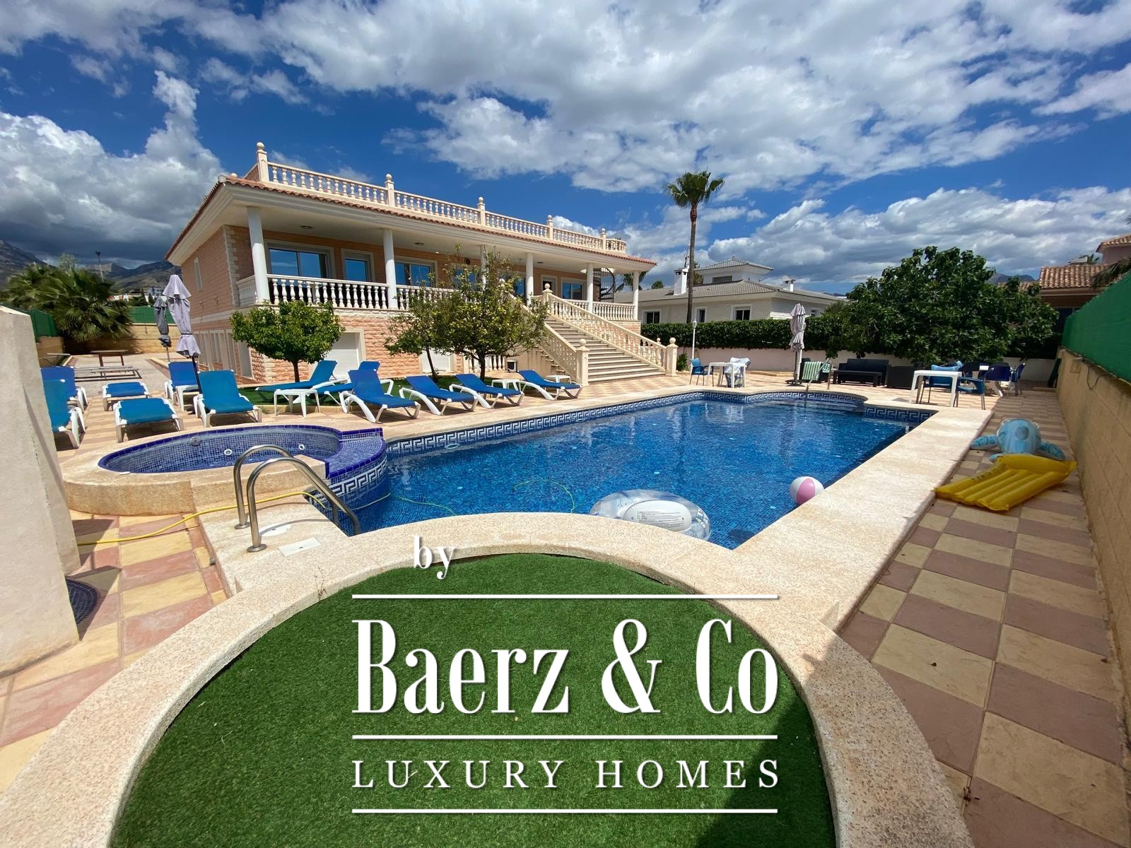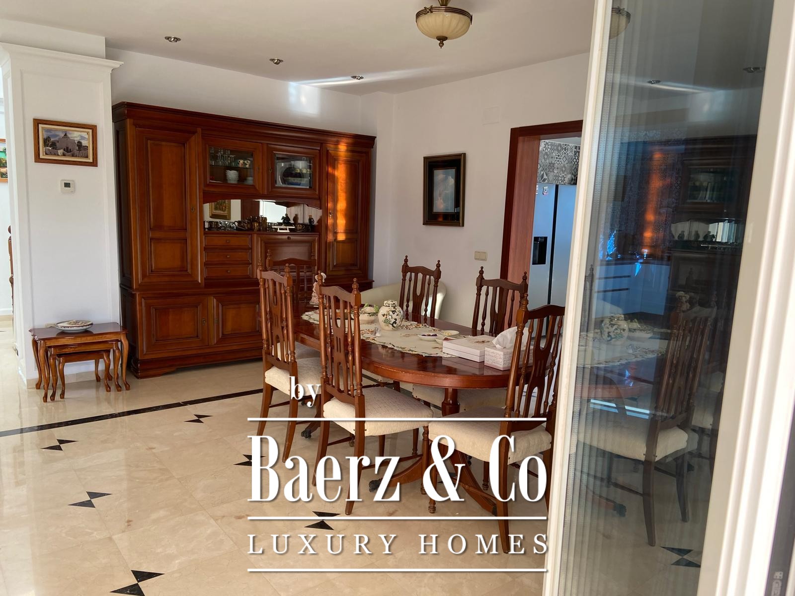At the rear, a spacious lounge and recently refurbished open-plan kitchen flow seamlessly toward a covered terrace. This outdoor living room leads to a solarium, where Sierra Helada and Benidorm’s skyline come into open view. The grounds—1,150 m² in total—feature multiple terraces, a private saltwater pool, Mediterranean gardens, and a two-car garage. With nine bedrooms and six bathrooms, secure fencing, double glazing, a modern security door, and the assurance of a tourist license, this villa in Alfaz del Pi defines a discreet family retreat close to every local service.