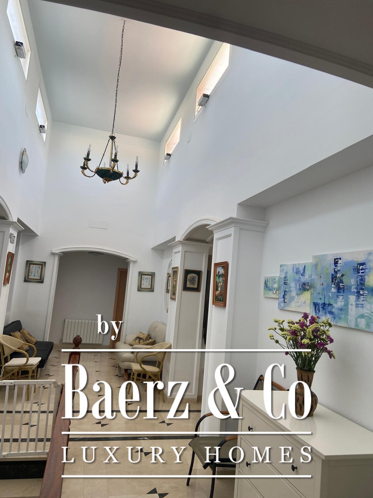 Stepping inside the main house, a generous entrance hall welcomes you beneath high ceilings and skylights, where daylight traces its way into every space. Three double bedrooms await, two featuring balconies with quiet seating areas and one offering direct access to a large terrace overlooking the saltwater pool. A fourth double bedroom includes its own balcony and seating at the front of the house, adjacent to a bathroom with hydromassage.