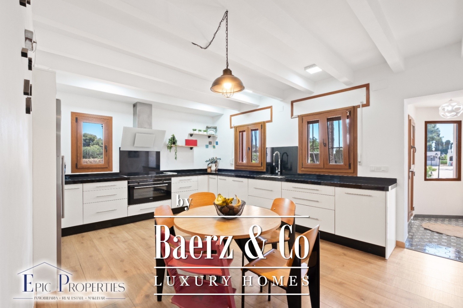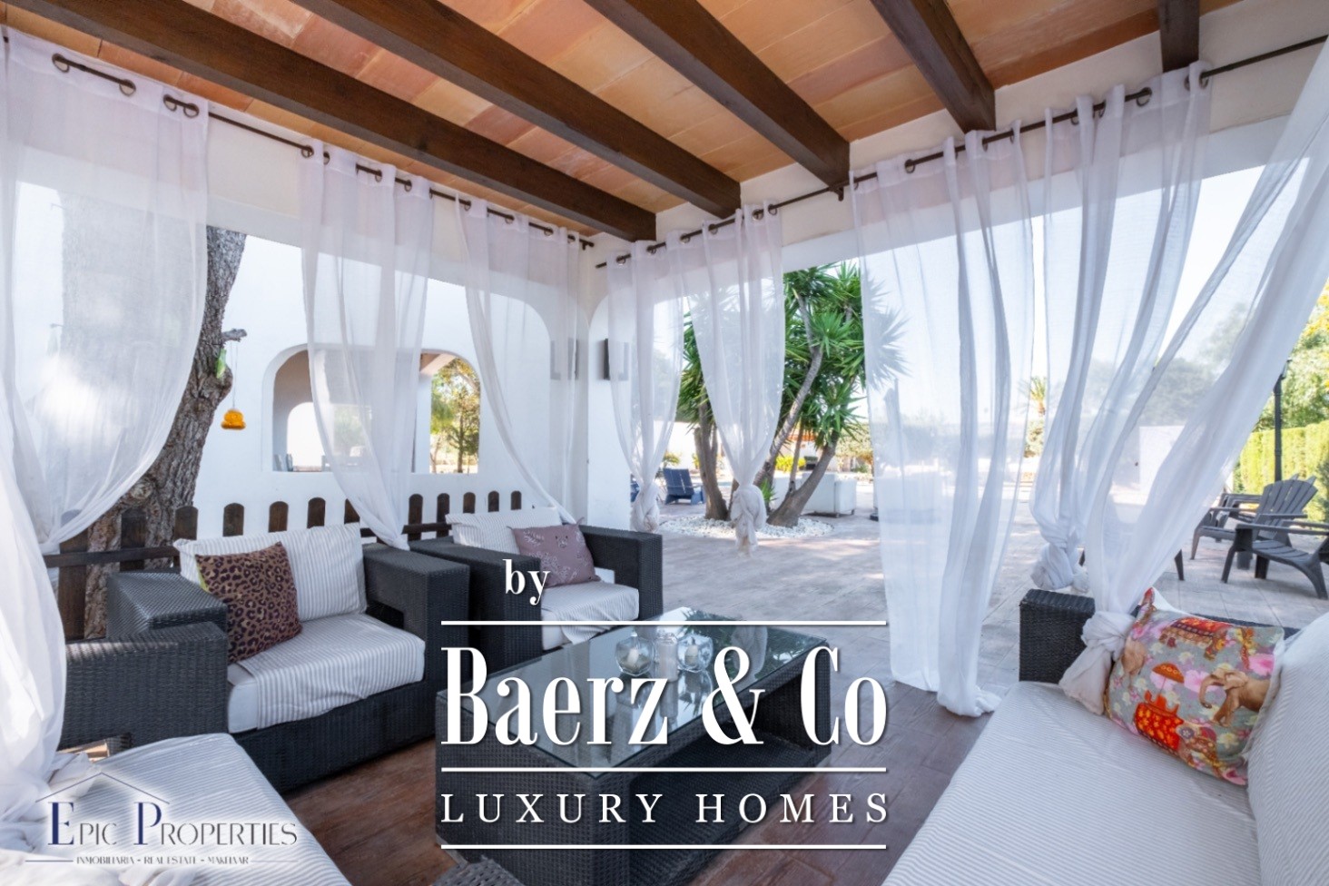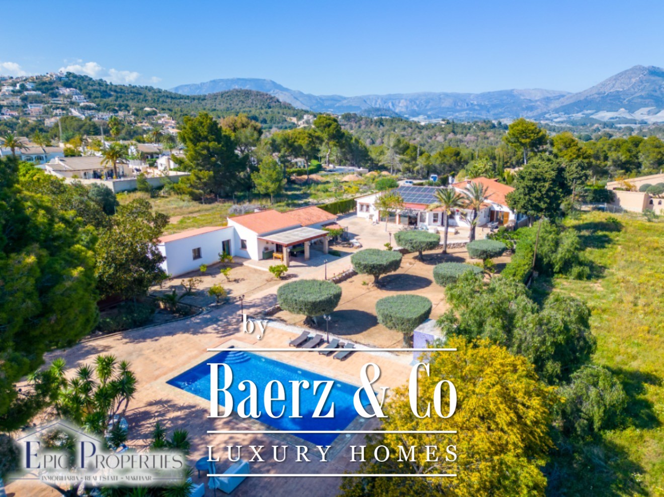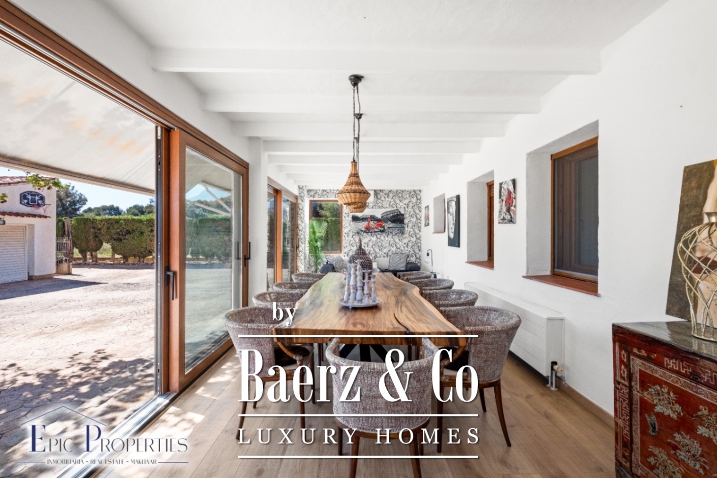 We present this spectacular 7,000 m² estate, completely fenced and flat, located in a privileged natural setting, with open views of the imposing mountains of the Sierra Bernia, Sierra Helada, and Puig Campana. A true oasis of privacy, comfort, and style. The property features an elegant main house of 380 m² with a rustic design and industrial touches, combining noble materials and modern lines for a warm and sophisticated atmosphere. Inside, a spacious living room of 75 m² stands out, with high ceilings, a wood-burning fireplace, and a separate dining area, ideal for enjoying with family or guests. The kitchen, fully equipped with high-end appliances, offers functionality and design in every detail. There are 5 bedrooms and 3 bathrooms, including a master suite with a dressing room and private bathroom, as well as an office, a courtesy bathroom, and high-quality finishes. The home is equipped with double-glazing for security, solar panels, central gas heating (with underfloor heating in part of the house), and air conditioning,