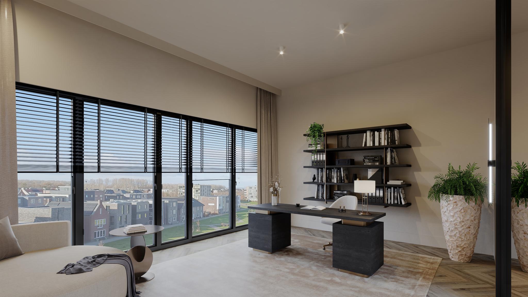- Standaard screens (zonwering) aan de parkzijde (westen);