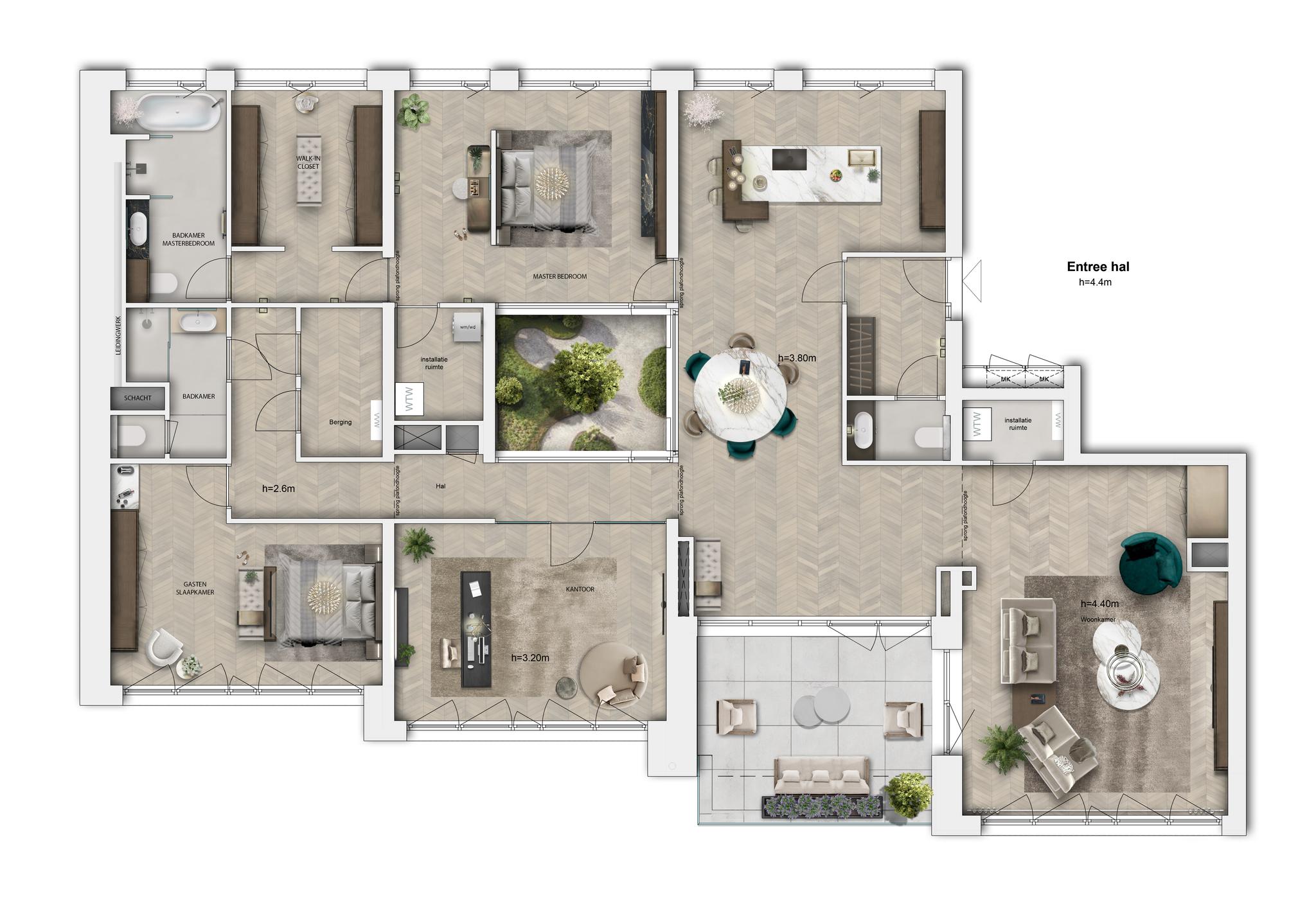 The penthouse has many freely dividable rooms with plenty of possibilities. There is room for a music room study and several bedrooms. Wonderful possibilities in terms of kitchen, sanitary and bathrooms. If you are interested, we will be happy to think with you about the layout and/or guidance with an interior architect.