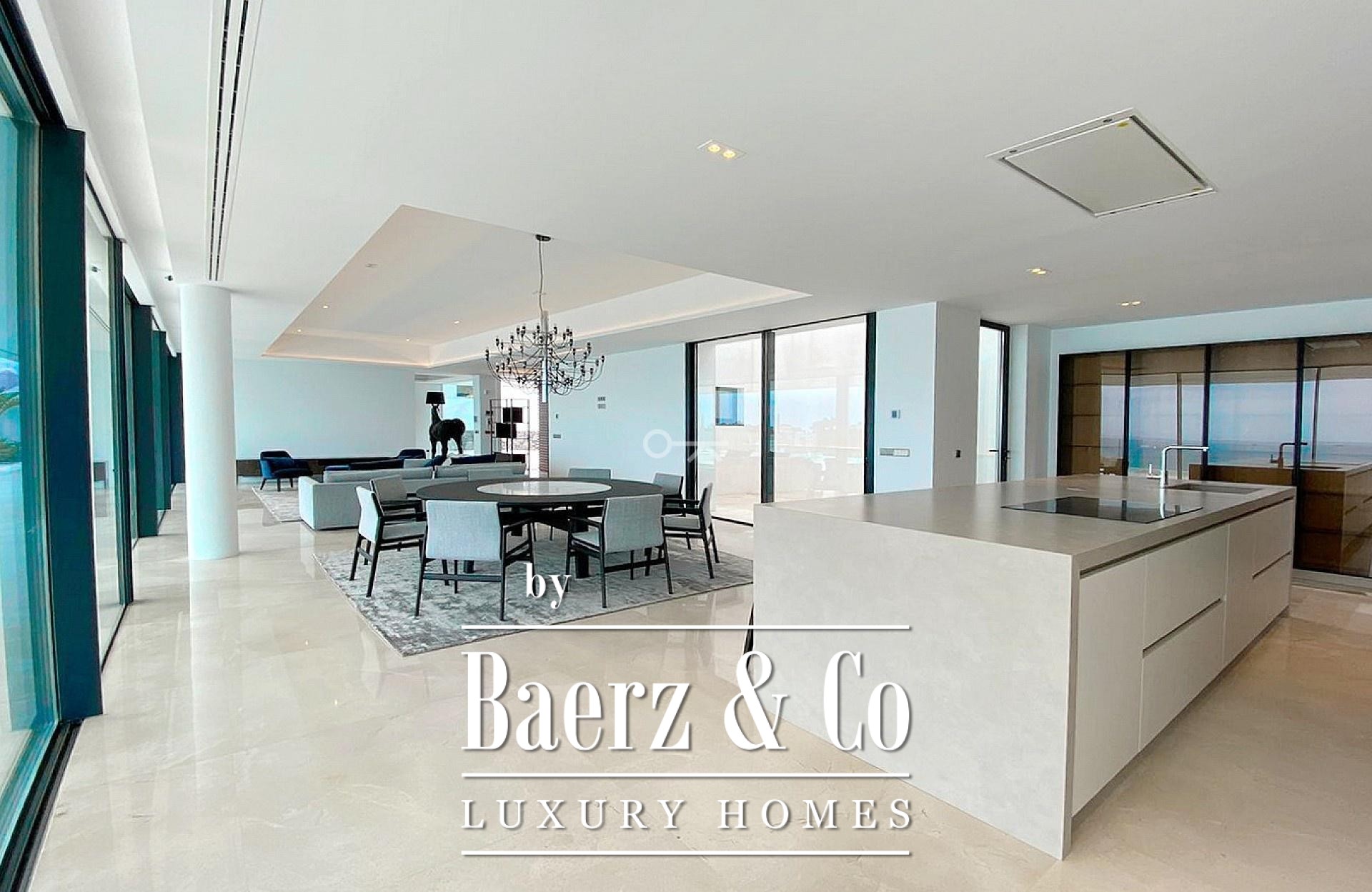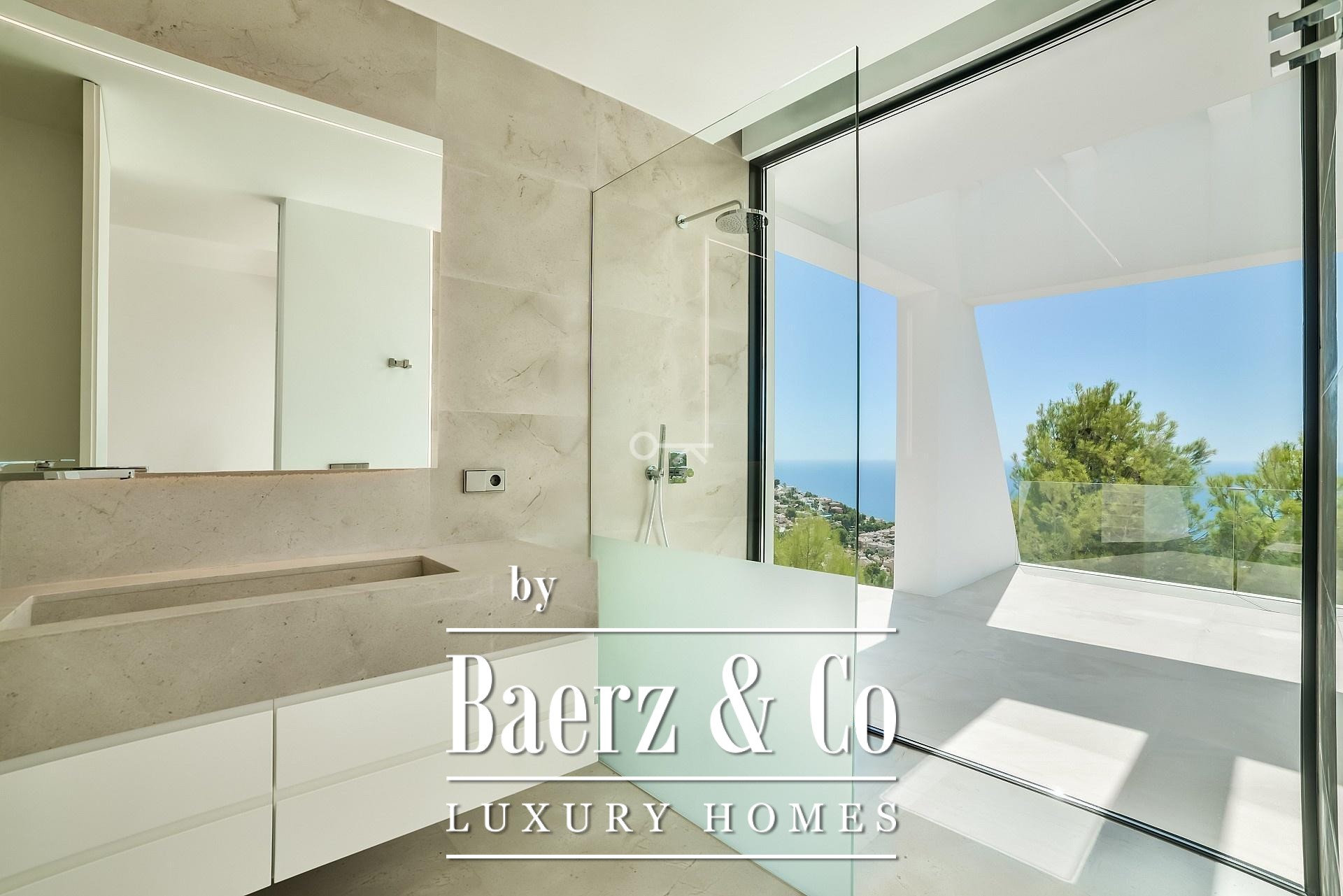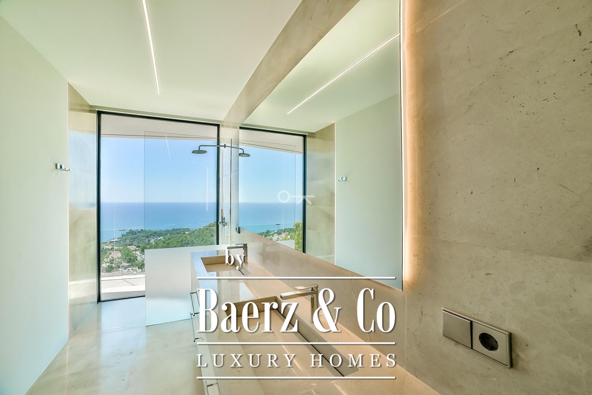 This modern villa Altea Hills captures a rare balance of architecture and landscape, set within 1,586 m² of Mediterranean grounds above the seaside. The property spans 750 m², delivering an interplay of light, air, and expansive living spaces. As the focus keyword suggests, the villa is located in Altea Hills, presenting panoramic sea views from every room. Each of the five bedrooms features its own bathroom and direct access to terraces framed by glass railings, creating a seamless connection between interior comfort and the horizon beyond.