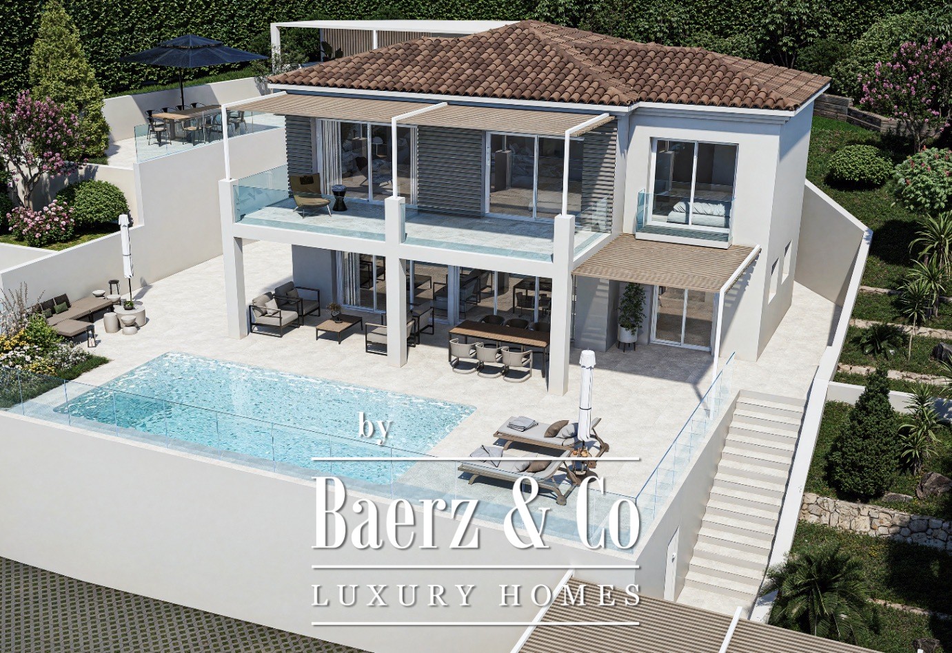 The residence spans 340 m² on a plot of 800 m², offering three bedrooms, three full bathrooms, and a guest toilet. Light fills the living-dining room, which opens onto generous terraces shaded by a delicate pergola that tempers the Mediterranean sun. The kitchen is fully equipped, with an adjacent laundry room for convenience. Outdoor living is elevated by a covered barbecue, private pool, and layered garden terraces crafted for both relaxation and subtle entertaining.
