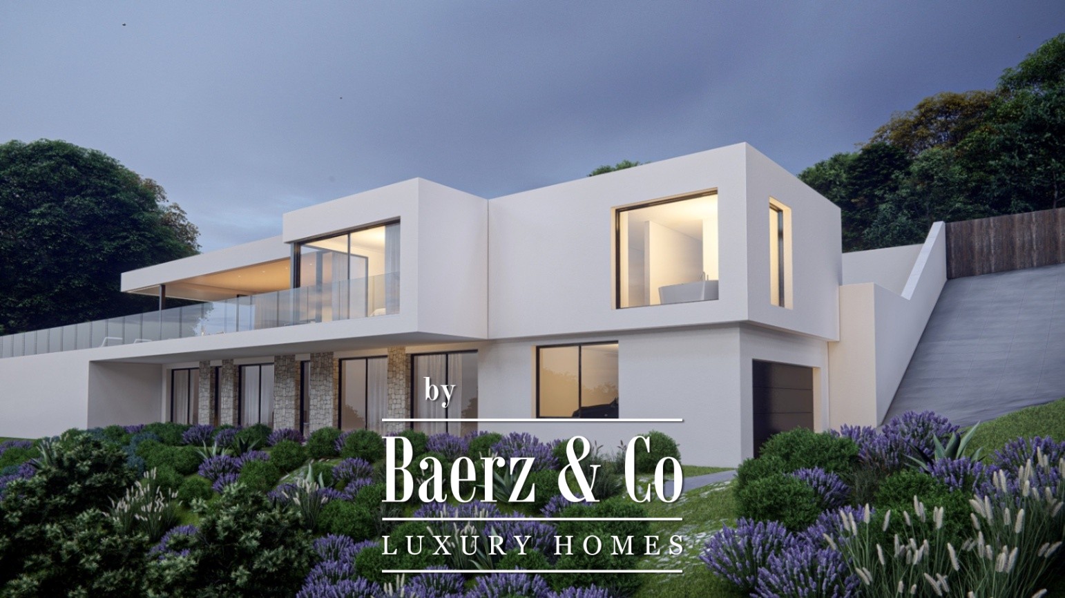 New modern villa project in Altea with panoramic sea and mountain views, 331m2 distributed over two floors with a total of 4 bedrooms, 4 bathrooms, a dressing room, a guest toilet, a hall, a spacious living-dining room, and a fully equipped designer kitchen. On the access level, there is a garage for two cars and an entrance to the house. Plot of 1,830 m2 with 100% privacy, landscaped with natural grass, automatic irrigation, barbecue, and an infinity pool. High-quality noble materials and finishes that create a warm home atmosphere. Housing: large format porcelain tile flooring, which can be replaced by wooden flooring in the bedrooms. TERRACE AND PERGOLAS: Finished with non-slip porcelain. BATHROOMS AND KITCHENS: wall-mounted toilets with concealed cisterns from Villeroy & Boch, Cielo, or similar, furniture with integrated