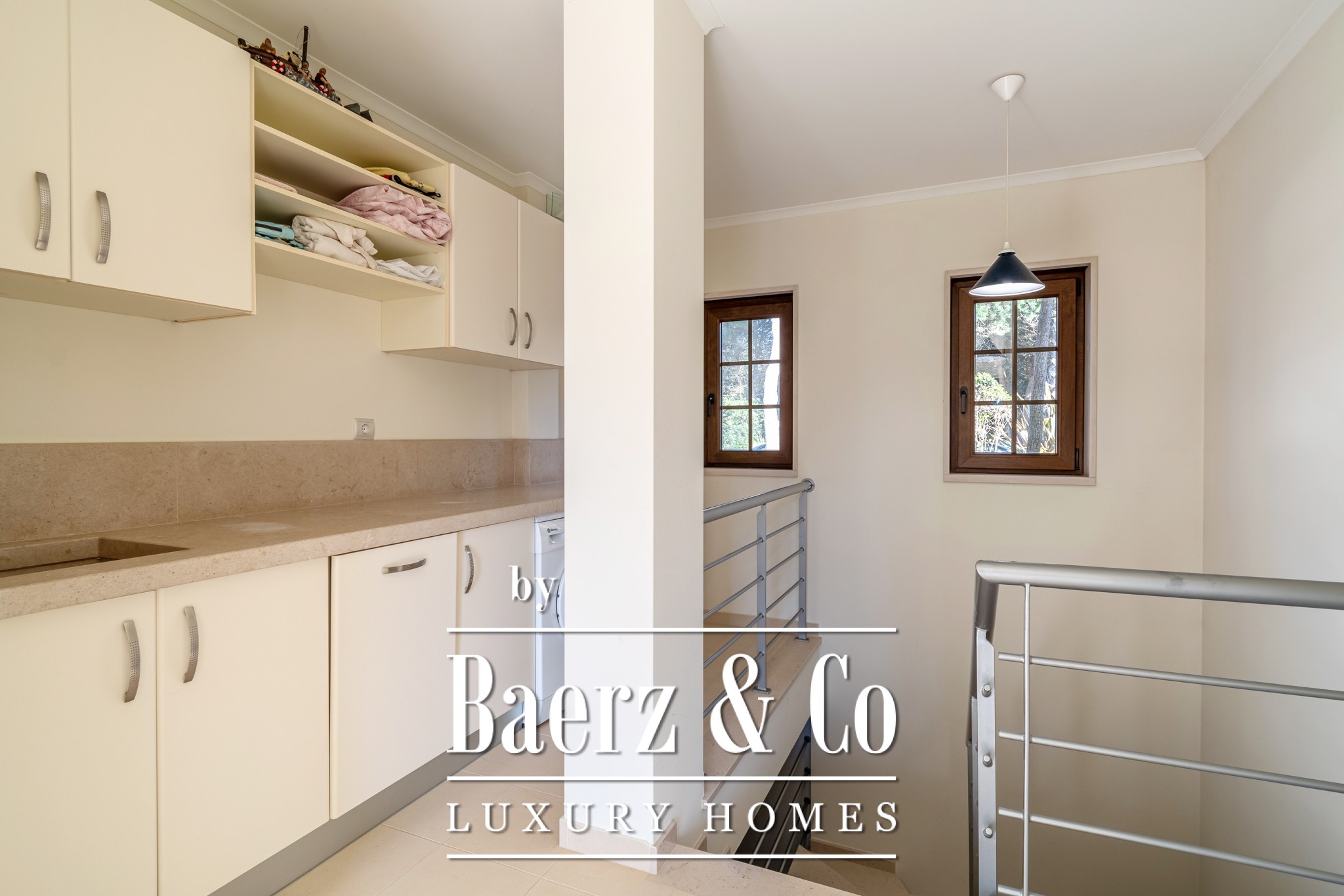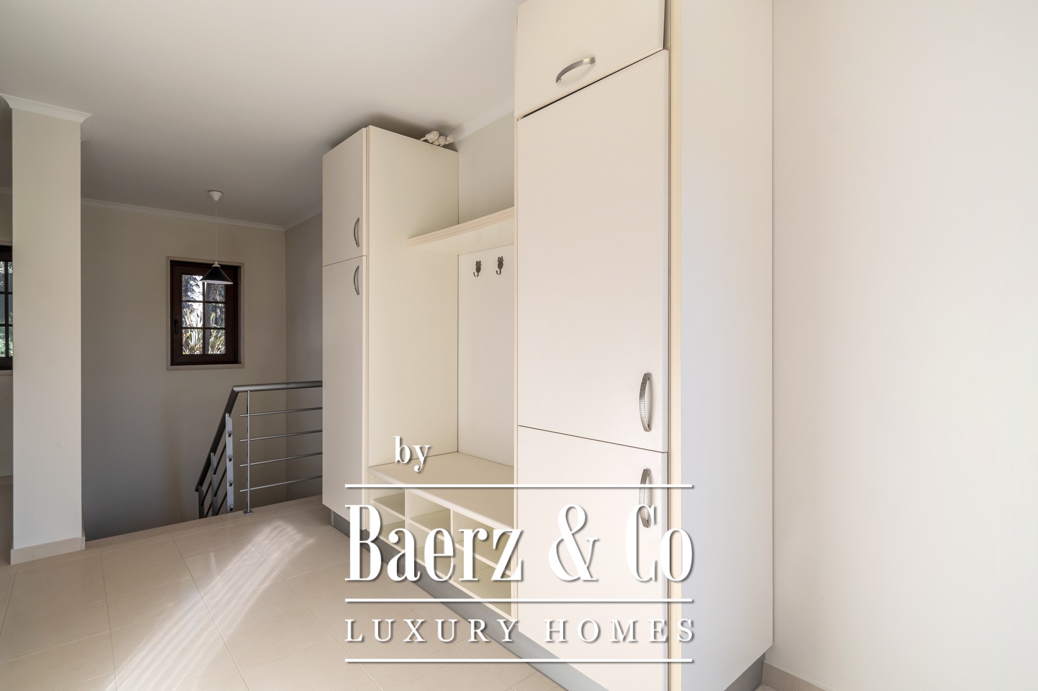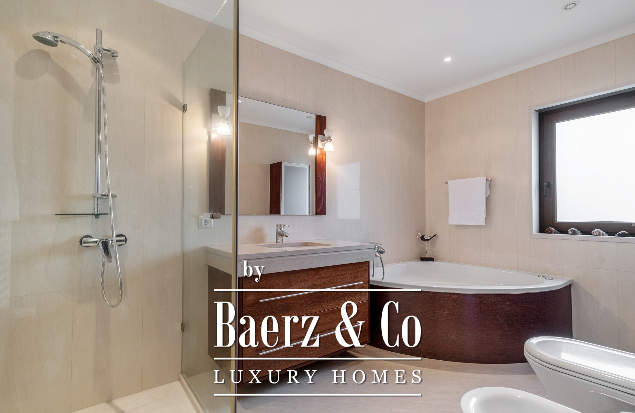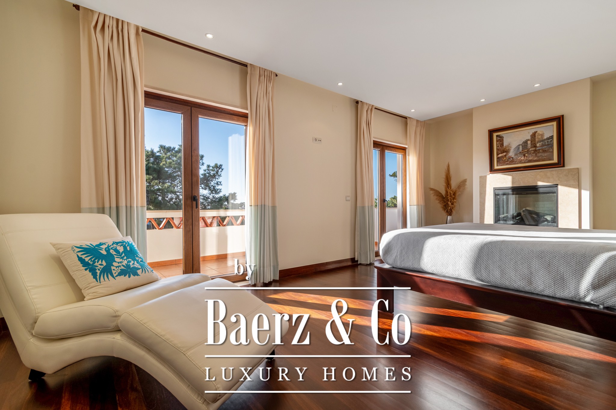 Very well located within Praia d'el Rey Beach & Golf Resort, this fabulous villa with privileged views of the golf course offers the perfect balance between elegance, comfort and tranquillity.Just a 2-minute walk from the Clubhouse, a 10-minute walk from the beach and a few minutes by car from all kinds of shops and services, this villa is perfect for those who value a privileged location, quality of life and comfort.With a plot of 1024 m2 and 480.38m2 of construction area, the villa stands out for the quality of the finishes and the excellent distribution of its spaces.Spread over 2 floors and basement, with plenty of privacy and excellent solar orientation, the villa consists of: Ground Floor: - Elegant entrance hall, very spacious and with a beautiful wooden staircase that gives access to the upper floor- Private office.- Social bathroom- A bedroom en suite with a good wardrobe and bathroom with window, shower and bathtub, ideal for receiving guests.- Generously sized equipped kitchen with 2 islands, with pantry, laundry room and direct access to the basement and garden. - Elegant dining room- Spacious and welcoming living room integrated with the dining room and kitchen, perfect for enjoying the family and receiving guests, with a stone fireplace and stove and large glass windows that let in abundant light.Upper Floor:- A generous bedroom hall that gives access to a pleasant terrace with sun in the morning.- Two large bedrooms with good wardrobes and sharing the same bathroom complete with shower and a window. One of the bedrooms also has a spacious private terrace with plenty of light.- Master bedroom, spacious and bright with electric fireplace, a walking closet, a generous full bathroom with shower, whirlpool bathtub and window and also a pleasant and