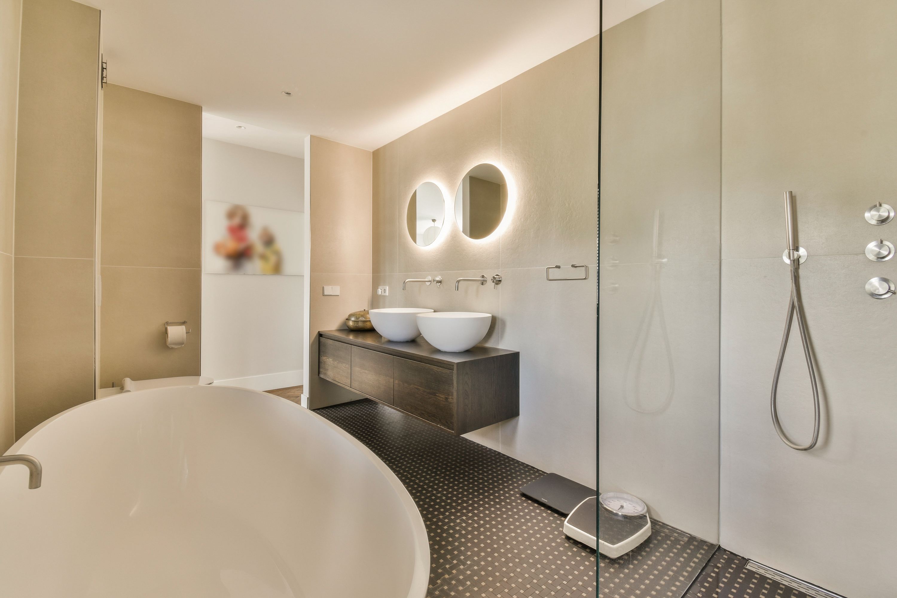 A staircase leads to the first floor, where peace and privacy are key. At the front of the home is the spacious bedroom, offering panoramic views of the Amstel. This room includes a large walk-in closet and a luxurious en-suite bathroom with a freestanding bathtub, double vanity, walk-in shower and toilet. At the rear is a second large bedroom, also with an en-suit bathroom. This bathroom is equipped with a double sink, walk-in shower and toilet. A bright landing connects the rooms and enhances the overall sense of space and refinement.
