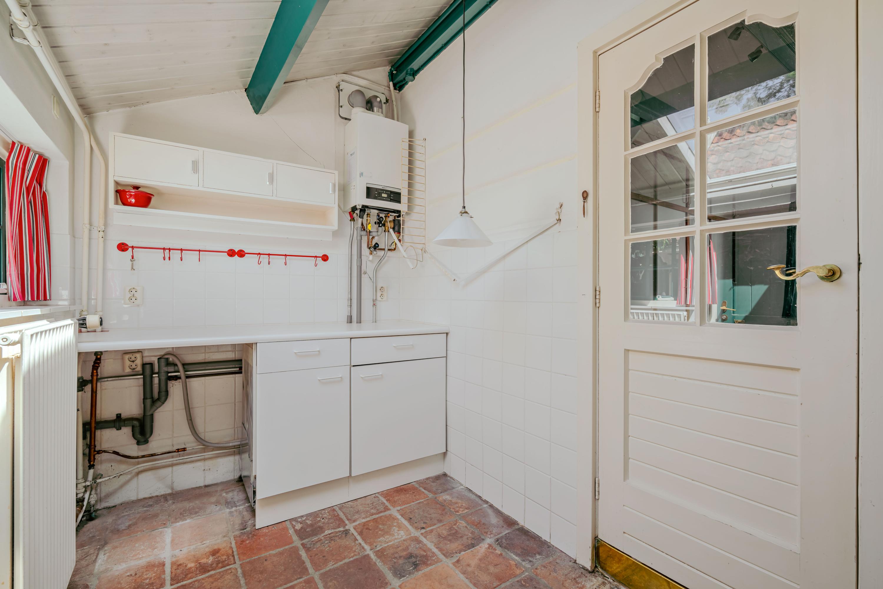 From the courtyard, the main house can be accessed through two doors. The left door opens into the kitchen, where ample daylight enters through skylights. The kitchen is fitted with a sink, four-burner gas hob, oven, and various cabinets and drawers. The central heating boiler and washing machine connection are also located here. Adjoining the kitchen is the living and dining room at the front of the house, featuring wooden beams, built-in cupboards, and windows overlooking the garden. The fireplace, wooden finishes, and view of the dike give the room a warm and inviting atmosphere. Through the hallway with a skylight, you reach the separate toilet with washbasin and the bathroom, which includes a bathtub with shower and a washbasin unit.