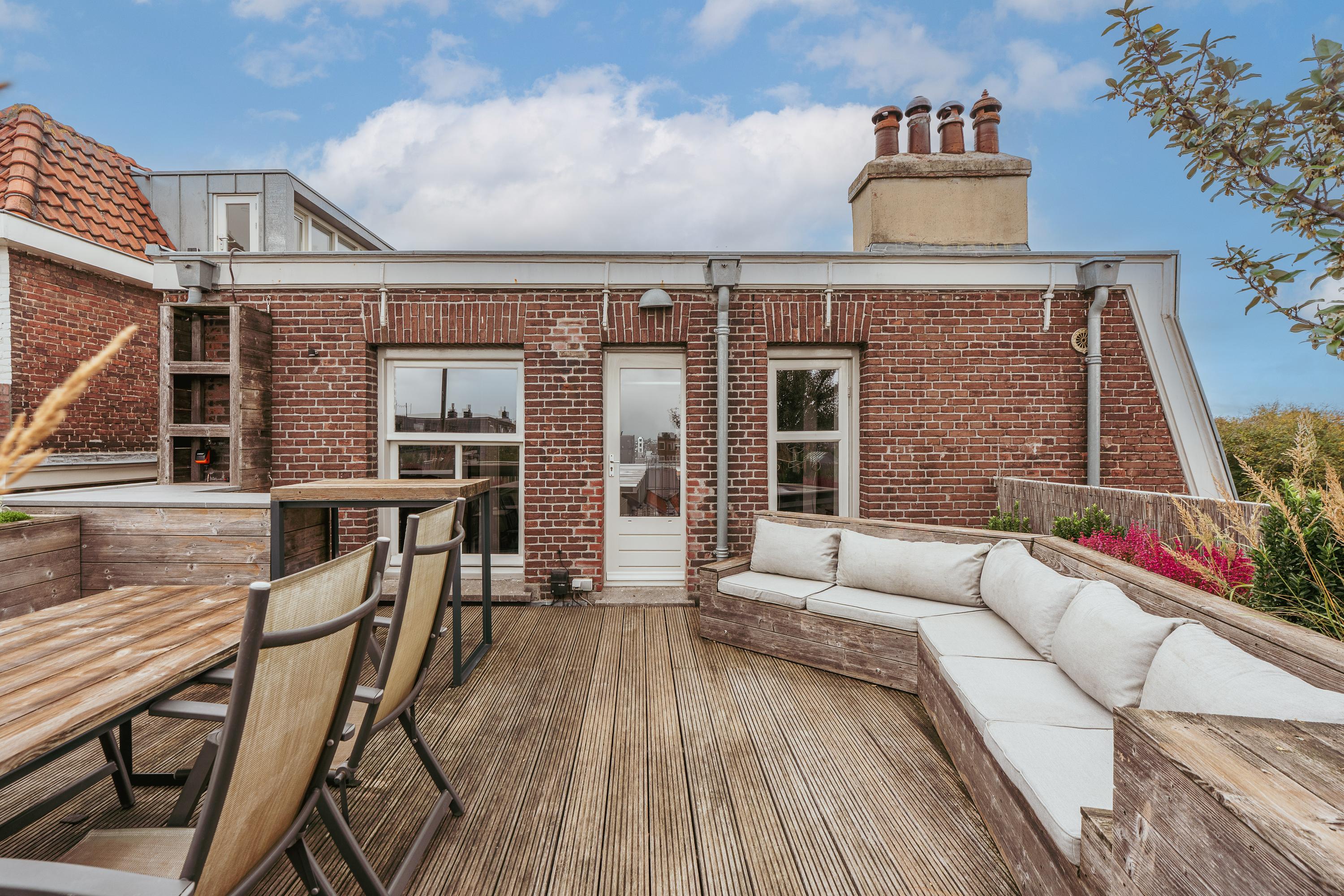 The open kitchen is centrally located and equipped with various built-in appliances, including an extractor hood, microwave, fridge-freezer, Quooker, sink, and dishwasher. A unique detail is that the bar, dining table, and wooden shelf behind the stove are all made from the same piece of oak (a rare feature nowadays, as trees of such large diameter are hardly found anymore). The table can be taken over free of charge, creating a harmonious and cohesive look throughout the living area. The kitchen also provides plenty of storage and forms the heart of the home. The apartment features two well-proportioned bedrooms, with the primary bedroom located at the front and the second bedroom at the quieter rear side. The modern bathroom, accessible from the hallway, is fitted with a walk-in shower, bathtub, toilet, and washbasin with vanity unit. From the same hallway, there is access to the spacious south-facing rooftop terrace of approximately 32 m², a peaceful spot to enjoy the sun and the view over the city. Additional built-in cupboards on the landing and in the living room offer extra storage space.