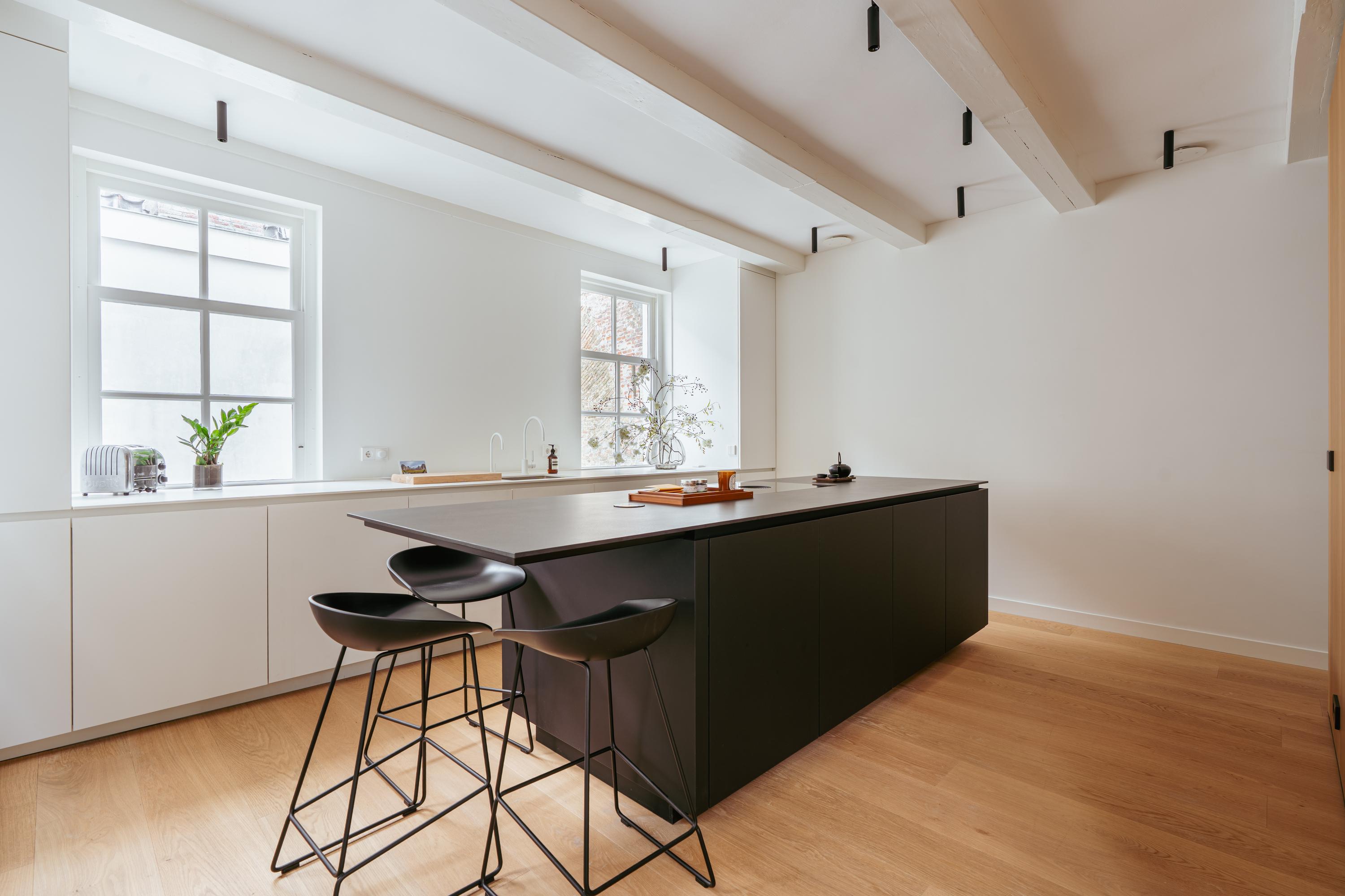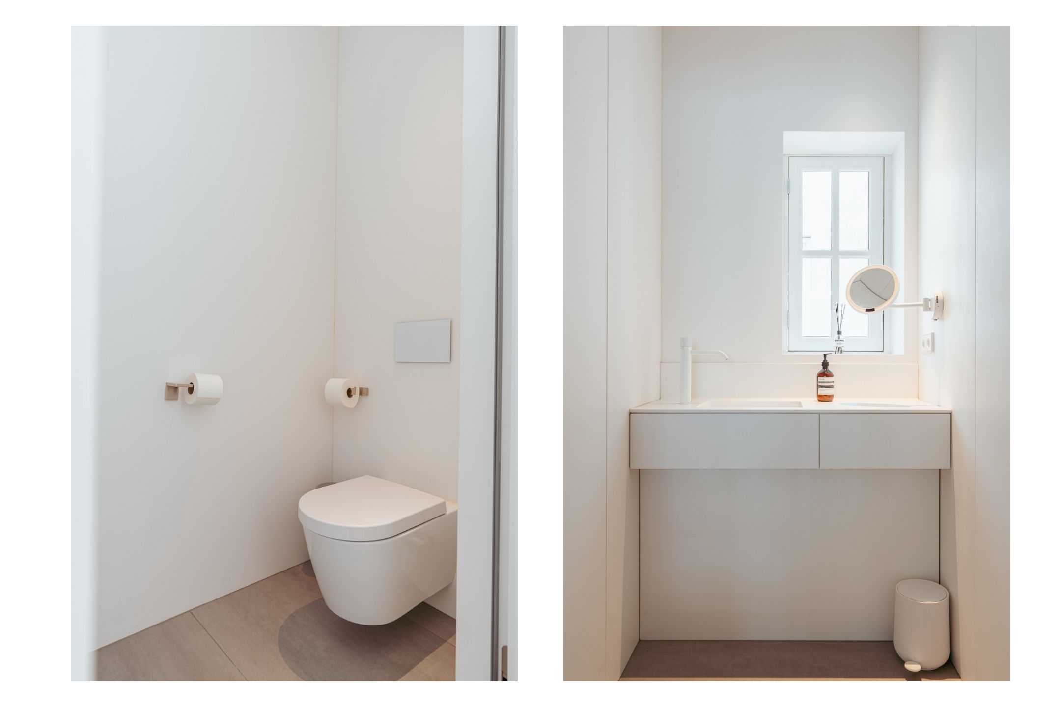 The entrance provides access to both the residence and the multifunctional commercial space on the ground floor. This space is finished with great attention to detail, exuding character through wooden elements, exposed ceiling beams, and high-quality materials. Large double doors at the front can be fully opened, creating an inviting look and allowing for ample natural light. Inside, the space is practical yet stylishly arranged. A compact but luxuriously finished kitchenette, a neat toilet, and a separate laundry and technical room complete this floor. A large skylight at the rear brings in abundant daylight, adding to the open and airy feel. Rear access to a private outdoor space is available, as well as a second entrance directly from the street — providing flexibility for use as a studio, home office, or practice space.