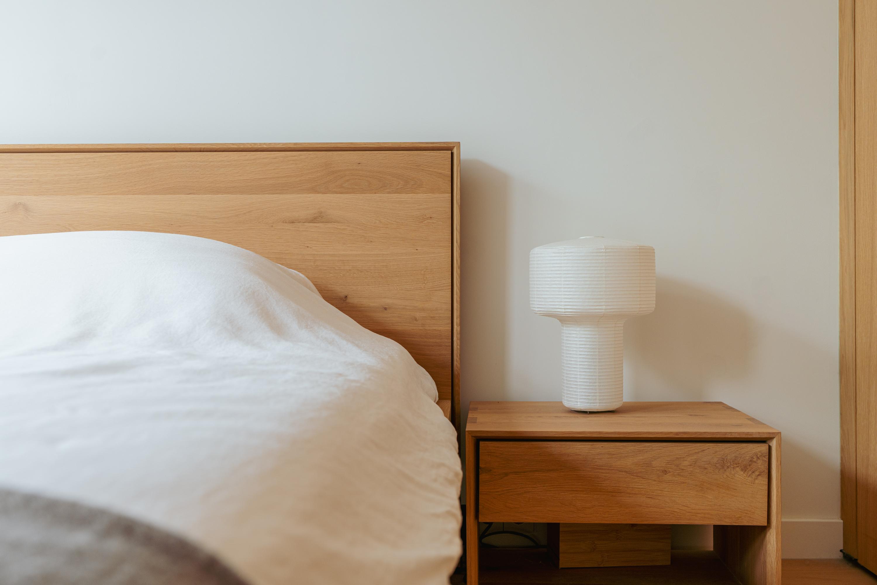 This upper floor is dedicated to a luxurious master suite — a private sanctuary of peace, space, and comfort. A central walk-in closet features custom cabinetry that is both functional and stylish. At the front is the cozy bedroom, where original ceiling beams and impressive ceiling height immediately draw the eye. Tall windows extending into the gable enhance the sense of openness and bring in wonderful natural light. Built-in wardrobes contribute to the clean, elegant look. At the rear lies the spectacular bathroom — a true wellness retreat at home. Here you’ll find a striking freestanding Agape Spoon Woodline bathtub, a double vanity with stylish cabinetry, a spacious walk-in shower, a steam cabin, and a built-in recliner for ultimate relaxation. The space is finished with warm materials and thoughtful design elements, including integrated lighting for a hotel-like atmosphere. Beautiful wooden sliding panels provide both shading and aesthetic appeal, offering privacy without blocking light. The toilet is separate from the bathroom.