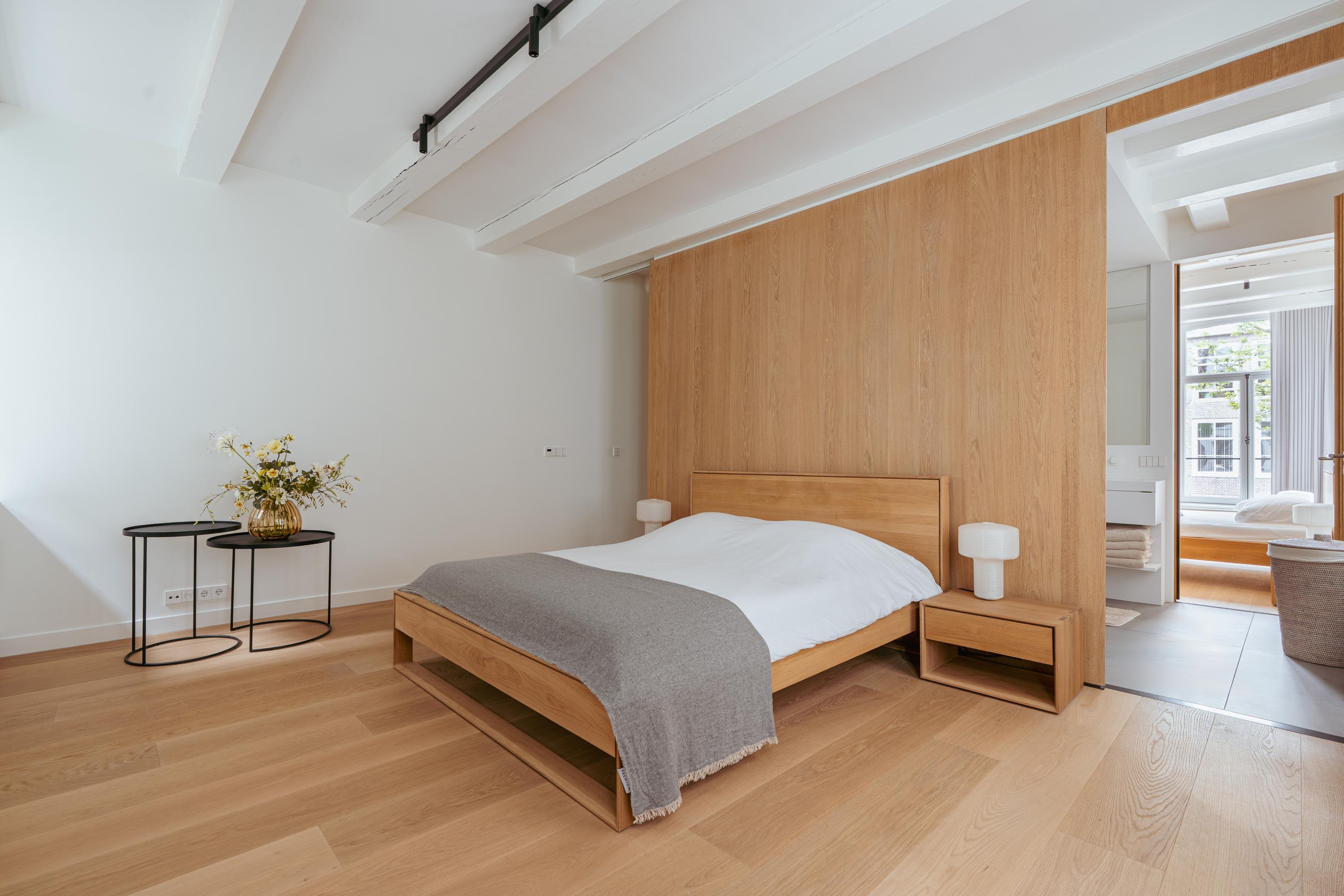 This floor is entirely dedicated to living and entertaining. At the rear is the modern kitchen — the heart of the home. It includes high-end built-in appliances: fridge, freezer, combi oven and microwave, Quooker tap, and a sleek induction cooktop with integrated extractor fan. Ample storage keeps the space minimalist and tidy. The centrally placed island includes a bar area for informal dining. At the front is the living area, where large windows offer a sweeping view over the canal. The combination of natural light, warm wooden floors, and subtle finishes create a calm, inviting ambiance. French doors open to a hallway with a separate toilet, and a staircase leads to the third floor.