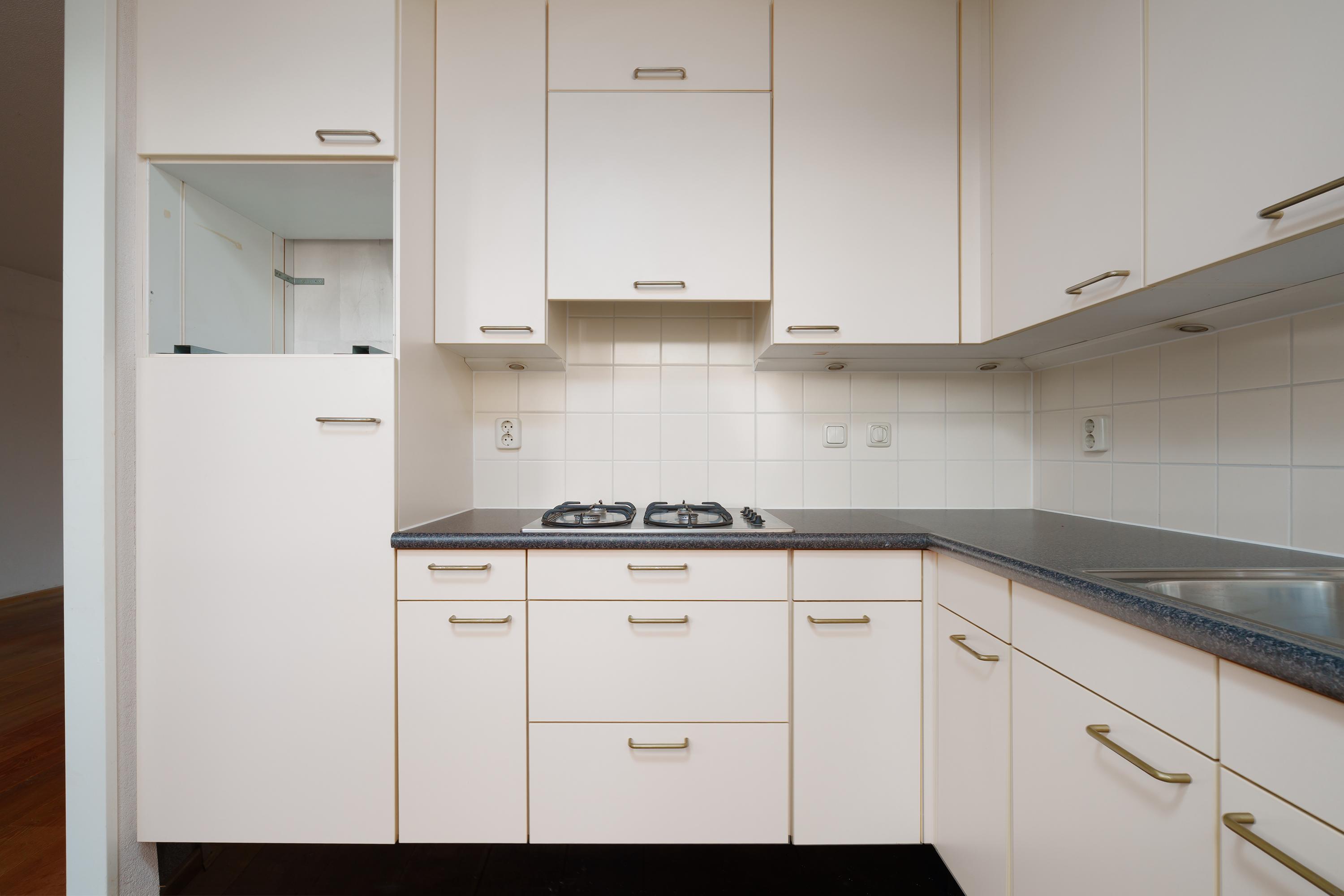 From the landing you reach the wide and bright living room. Thanks to large windows on both sides, daylight floods in. The open kitchen is located at the rear.