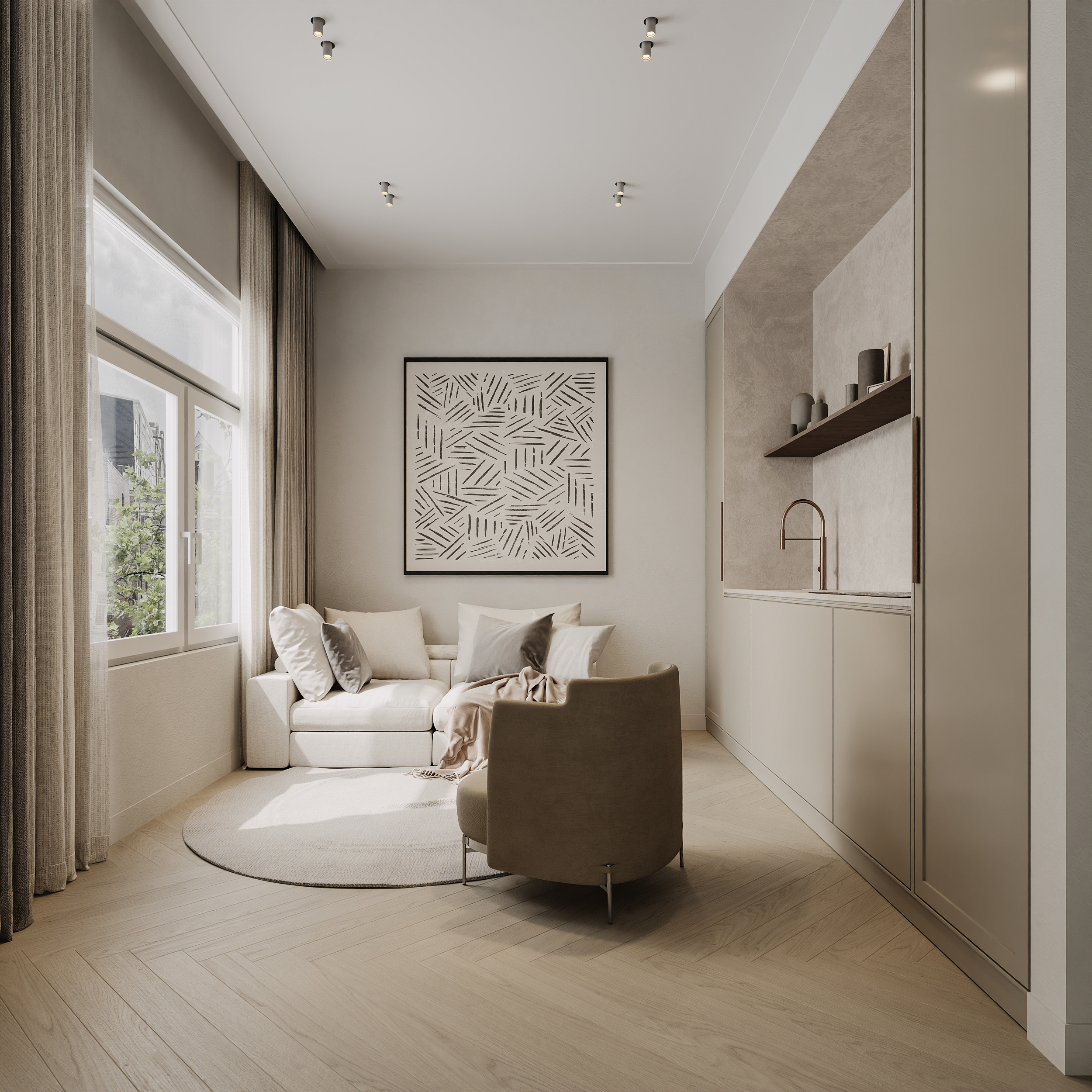 Please note: the photos shown are artist impressions (renders) and are intended to provide an impression of the atmosphere and possibilities of the home. The apartment will of course be delivered fully and high-end finished, including kitchen, bathrooms, and all fixed fittings.
