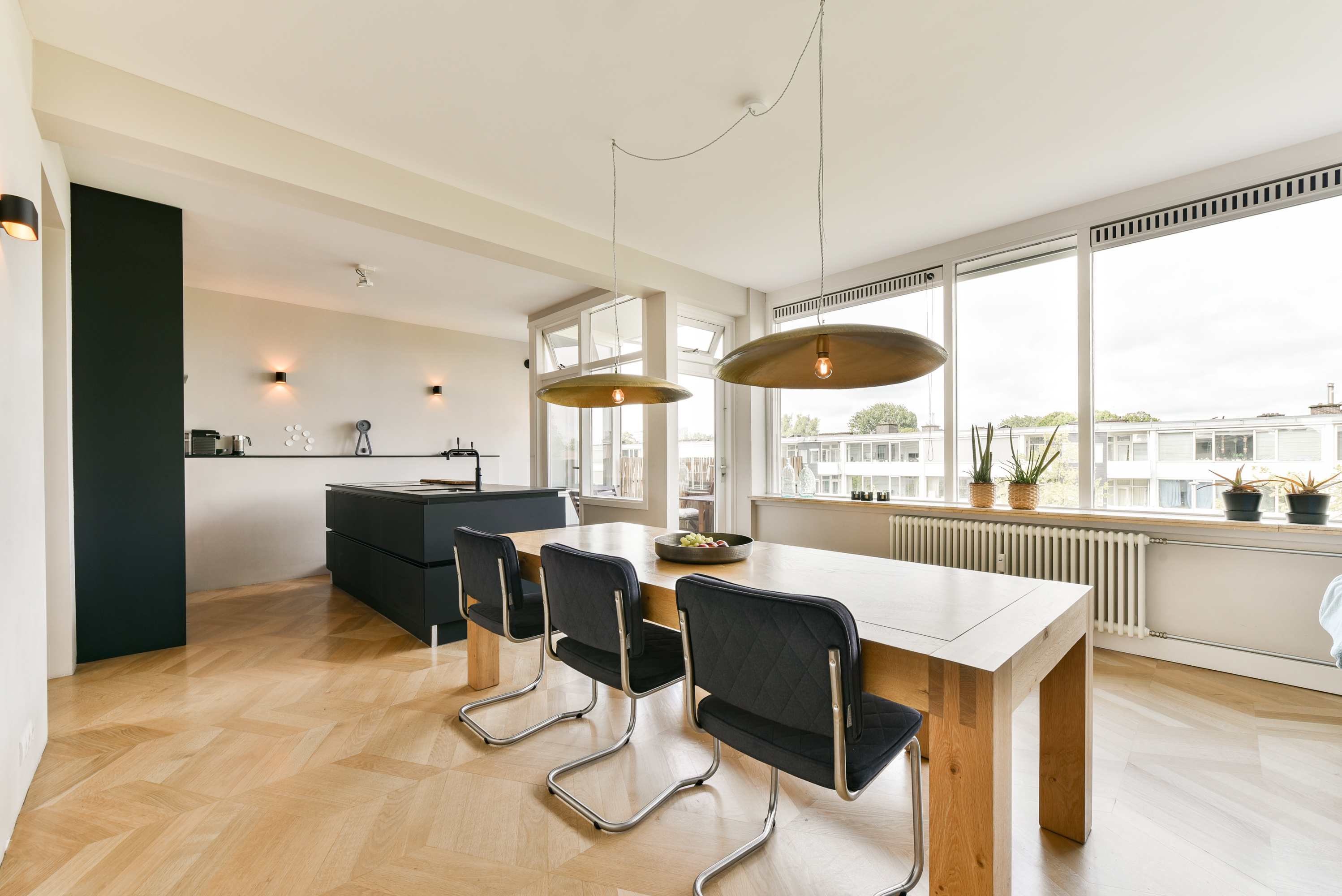 Upon entering, you are welcomed by a spacious hallway with an elegant parquet floor and practical built-in cupboards. The bright living area comprises a generous open-plan kitchen, dining space, and a comfortable lounge featuring a built-in wood-burning stove. The modern kitchen, finished in black Fenix, is equipped with a cooking island including an induction hob, oven, combi-oven, dishwasher, large refrigerator, and Quooker. Thanks to the glass façade and two French doors opening onto the west-facing balcony, the living room is bathed in natural light. The apartment offers three bedrooms. The master bedroom, located at the front of the apartment, features an entire wall of wardrobes, an original built-in cabinet with safe, and direct access to the balcony. The other bedrooms also enjoy access to the balcony. The luxurious bathroom is fitted with a rain shower, bathtub, double washbasin, and a second toilet. Additional built-in storage spaces are available throughout the apartment, including a spacious utility room with connections for a washing machine and dryer. The entire apartment is finished with a herringbone floor and atmospheric lighting by Zuiver. With large windows on both sides, the home enjoys abundant natural light throughout the day. Morning sun streams into the bedrooms, while in the afternoon and evening the kitchen and living area are filled with warm sunlight. This not only creates an exceptionally bright and airy atmosphere but also enhances the overall sense of space and comfort.