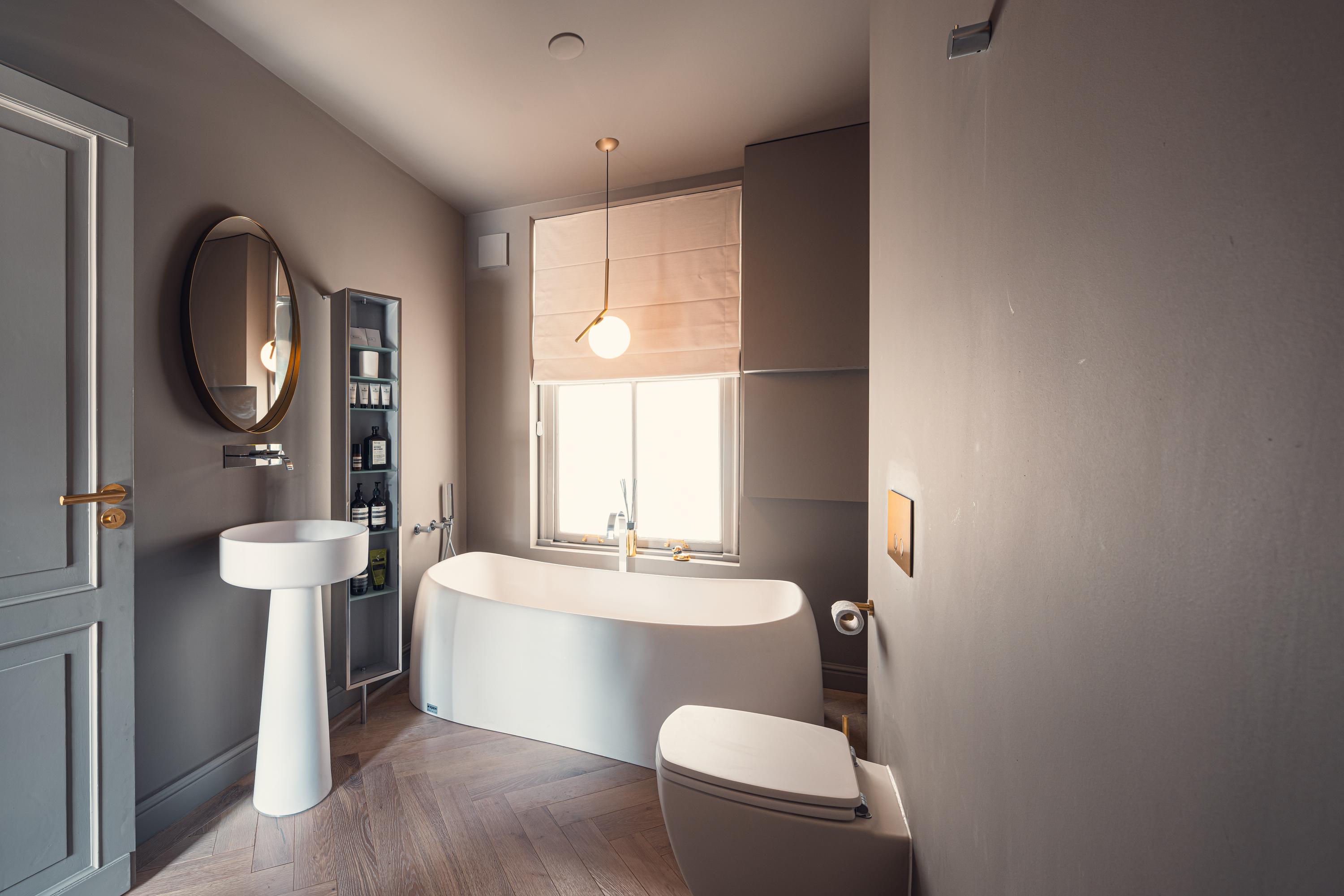 The bathroom features a freestanding bathtub, a large walk-in shower with rain shower, a modern toilet, and a stylish vanity. The soft tones, golden accents, and carefully chosen lighting together create a luxurious hotel-like atmosphere.