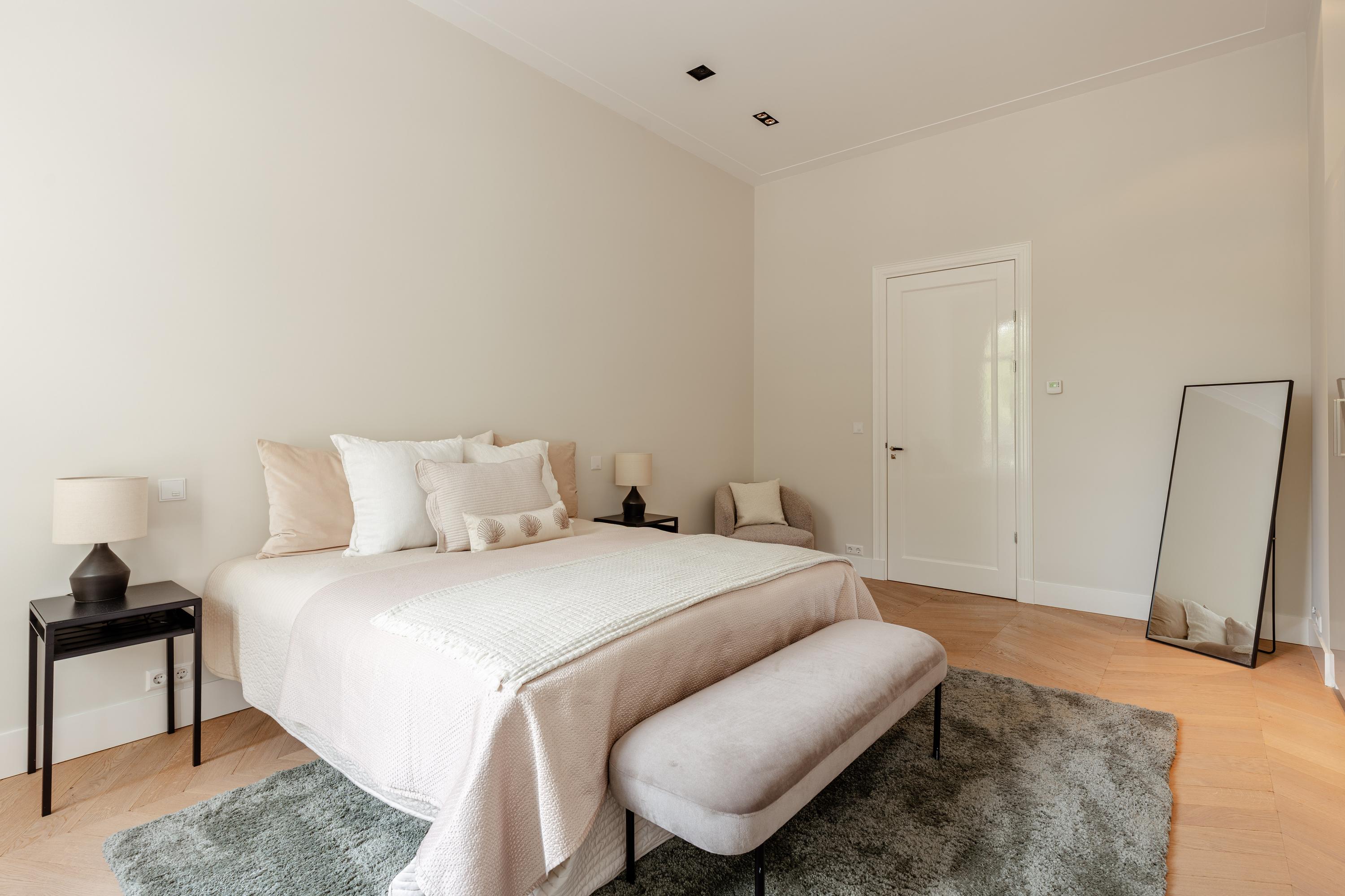 Accessible via the elevator or through the private entrance on the first floor, you are welcomed into the impressive main living level. The spacious living room immediately stands out, featuring large windows that flood the space with natural light and create an elegant atmosphere. At the front lies the luxurious open kitchen, a true eye-catcher, complete with a generous cooking island with wine climate cabinet, double sink with Quooker, and top-quality built-in appliances: two ovens, a full-size refrigerator, and a separate freezer. Designed to meet the needs of the culinary enthusiast, this kitchen forms the vibrant heart of the home. From here, you have access to the balcony adorned with original stained-glass windows – the perfect spot for a relaxed breakfast in the morning sun. This floor also offers a cloakroom and a separate guest toilet.