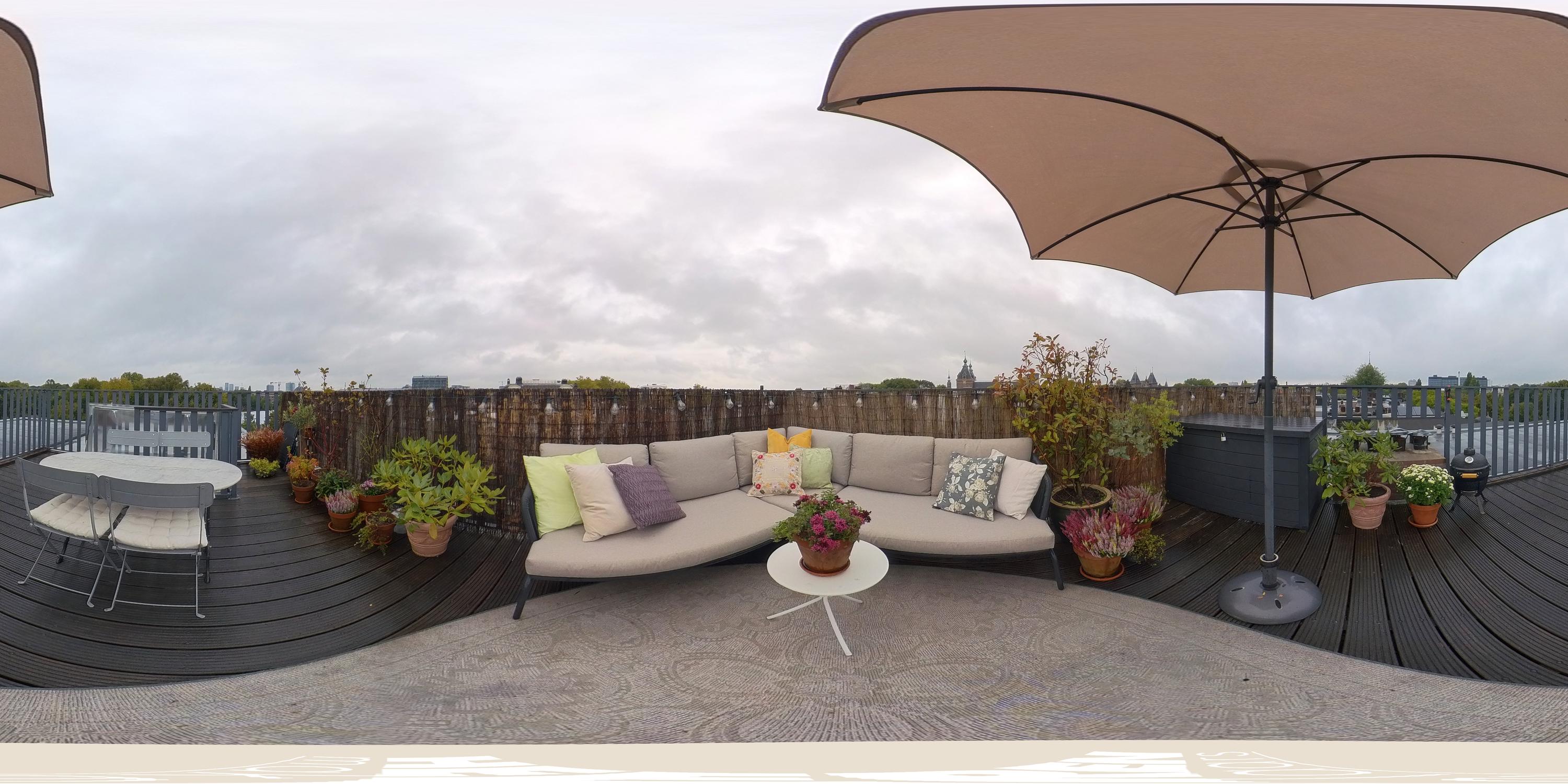 A fixed staircase leads to the unique roof terrace of approx. 26 m² – a true oasis in the city. Spacious enough for both a dining table and lounge area, and surrounded by greenery, it offers privacy, peace, and sweeping views over Amsterdam.