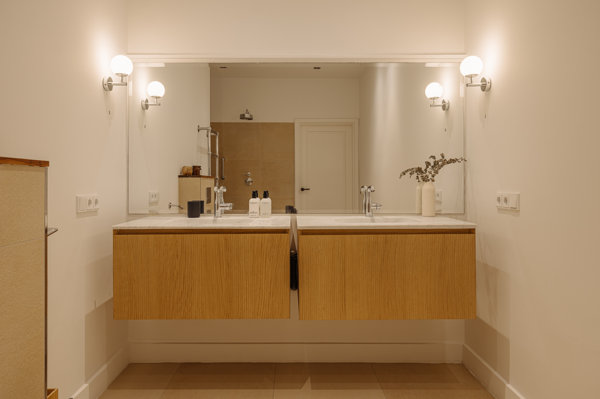 The apartment is entered via an ample hall that creates an immediate sense of space and elegance. The hall also gives access to a separate guest toilet and all the property’s other rooms. A large living room with a semi-open kitchen can be found on the right. The bedrooms and bathrooms are on the left.