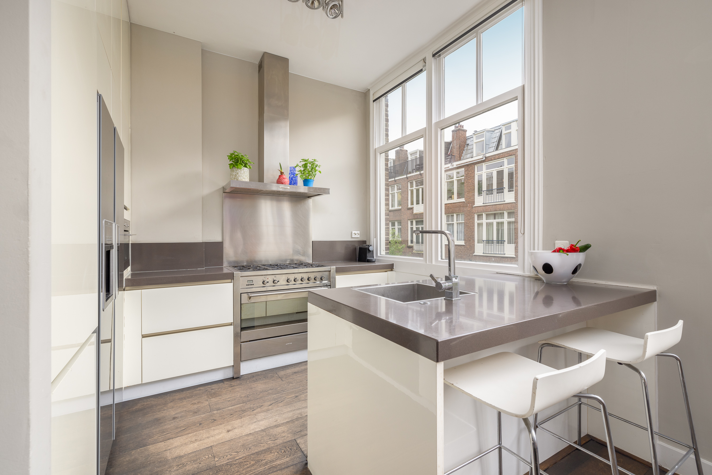 On the landing, you will find a separate toilet with a sink. From the landing, you have access to the spacious through-living room. At the front of the living room, there is enough space for both a formal sitting area and a cozy TV corner. There is also a beautiful balcony with a view of Valeriusstraat and Amstelveenseweg. At the rear of the house is the dining area, open kitchen with island, and a French balcony. The kitchen is equipped with a 5-burner gas stove, oven, microwave, and a fridge/freezer combination. Due to the abundance of glass and the ceiling height of 3.07 meters, this floor is particularly light and spacious.