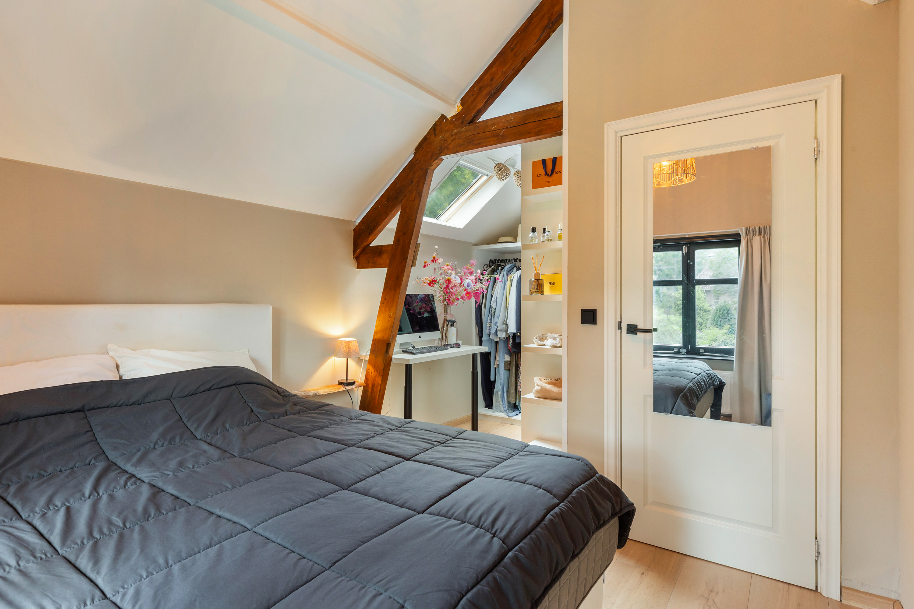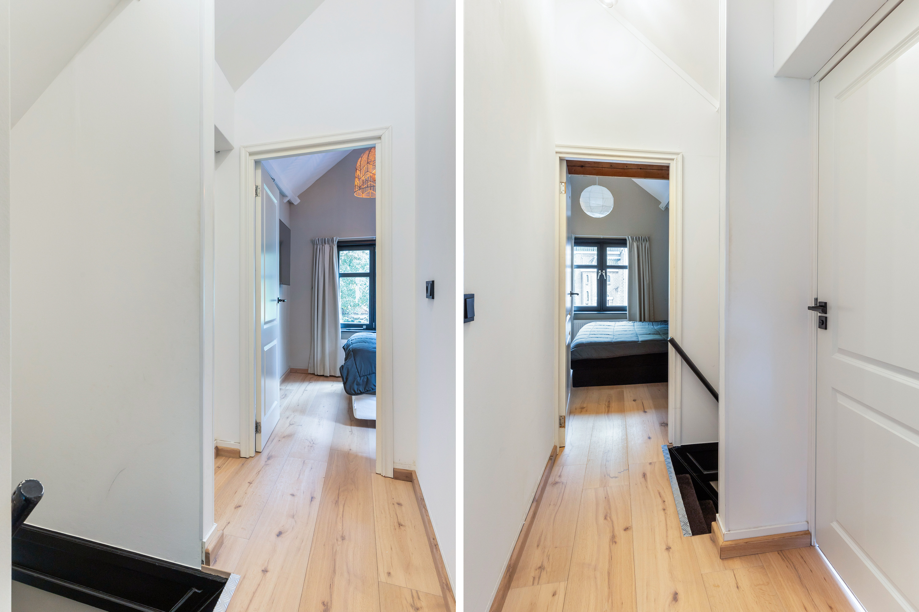De verdieping is volledig heringedeeld en biedt nu twee ruime slaapkamers die beide geschikt zijn voor een tweepersoonsbed. Daarnaast is er een praktische inloopkast. De luxe badkamer is stijlvol uitgevoerd en voorzien van vloerverwarming, een inloopdouche, ligbad, toilet en een wastafelmeubel met dubbele waskommen.