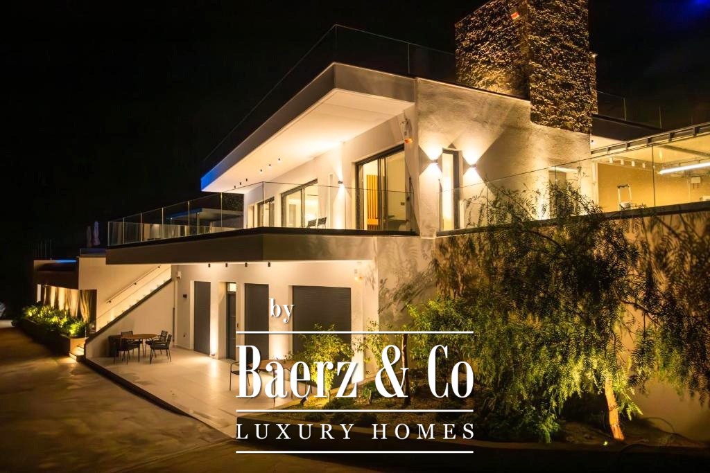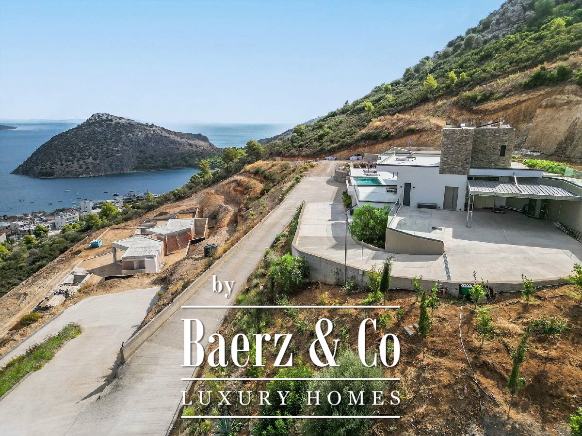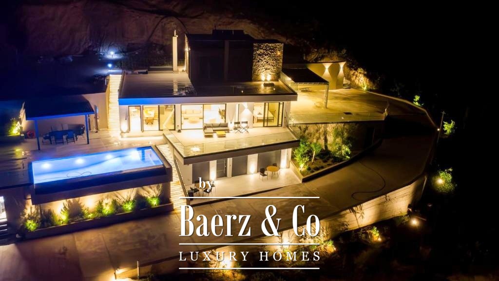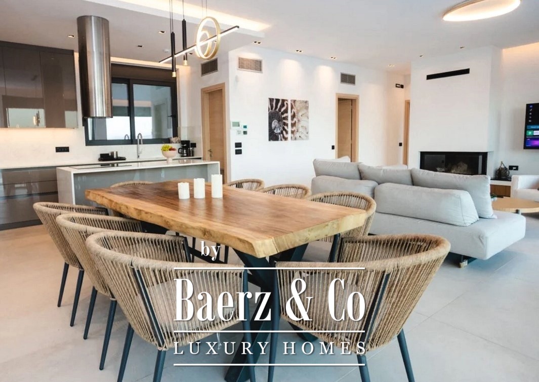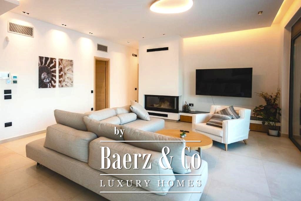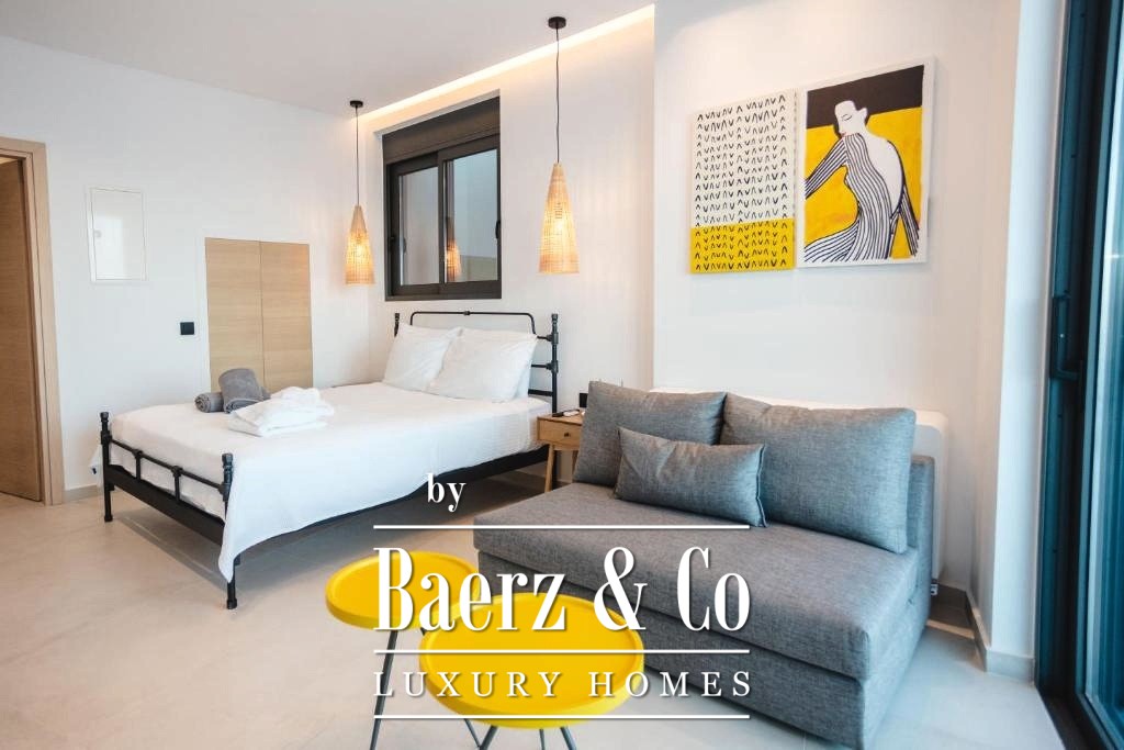 a spacious and bright living area with a fireplace, a fully equipped kitchen, a large bedroom and a luxurious bathroom, all decorated with modern touches that enhance the feeling of luxury. Upper Level: A separate apartment is available, 30 sq.m., with stone aesthetics and independent entrance, complete with kitchen, living room and bedroom. The exterior spaces are designed for social events and gatherings, with large open terraces and windows that ensure maximum exploitation of natural light and sea views. It is a unique proposal for anyone looking for a space that offers absolute privacy, unparalleled views and high aesthetics combined with modern comfort.