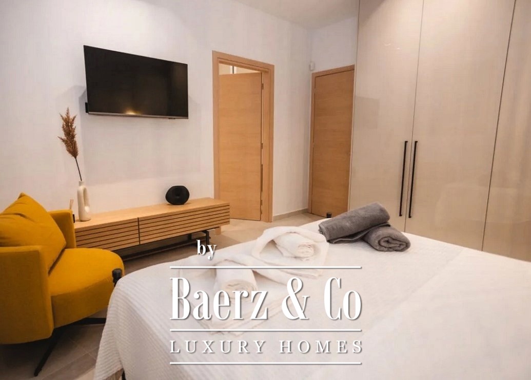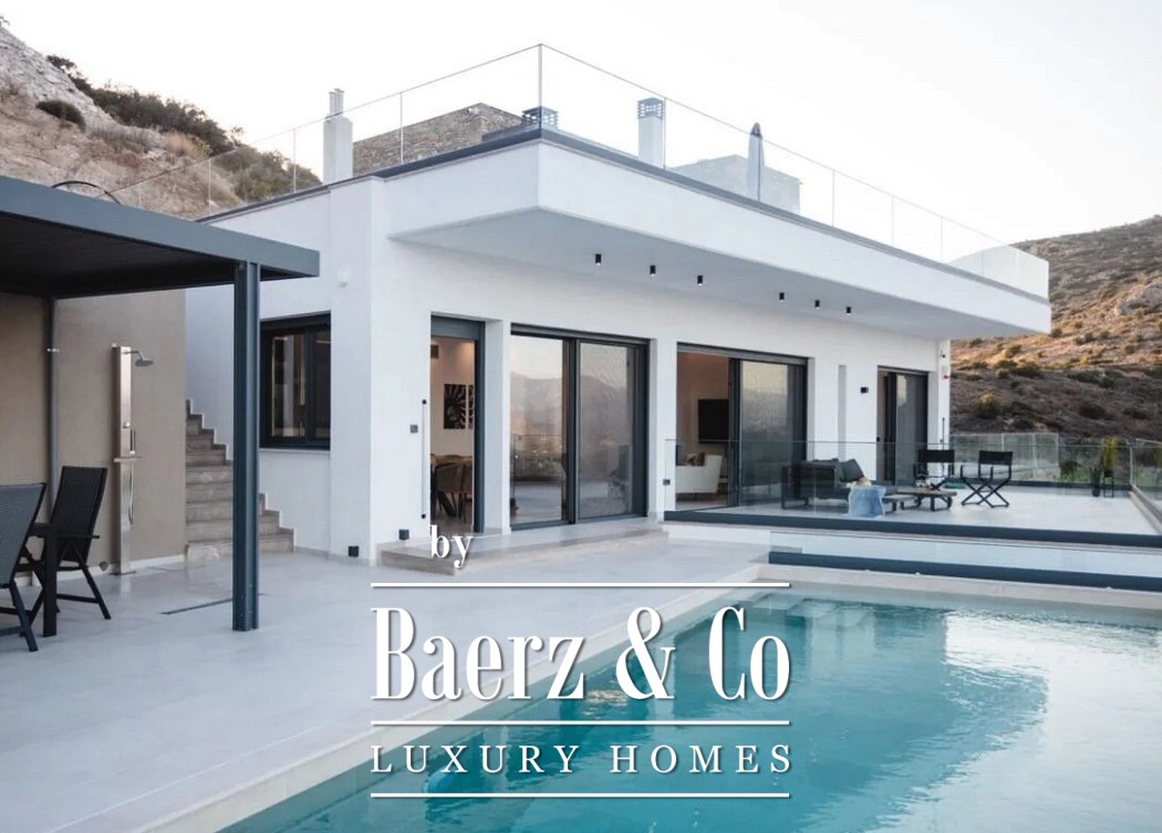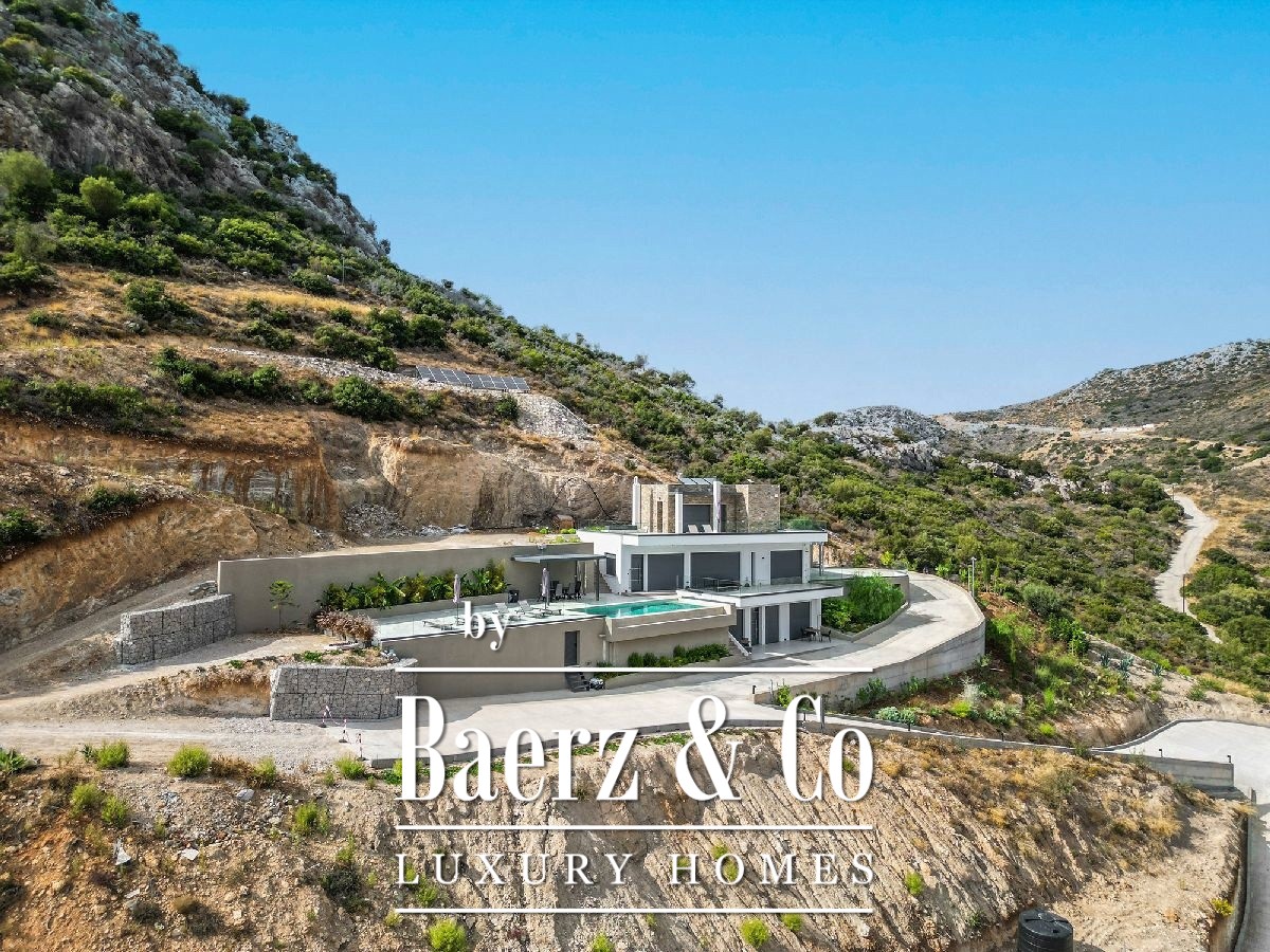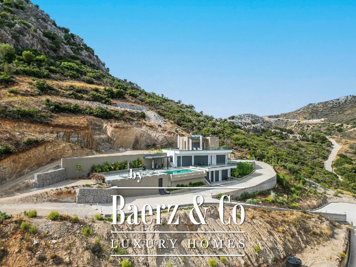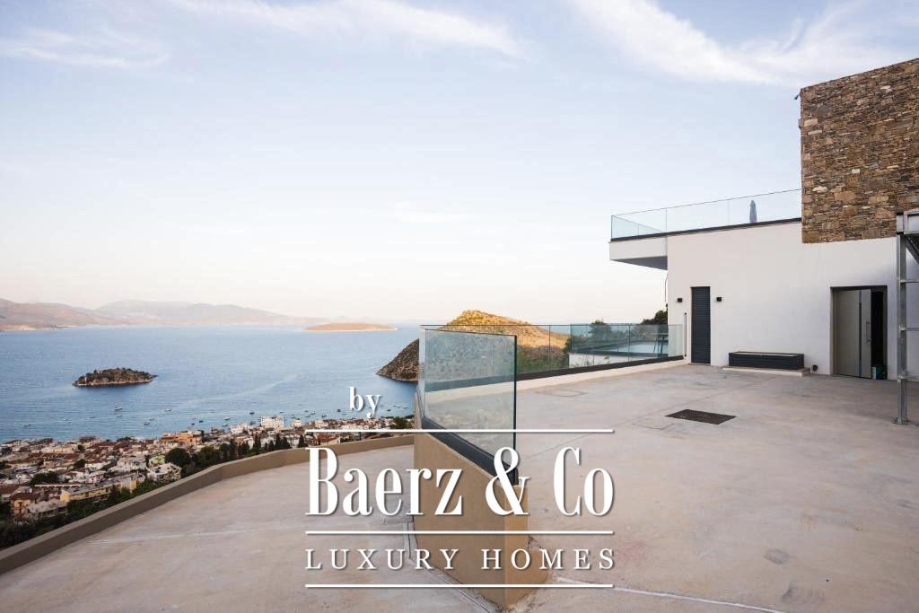 a spacious and bright living area with a fireplace, a fully equipped kitchen, a large bedroom and a luxurious bathroom, all decorated with modern touches that enhance the feeling of luxury. Upper Level: A separate apartment is available, 30 sq.m., with stone aesthetics and independent entrance, complete with kitchen, living room and bedroom. The exterior spaces are designed for social events and gatherings, with large open terraces and windows that ensure maximum exploitation of natural light and sea views. It is a unique proposal for anyone looking for a space that offers absolute privacy, unparalleled views and high aesthetics combined with modern comfort.