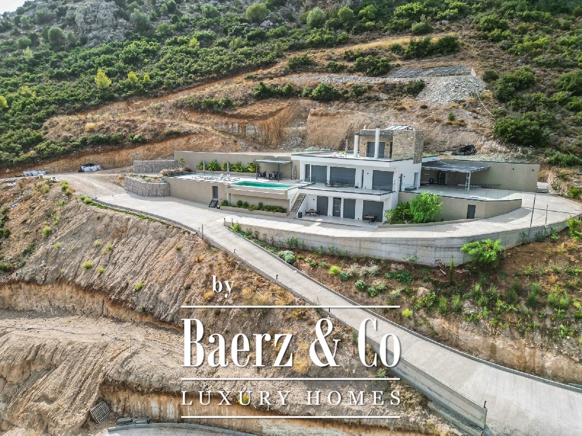 An impressive villa for sale, a combination of modern luxury and traditional aesthetics, with an unobstructed view of the endless blue sea of Tolos and absolute privacy. The residence has a total area of 250 sq.m. and is located on a fenced plot of 5,000 m2, which features outdoor spaces designed for comfort and relaxation, with an impressive swimming pool, lush gardens and specially designed living areas that enhance the sense of luxury. Ground Floor: Includes two independent apartments, with plenty of natural light and a unique view of the sea, each with a bedroom, living room with integrated kitchen and bathroom. Mid Level: The main house offers