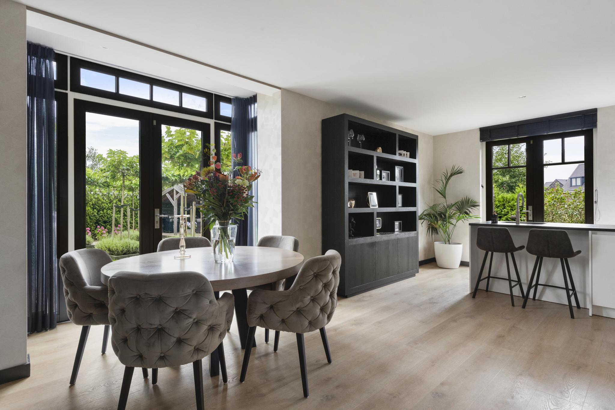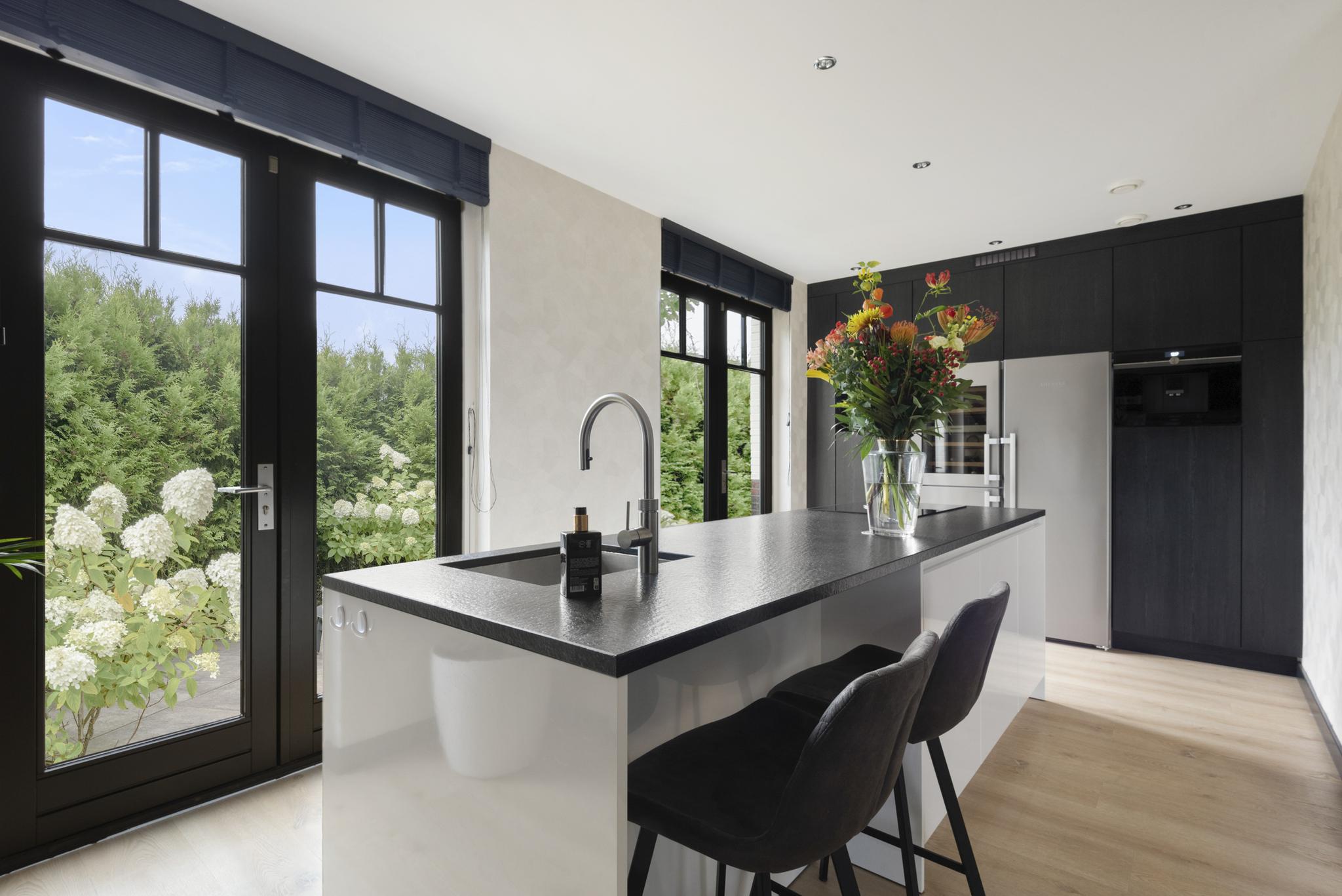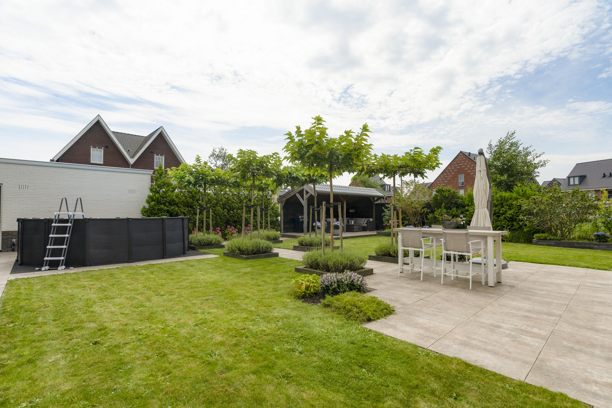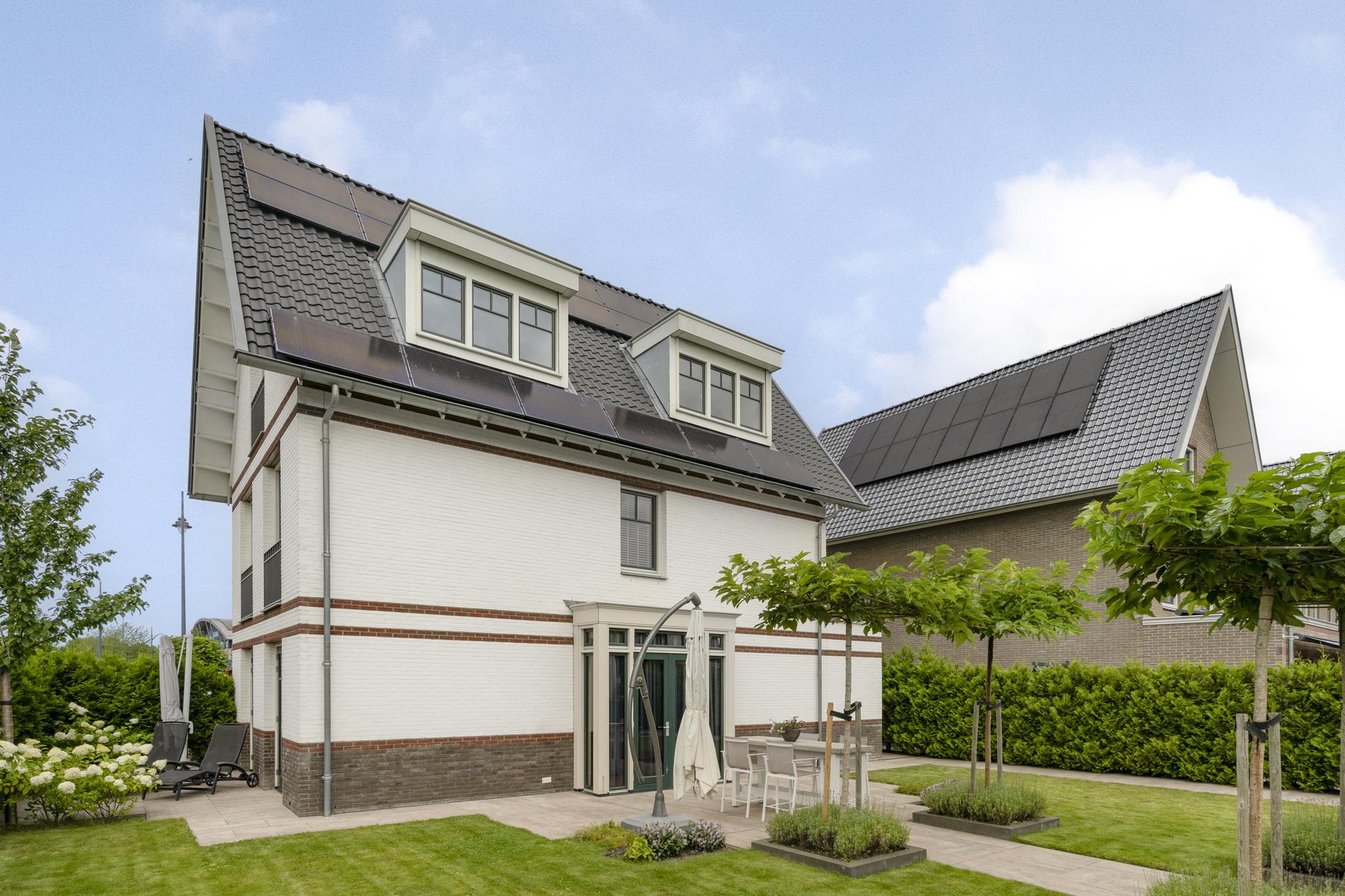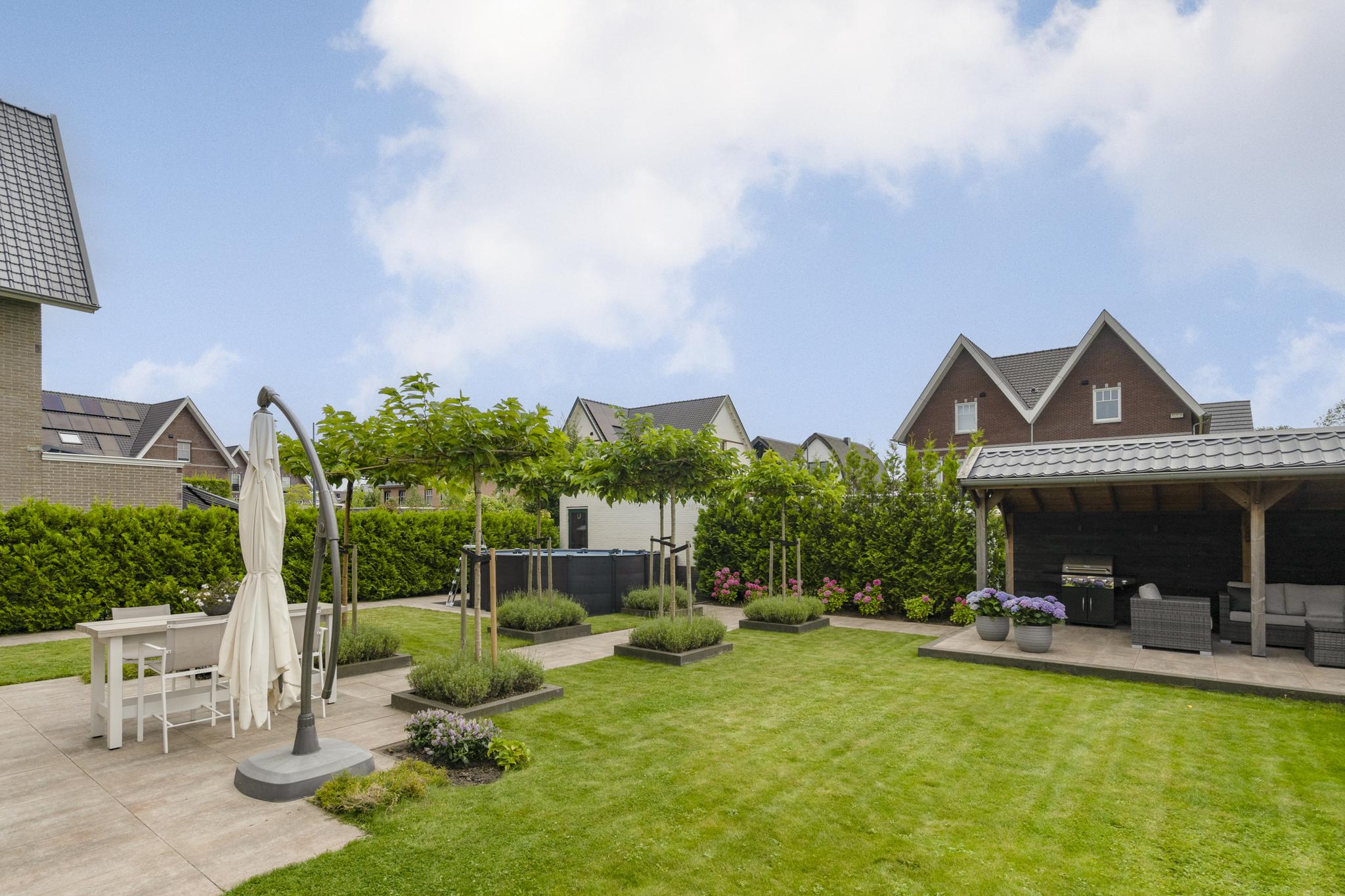With a living area of no less than 181 m², 4 spacious bedrooms, 2 luxurious bathrooms and an attractive kitchen/diner, this is a dream home for families looking for comfort and style. The villa, built in 2020, radiates warmth and luxury and is finished in detail. The sunny southeast-facing garden offers a lot of privacy and space, so you can enjoy yourself in peace. There is also a detached canopy with lounge area and a beautiful swimming pool. The house also has a spacious garage and parking for several cars on site.
