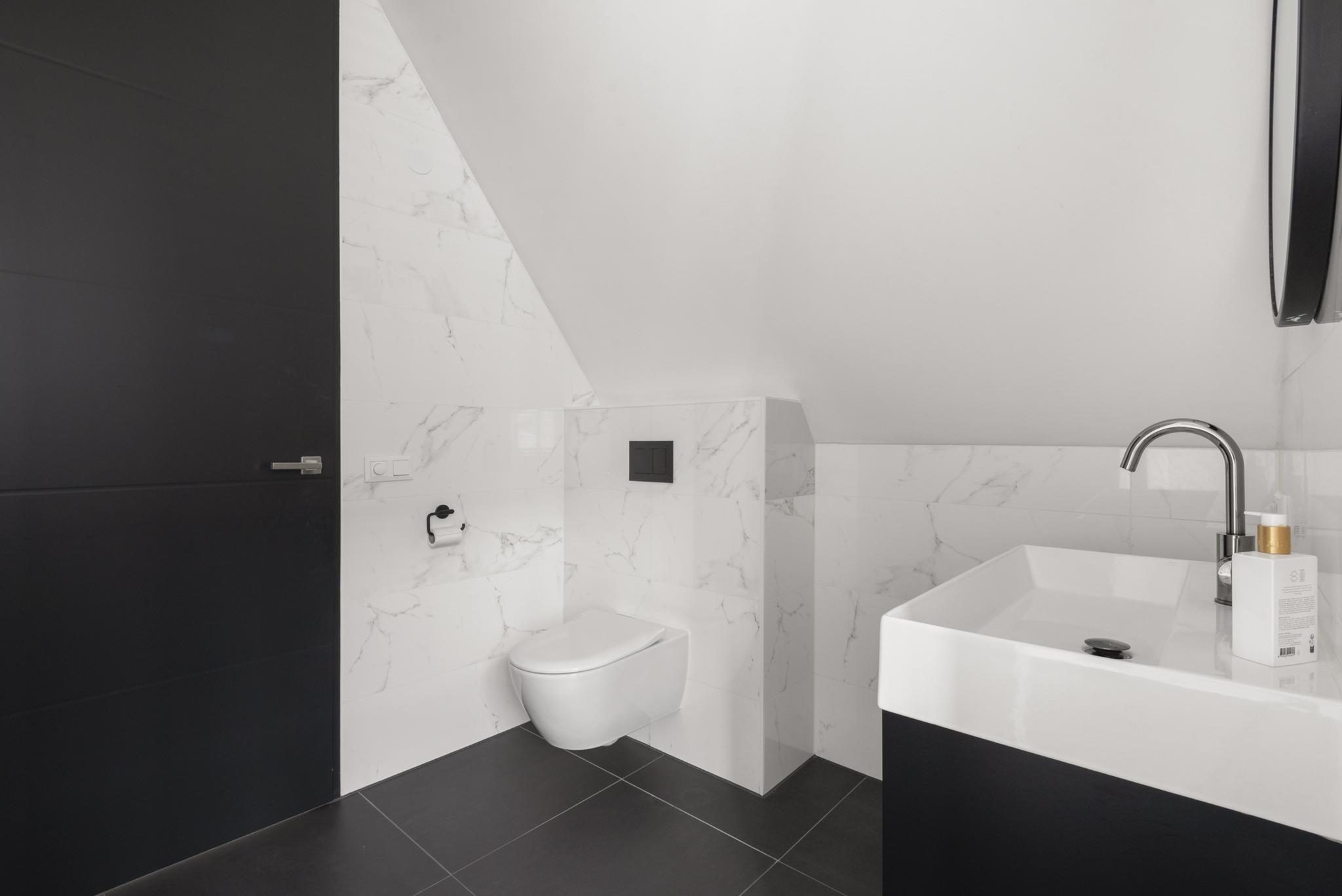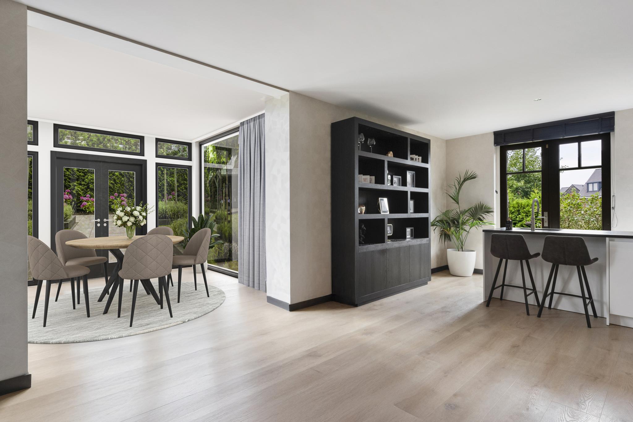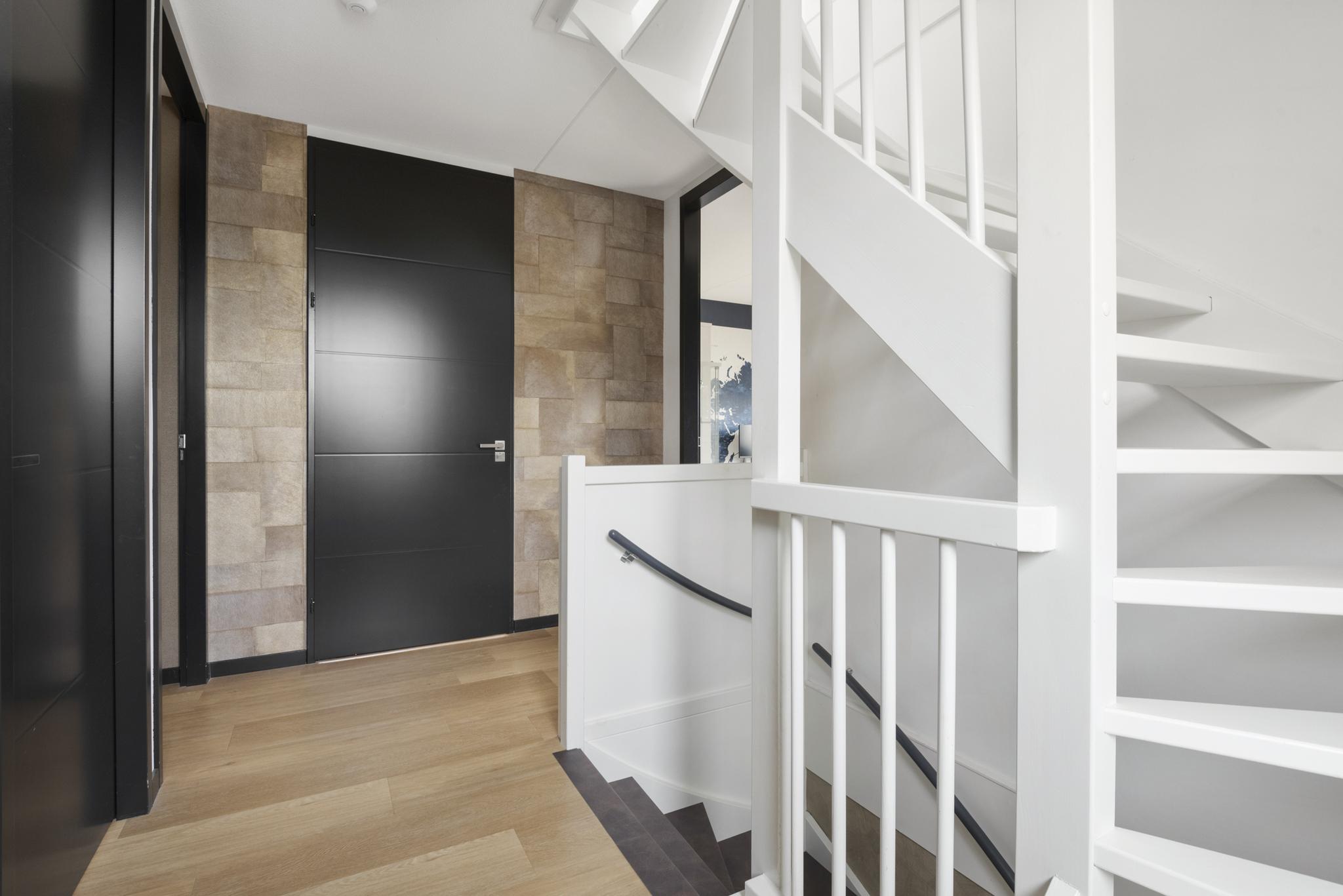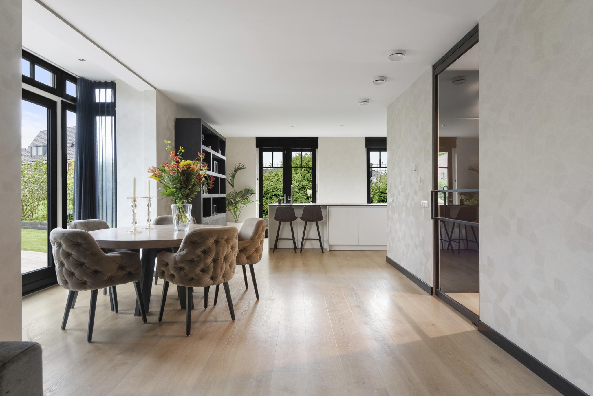 Upon entering, you are welcomed into a spacious hallway with a cloakroom area, a stylish staircase with leather-covered steps and a modern toilet. The ground floor features a sleek PVC floor with underfloor heating and cooling. From the hallway, you have a direct view of the large backyard, which immediately gives a sense of openness.