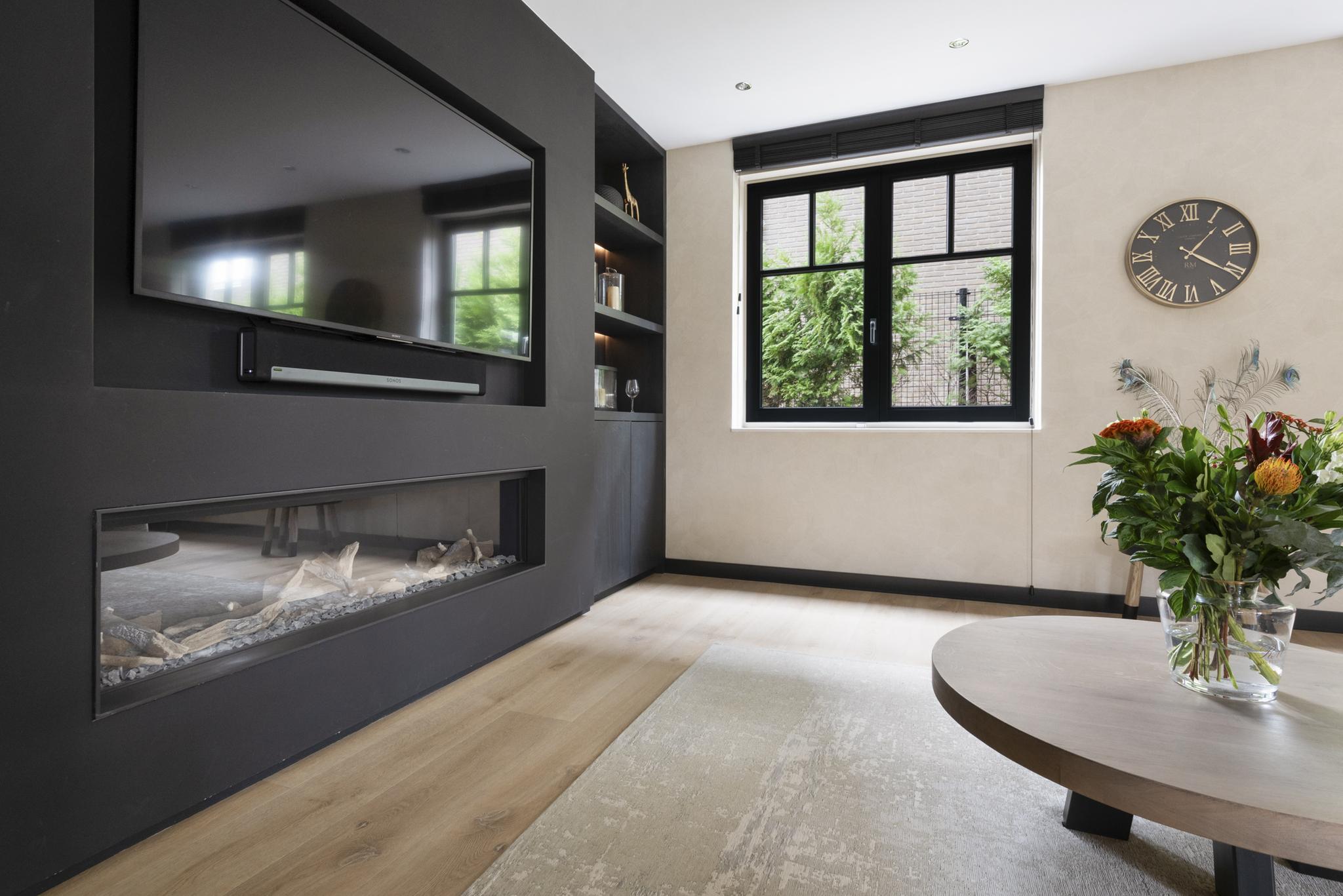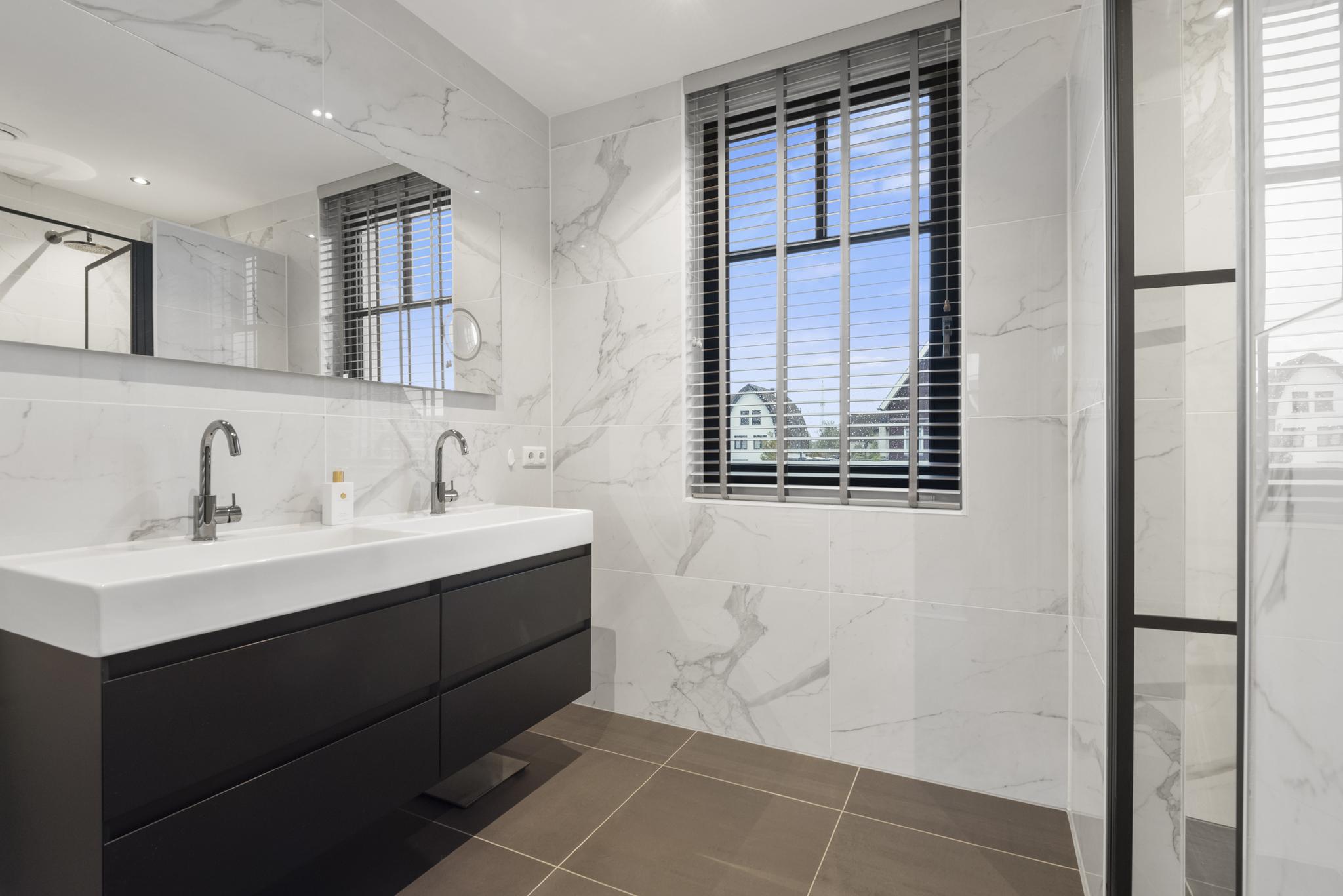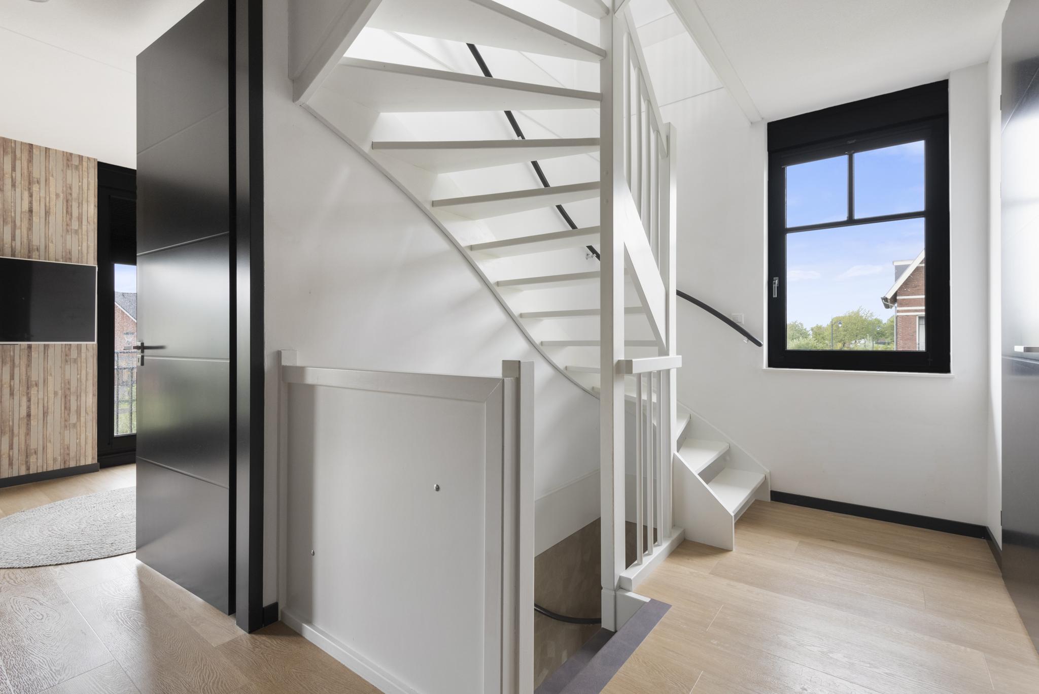 Upon entering, you are welcomed into a spacious hallway with a cloakroom area, a stylish staircase with leather-covered steps and a modern toilet. The ground floor features a sleek PVC floor with underfloor heating and cooling. From the hallway, you have a direct view of the large backyard, which immediately gives a sense of openness.