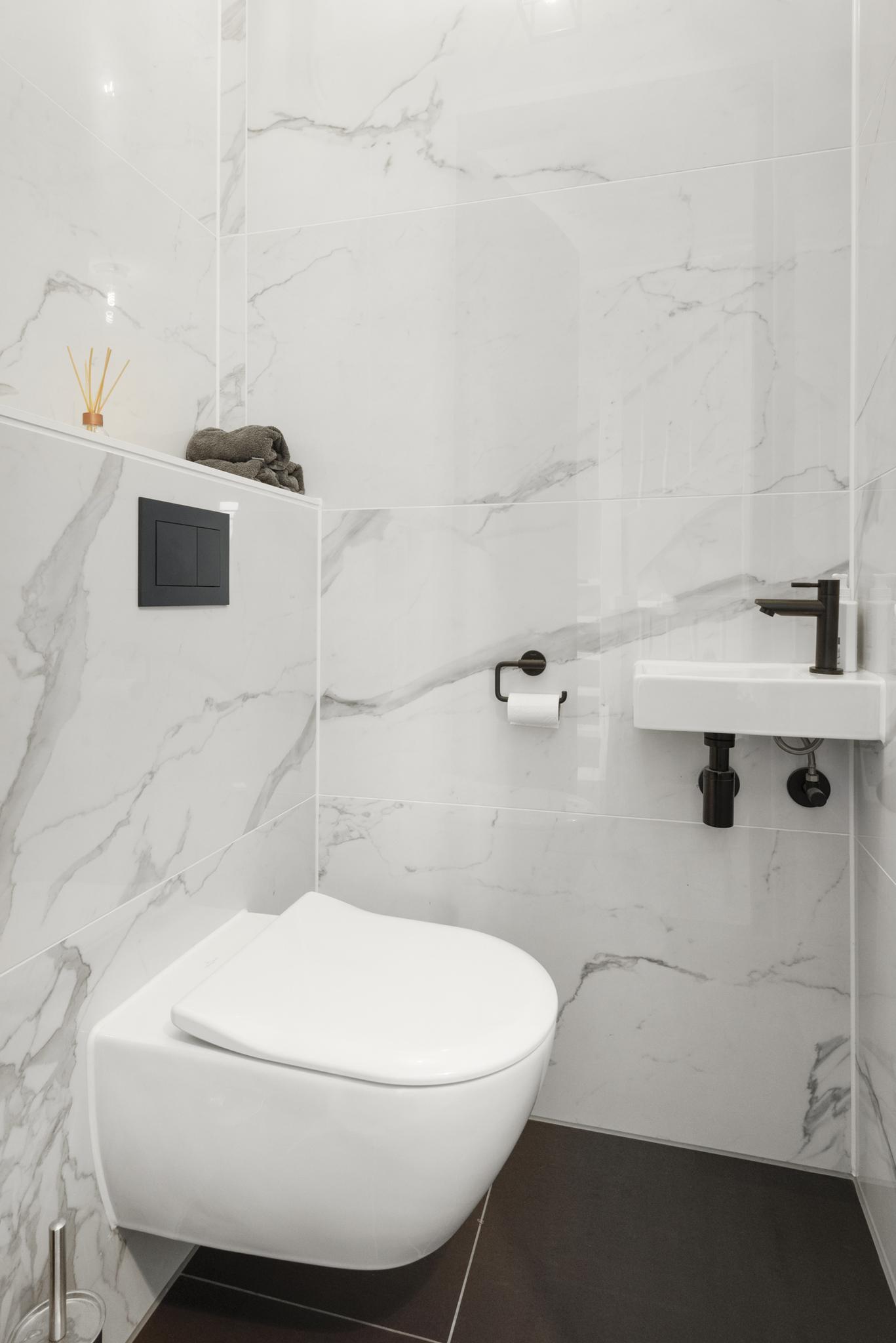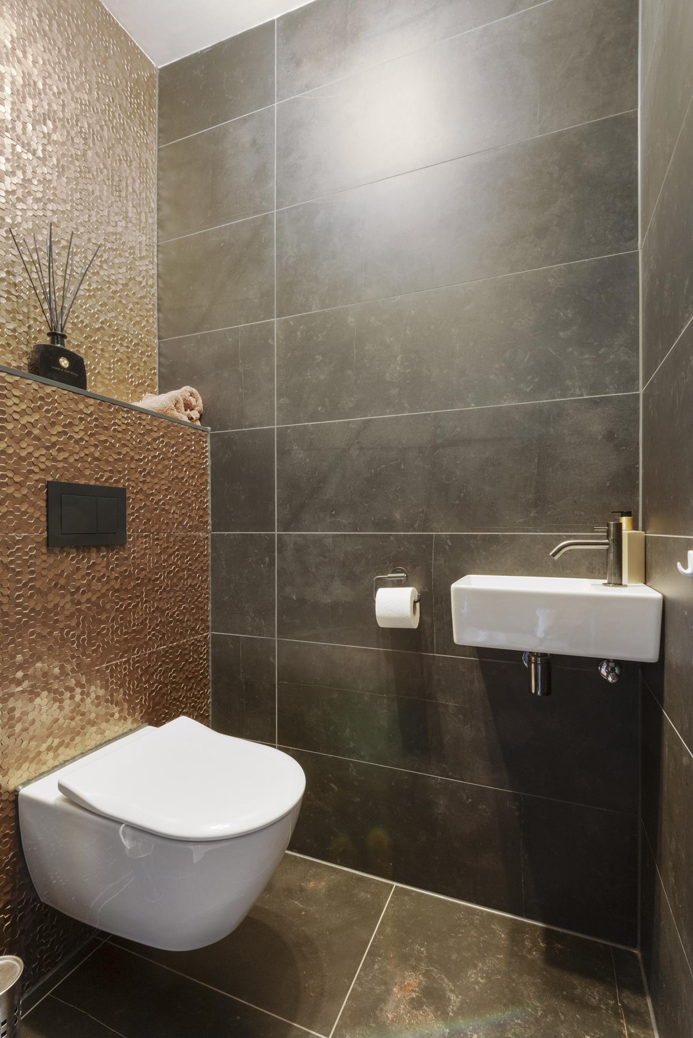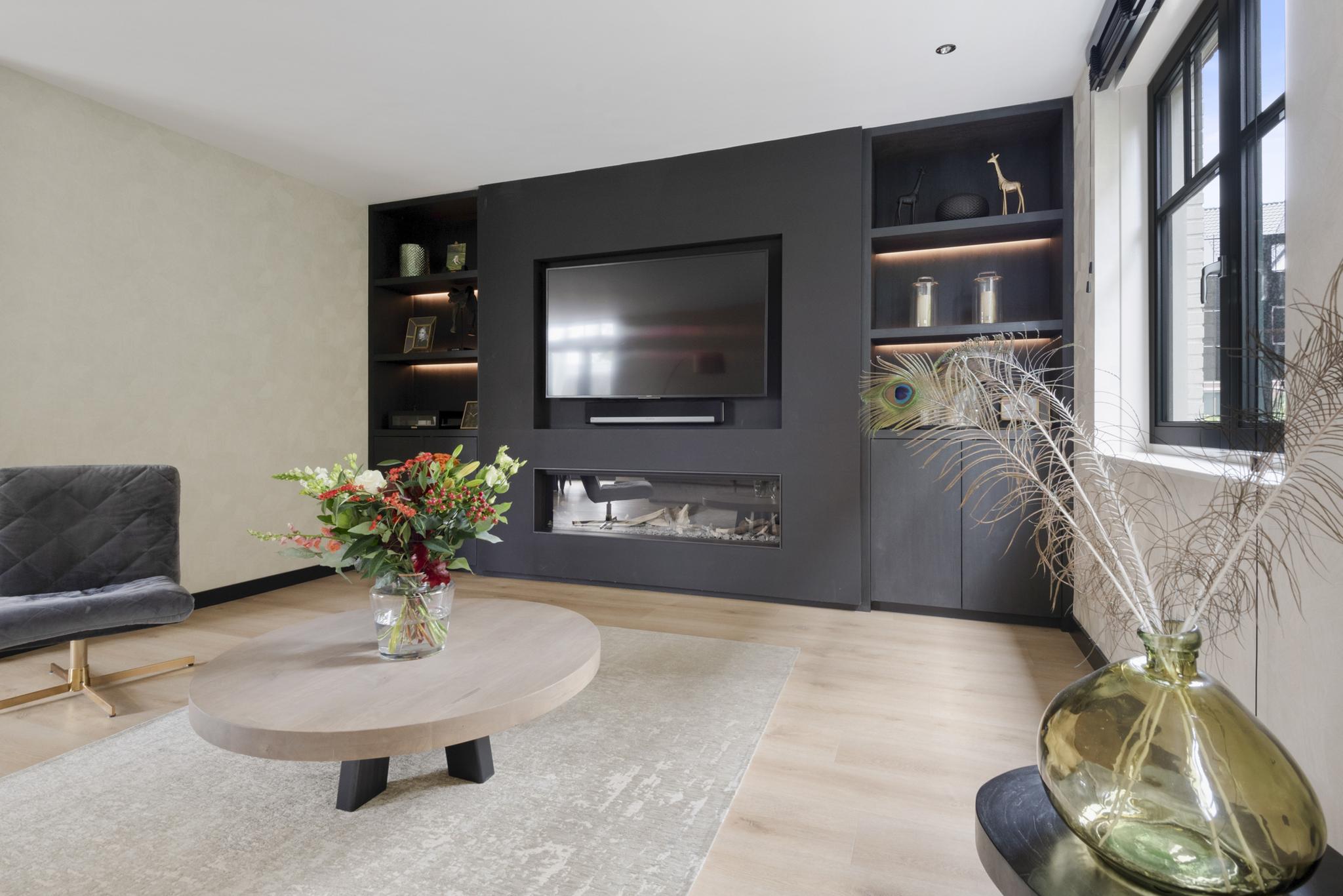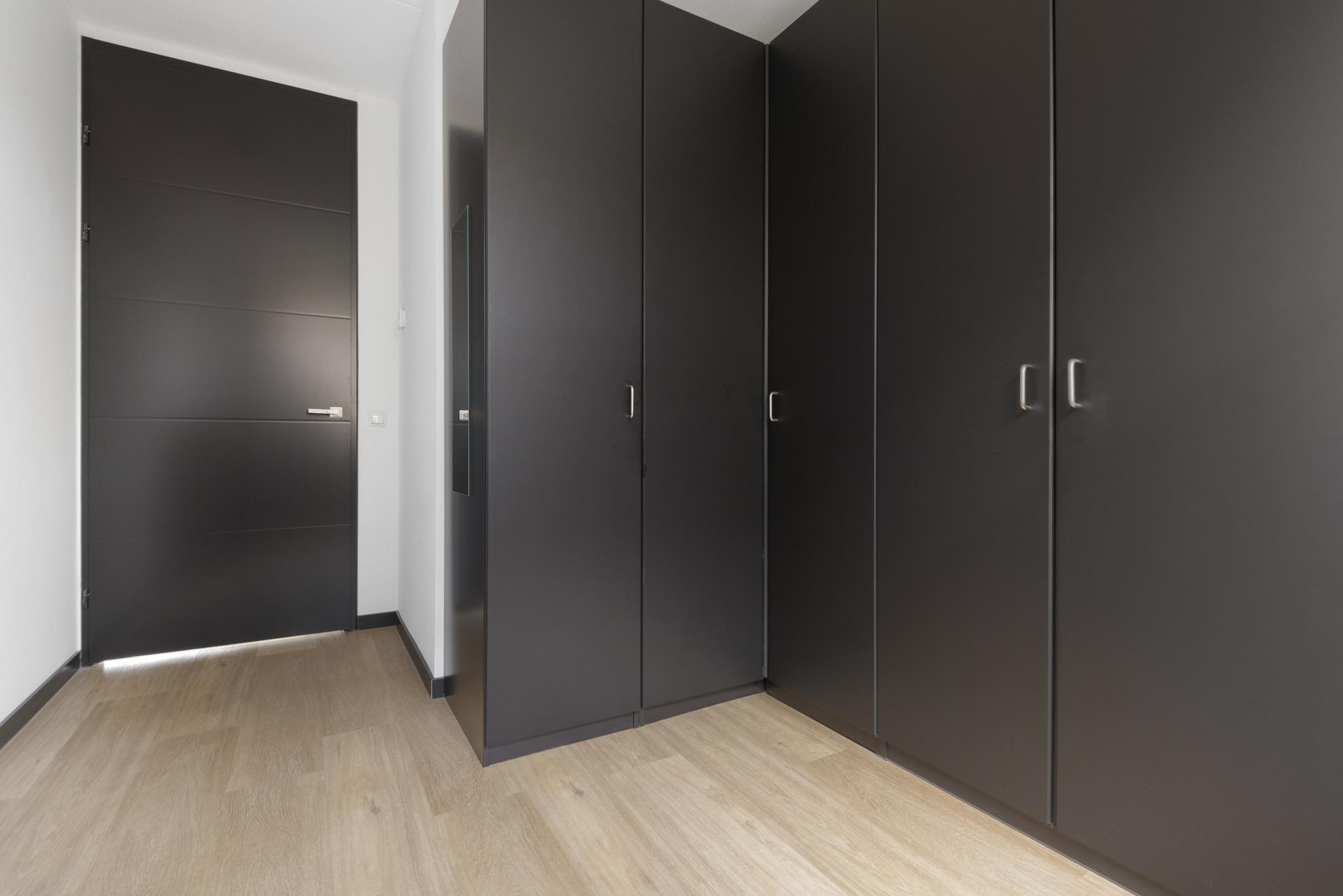 Upon entering, you are welcomed into a spacious hallway with a cloakroom area, a stylish staircase with leather-covered steps and a modern toilet. The ground floor features a sleek PVC floor with underfloor heating and cooling. From the hallway, you have a direct view of the large backyard, which immediately gives a sense of openness.