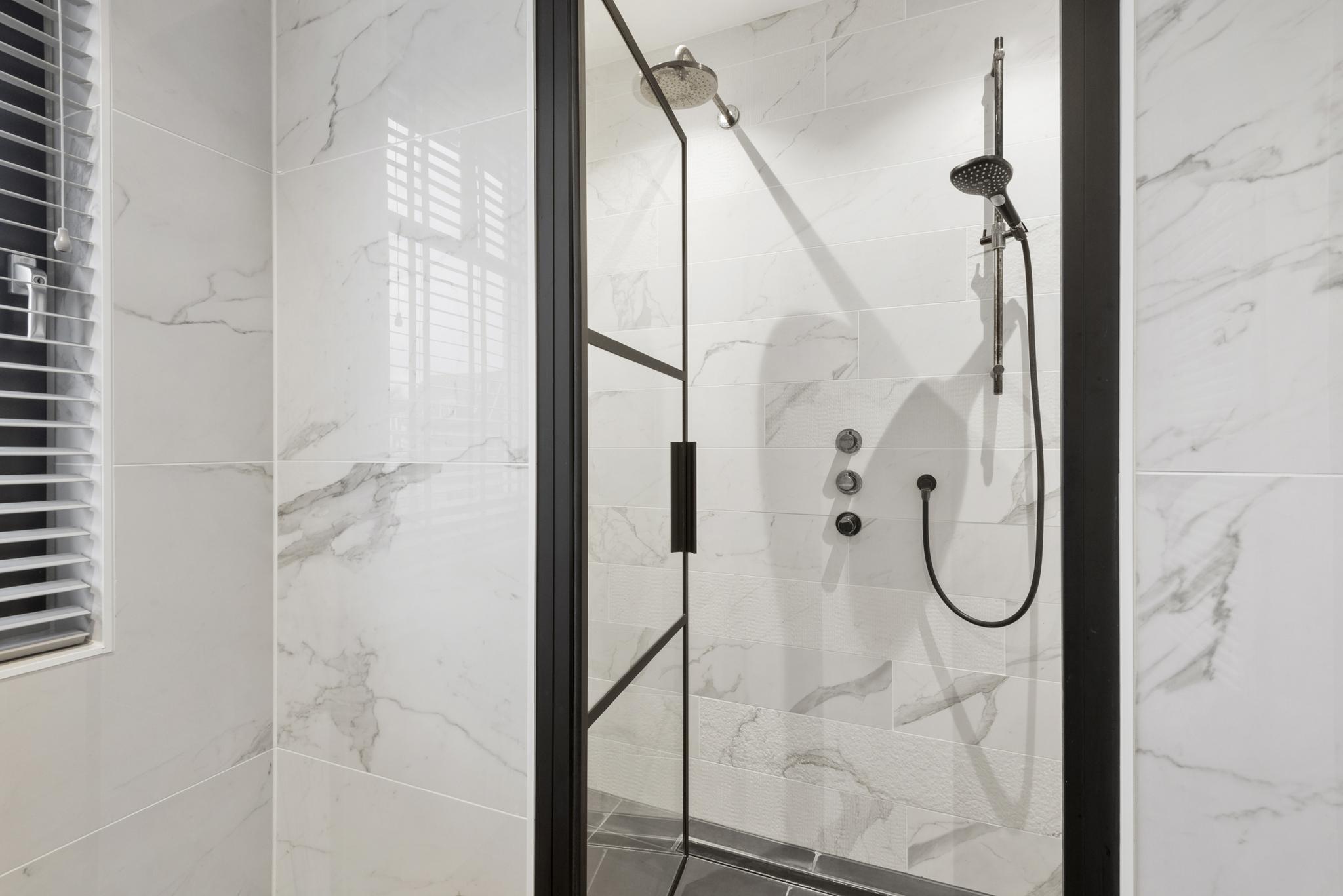 The first floor houses three spacious bedrooms, all with large windows and/or French balconies, allowing plenty of natural light. The luxurious bathroom includes a double sink vanity and a spacious double shower. There is a separate toilet on the landing.