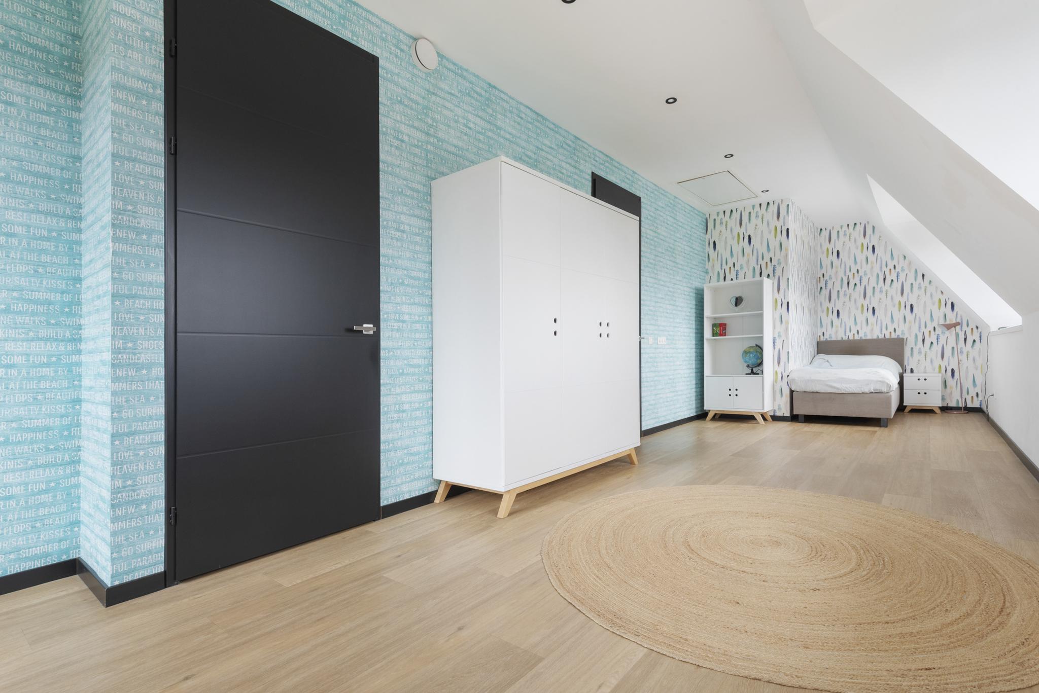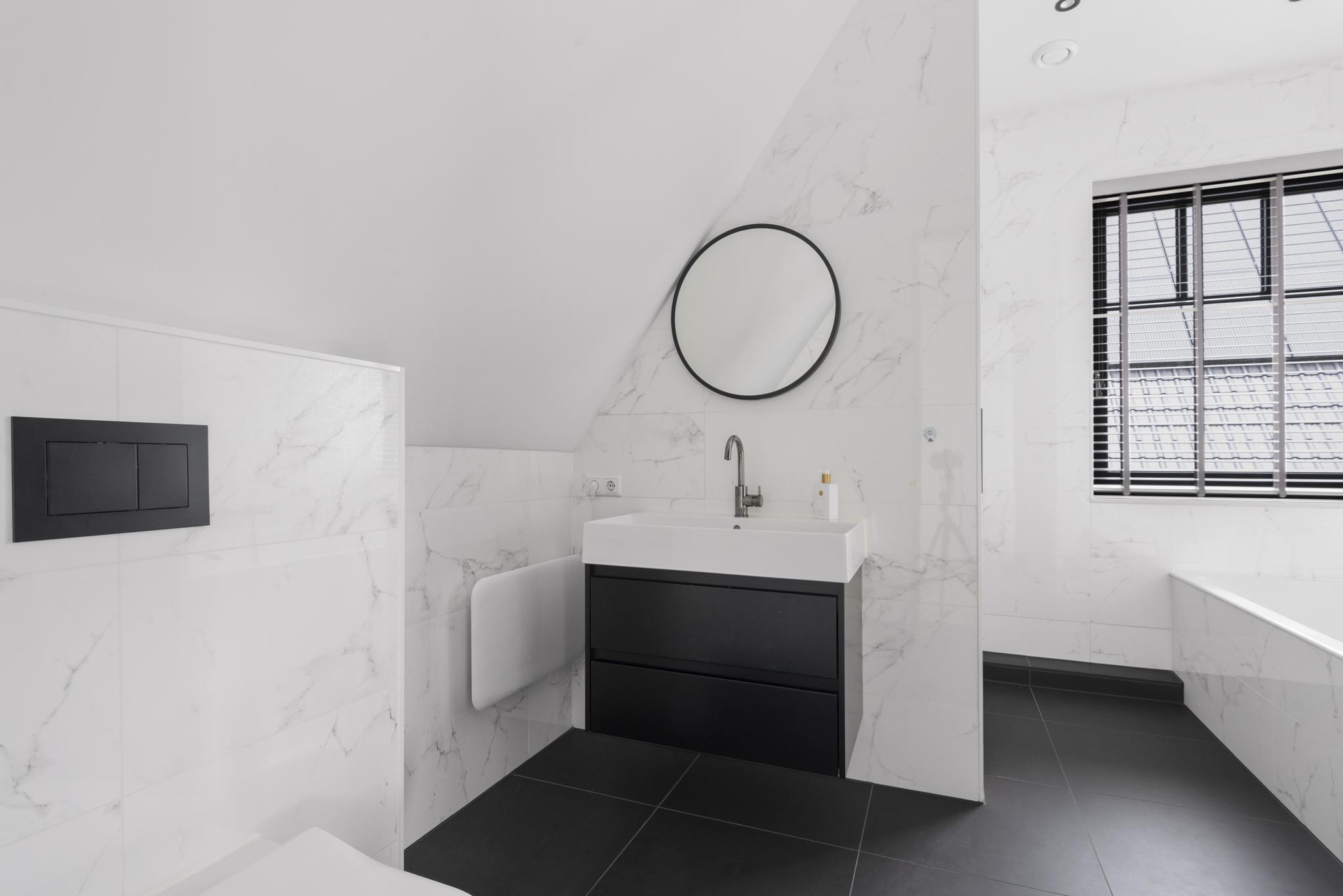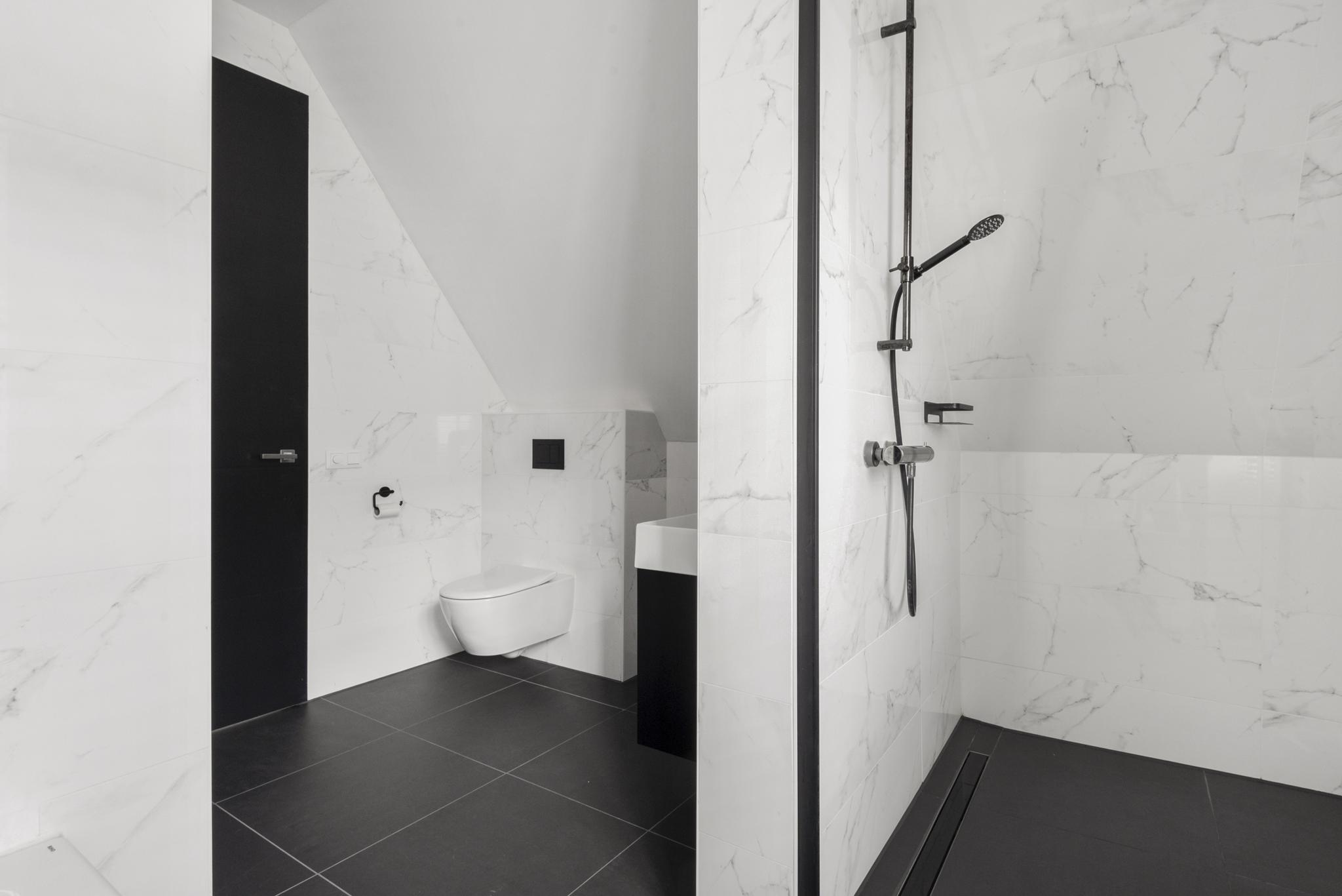 The second floor offers an additional large bedroom and a second bathroom with a vanity unit, bathtub and walk-in shower, providing extra comfort and privacy. There is also plenty of storage space in the attic and the floor includes a separate utility room with advanced installations such as a geothermal heat pump and a heat recovery unit for optimal indoor climate.