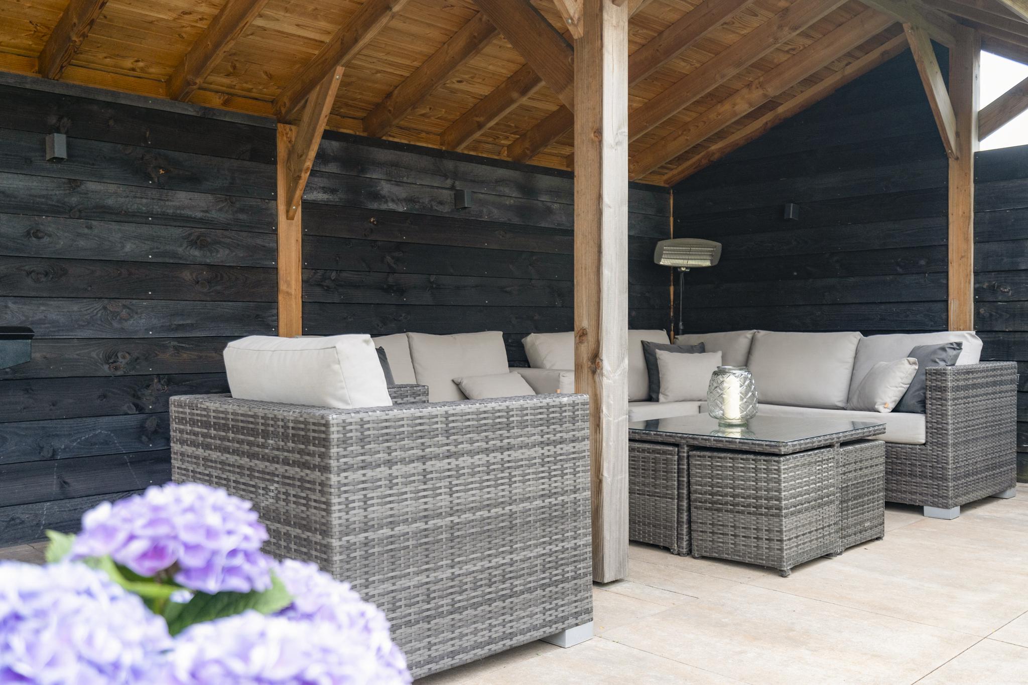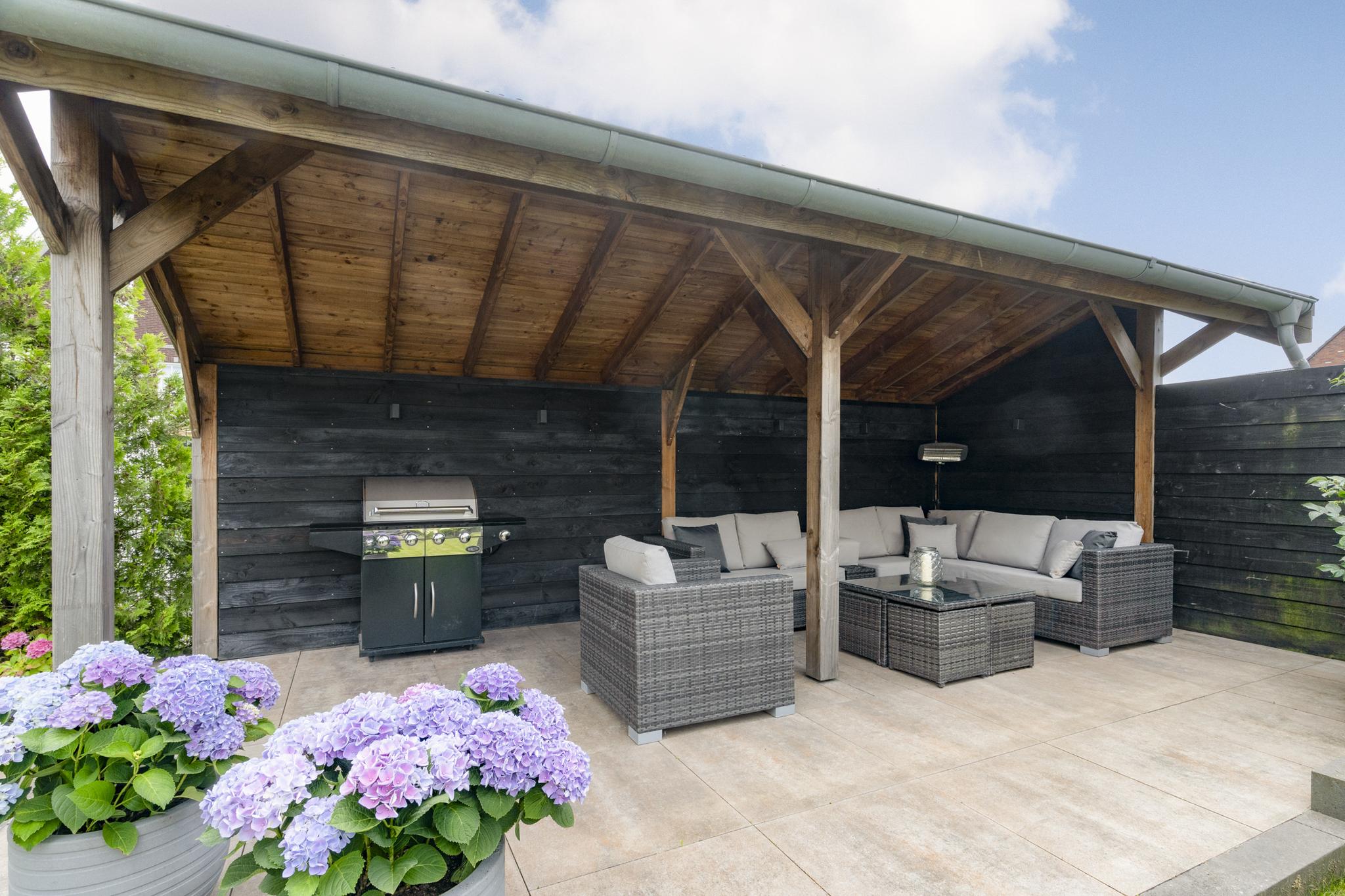 • Spacious garden with 22 m² canopy and heater.
