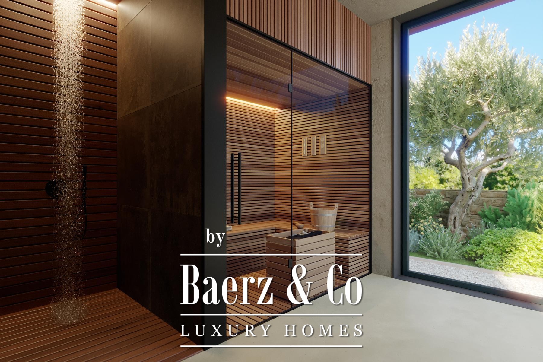 Situated on the edge of Bale, immersed in peaceful landscapes, the home unfolds across two floors. Upon entry, an open-plan living area reveals itself—kitchen, dining, and lounge defined by glass walls that blur the boundary between interior and the nature outside, filling the rooms with gentle daylight. The ground floor integrates a wellness zone with a Finnish sauna, along with a laundry and guest toilet, anchored by direct access to the landscaped garden.